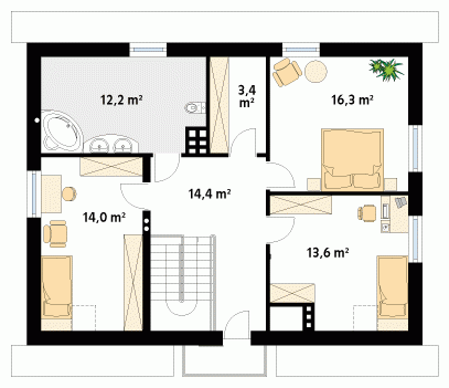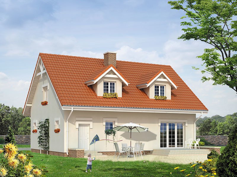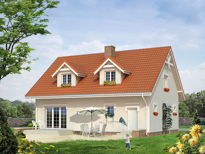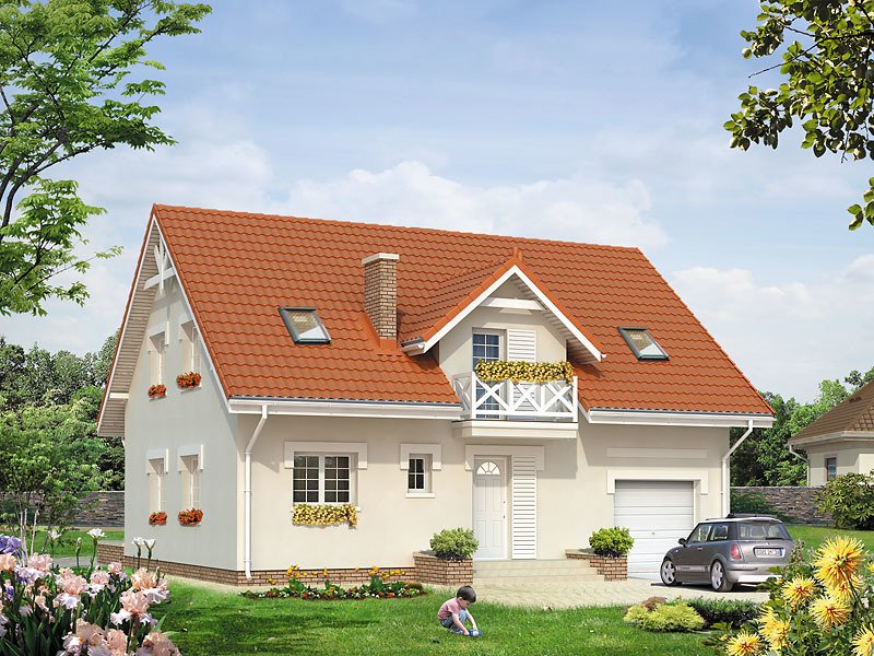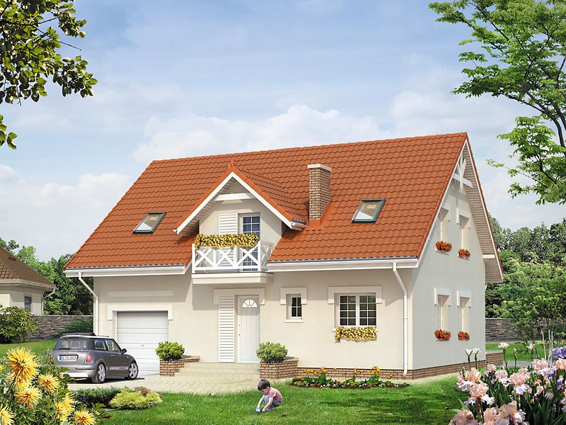 Dom jednorodzinny z poddaszem użytkowym dla 3 – 4-osobowej rodziny. Garaż wkomponowany w bryłę domu. Kotłownia na paliwo stałe ze składem opału. Na poddaszu znajdują się trzy sypialnie, łazienka oraz garderoba.