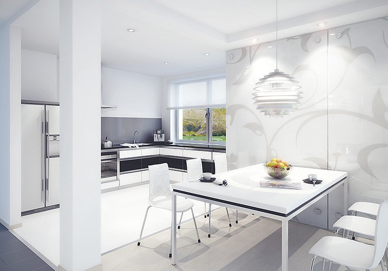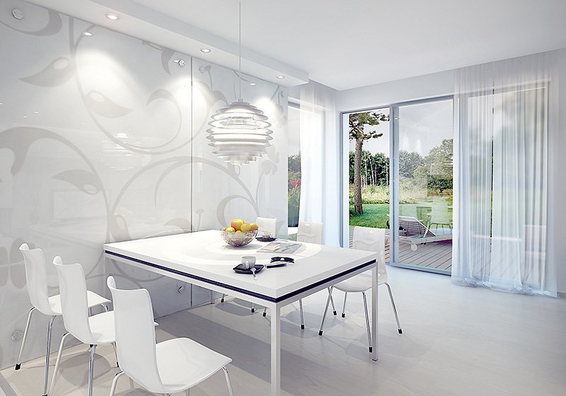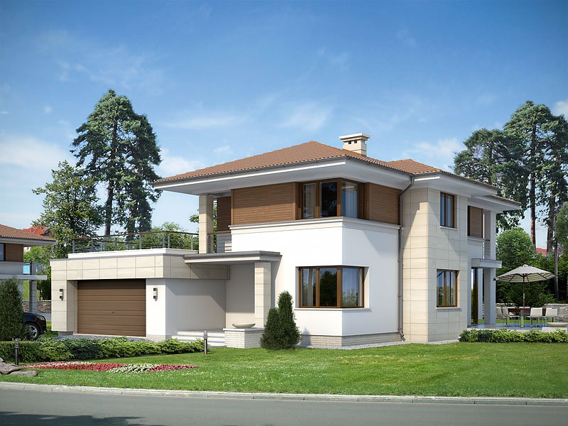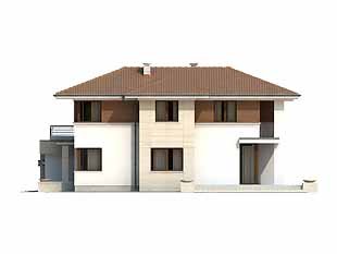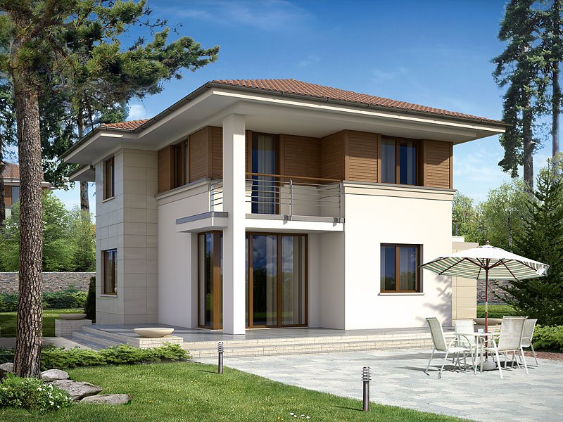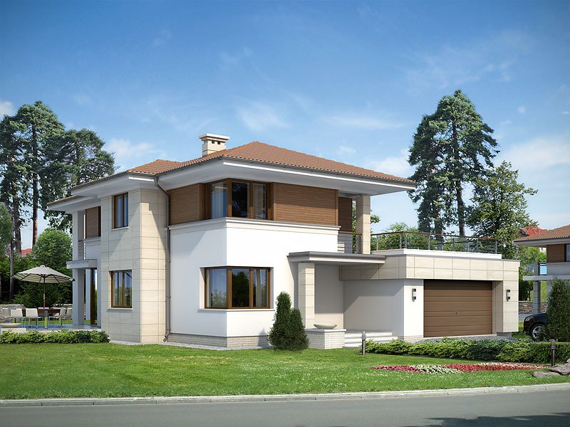 Projekt domu Cyprys 2 został zaprojektowany z myślą o rodzinie, która ceni sobie nowoczesną estetykę oraz prostotę. Połączenie kuchni, jadalni oraz pokoju dziennego jest doskonałym pomysłem dla tych, którzy cenią sobie wspólnie spędzony czas podczas codziennych zajęć. Okna znajdujące się od strony tarasu, nie tylko imponują swoją wielkością, ale także rozświetlają cały salon. Wygodnym rozwiązaniem jest tutaj nie tylko łazienka na każdym z pięter, ale również pomieszczenie gospodarcze przylegające do garażu. Dodatkowym atutem projektu jest również dwustanowiskowy garaż, oraz taras nad garażem dostępny z sypialni.