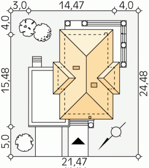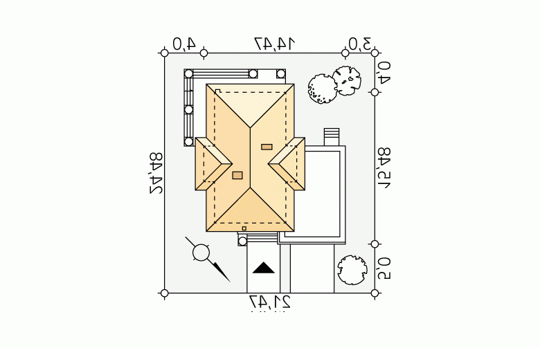 Ściany: 2-warstwowe - beton komórkowy + styropian, Stropy: płyta żelbetowa, Dach: dachówka ceramiczna, kąt nachylenia 21°