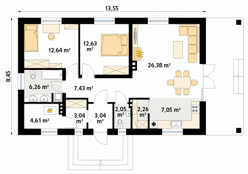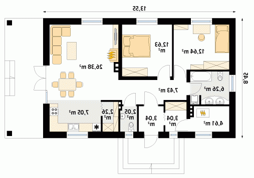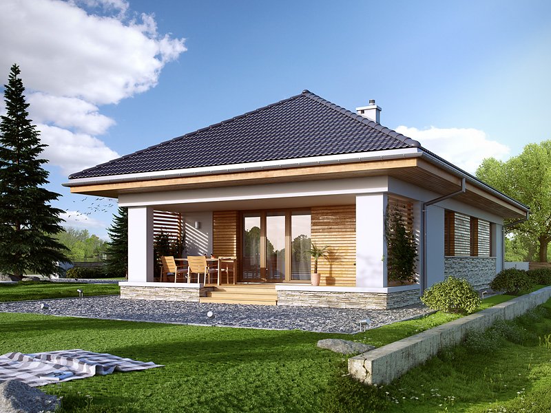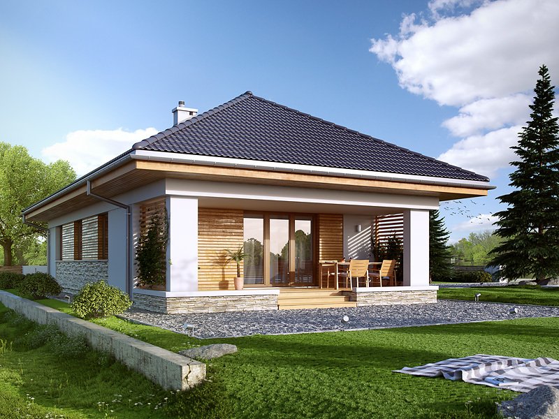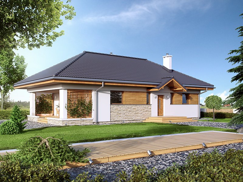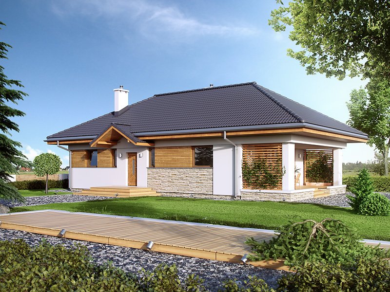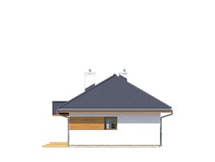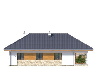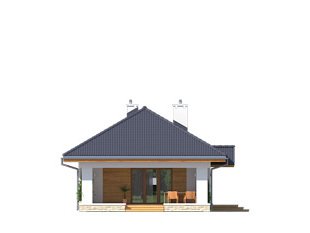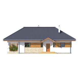 Projekt jest dedykowany zwolennikom technologii murowanej. W domu zaprojektowano 2 sypialnie i 1 łazienkę. Kuchnia otwarta na część dzienną zapewni stały kontakt z resztą domowników podczas codziennych czynności. Program funkcjonalny domu został wzbogacony o spiżarnię i WC. Prezentowany projekt idealnie nadaje się na wąską lub płytką działkę. Dom z pewnością spodoba się inwestorom gustującym w nowoczesnym stylu. Jest to projekt energooszczędny, zaprojektowany z myślą o inwestorach, którzy szczególną wagę poświęcają kosztom eksploatacji i racjonalnego wykorzystywania energii.