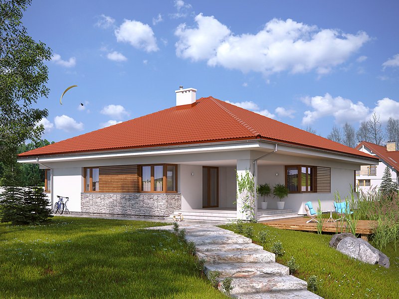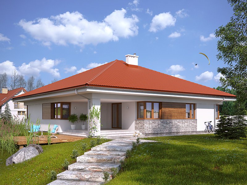 Ściany: 2-warstwowe - pustak ceramiczny + styropian Termo Organika, Stropy: żelbetowe, wylewane, Dach: dachówka ceramiczna, kąt nachylenia 25°