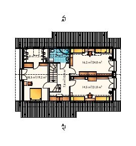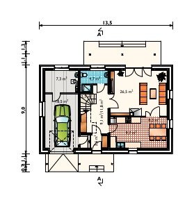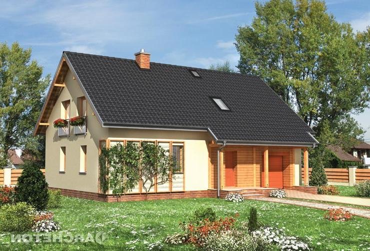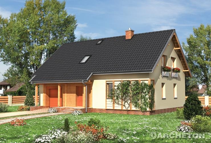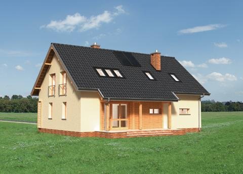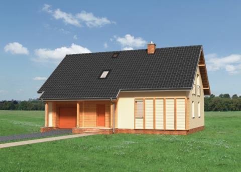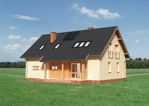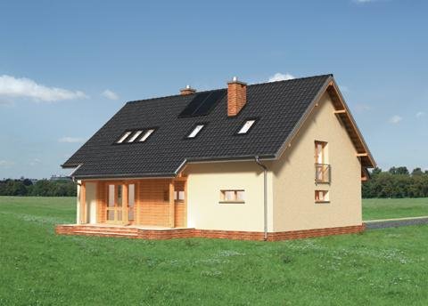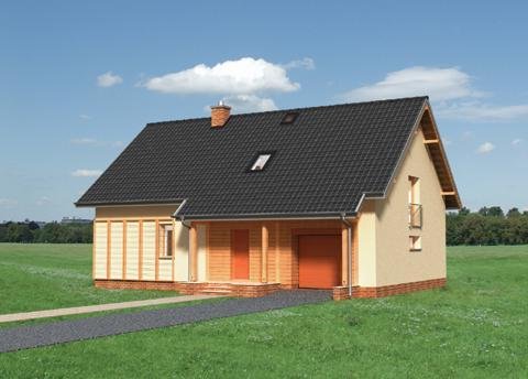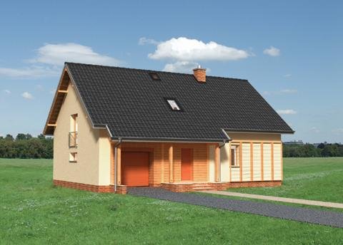 Dom energooszczędny - parterowy, z użytkowym poddaszem, niepodpiwniczony, z garażem. Budynek jest parterowy z użytkowym poddaszem, niepodpiwniczony. Na parterze znajduje się sień, kotłownia, w.c., hol, kuchnia z jadalnią, pokój dzienny oraz garaż. Na poddaszu umieszczono przedpokój, 3 wygodne pokoje sypialne(w tym jeden z garderobą)oraz łazienkę. Realizacja “zielonego” sposobu na komfortowe mieszkanie dla sześcioosobowej rodziny i garaż – wszystko to zamknięte w nieskomplikowanym prostokątnym rzucie parteru i poddasza Delty Eko. W tym projekcie ściany są trzykrotnie cieplejsze niż wymaga tego obowiązująca aktualna norma. Za ogrzewanie odpowiada gazowy kocioł kondensacyjny o wysokiej sprawności. Alternatywnie można zaprojektować pompę ciepła. W projekcie architektury zaproponowano miejsce montażu kolektorów słonecznych Viessmann. Po wykonaniu projektu ich instalacji (dostosowanego do warunków nasłonecznienia w konkretnej lokalizacji) będą one mogły współpracować z instalacją centralnej wody użytkowej. Na południowej połaci dachu, w której dla zwiększenia zysków ciepła we wnętrzu przewidziano również najwięcej okien dachowych. Oszczędności w zużyciu energii przynosi instalacja wentylacji mechanicznej, która odzyskuje ciepło ze zużytego powietrza. Zaprojektowane grzejniki są niskotemperaturowe, przeszklenia okien niskoemisyjne, a profile stolarki ocieplane, nie wyłączając drzwi garażowych. Dzięki wprowadzeniu drewnianych słupków i deskowania podkreślającego podcienie: wejściowy i ogrodowy, udało się osiągnąć malowniczy charakter domu mimo jego energooszczędnej, prostej bryły.