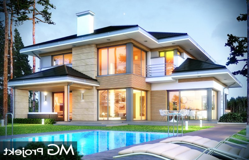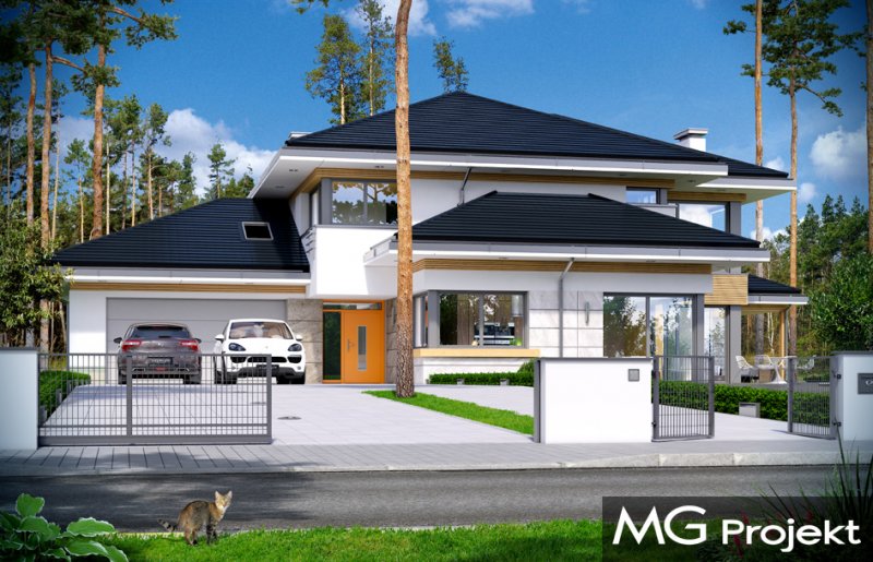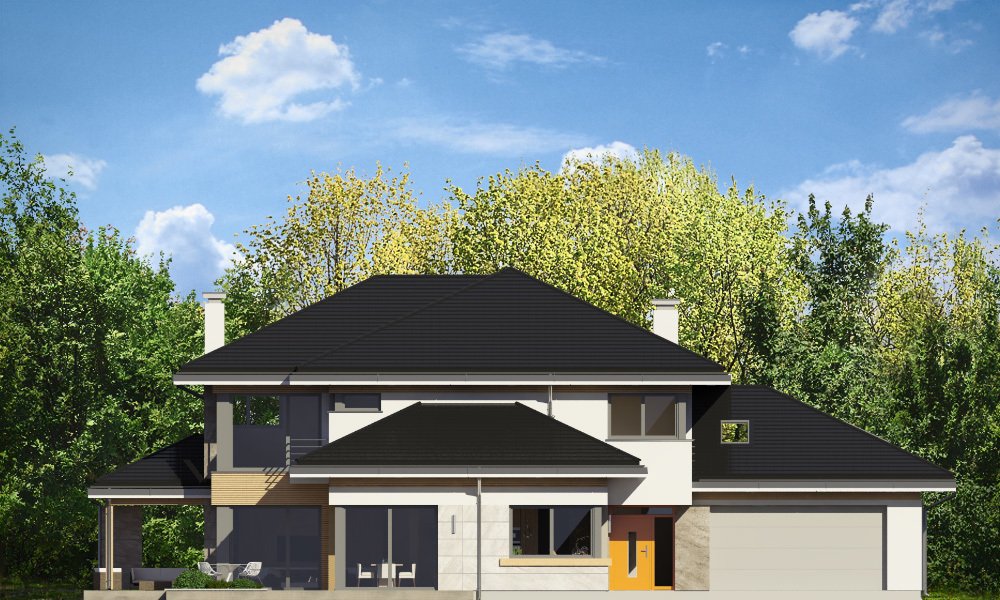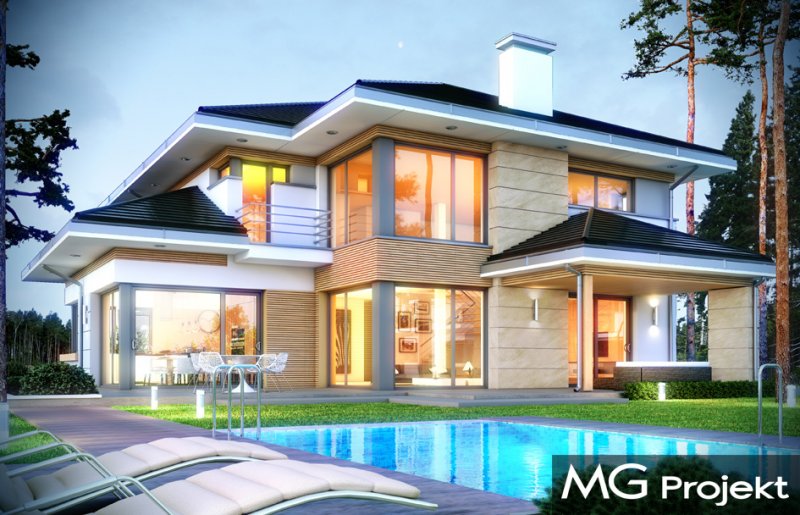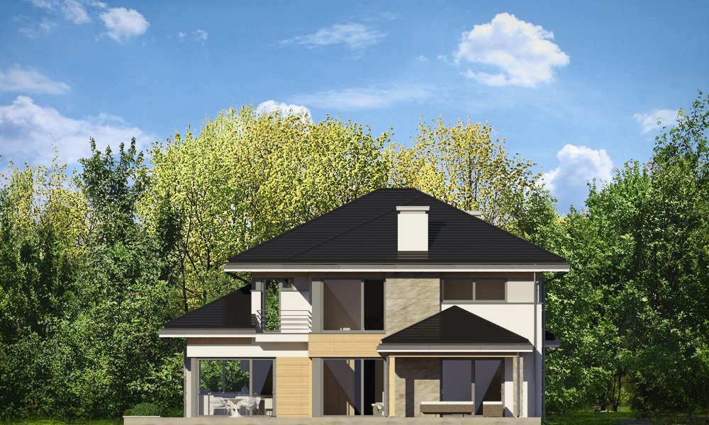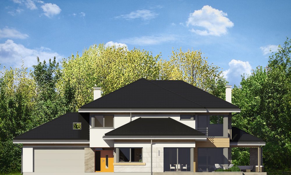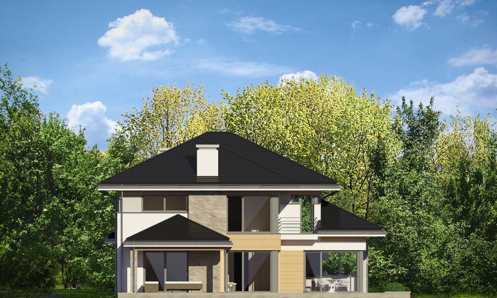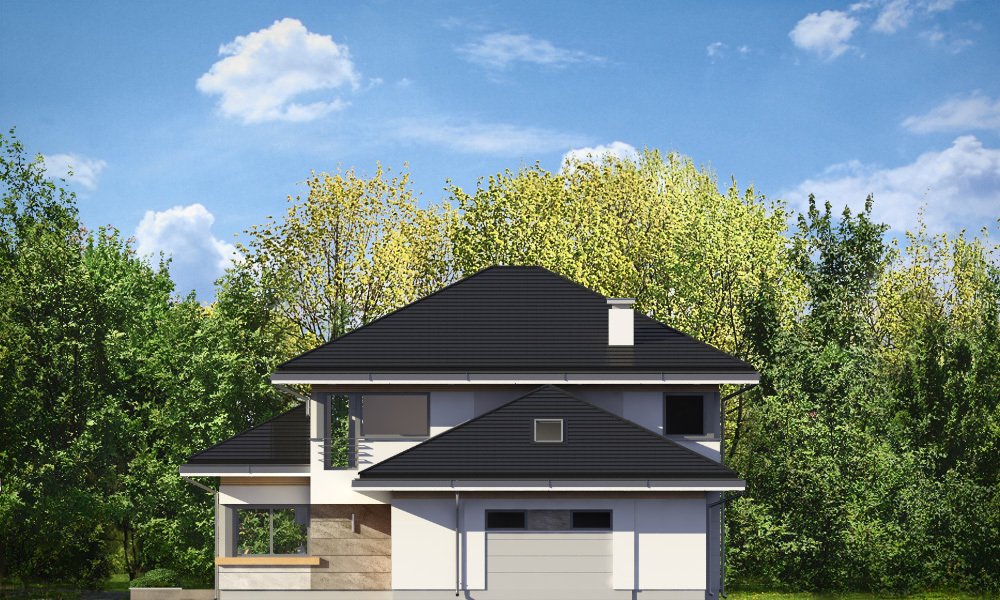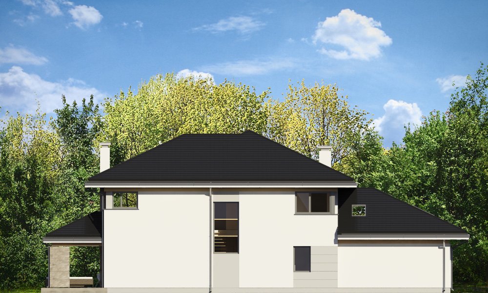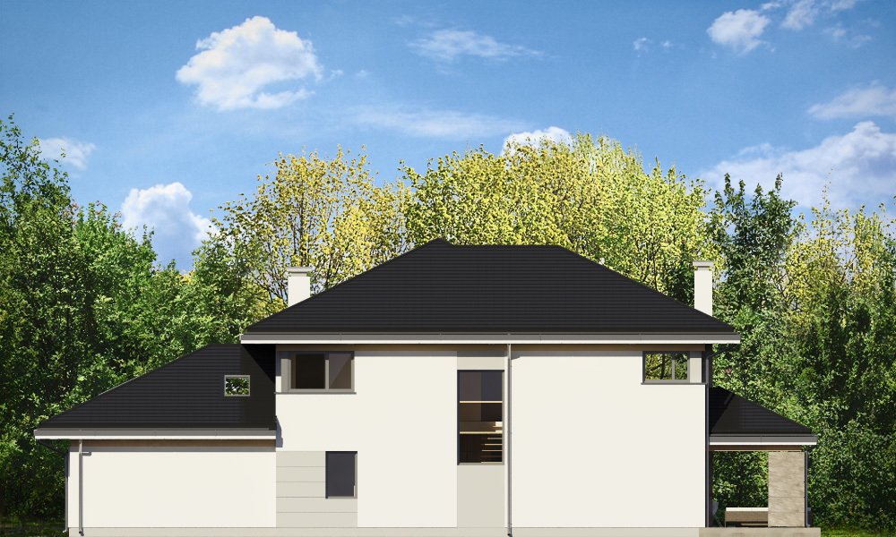 Dom z widokiem 2 jest wariantową pomniejszoną wersją cieszącego się popularnością projektu „Dom z widokiem”. Dom został nieco zmniejszony w stosunku do swojego pierwowzoru. Powierzchnia została zmniejszona o niecałe 20 %. Podobnie koszty realizacji - również udało się ograniczyć o jedną piątą budżetu. Dom to nowoczesna miejska willa, o dynamicznej ciekawej architekturze, otwarta na ogród, z mnóstwem atrakcyjnych detali i ciekawą bryłą. Dobrze zestawione ze sobą materiały, detale i kolorystyka tworzą niepowtarzalne wrażenie komfortu, wygody i niezależności. Program użytkowy został nieco okrojony w stosunku do bazowego projektu, ale dom nic nie stracił na swojej funkcjonalności. Jego wnętrze nadal jest pełne przestrzeni. Wchodząc do wnętrza domu czujemy luz i rozkoszujemy się niczym nie ograniczonym komfortem. Na parterze zaprojektowano otwartą część dzienną, z salonem z pustką i otwarciem na antresolę na piętrze, z jadalnią, holem z reprezentacyjnymi schodami, oraz dużą kuchnią z wyspą. Wnętrze przedziela prostopadłościan spiżarni i zabudowy kuchennej. Do domu wchodzimy przez otwarty, przeszklony wiatrołap z szatnią. Na parterze dodatkowo mieści się kotłownia, wc, oraz garaż z pomieszczeniem magazynowo-gospodarczym. Na piętrze zaprojektowano trzy sypialnie, z oddzielnym apartamentem rodziców z własną łazienką i garderobą, ogólnodostępną łazienkę, oraz strych - pralnię/suszarnię, lub po prostu magazyn, albo dodatkowy pokój. Dom jest energooszczędny - zastosowano w nim bardzo dobre ocieplenia i instalacje. Łatwo można projekt dostosować do standardu NF40. Budynek ma zwartą bryłę. Jest nieco tańszy w realizacji od projektu bazowego, czyli Domu z widokiem 1. Zapraszamy !