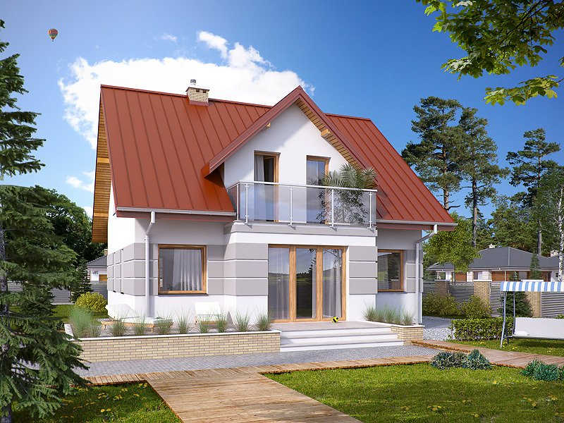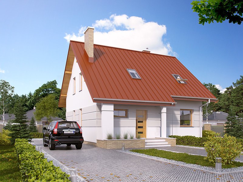 Ściany: 2-warstwowe - pustak ceramiczny + styropian, Stropy: żelbetowe, wylewane, Dach: blacha na rąbek stojący Classic Ruukki, kąt nachylenia 42°