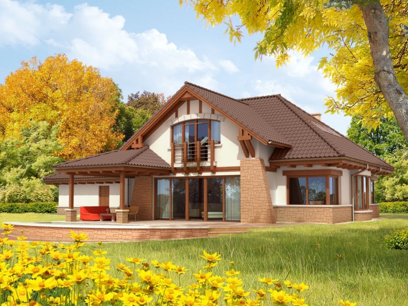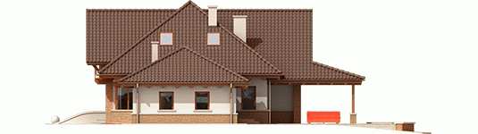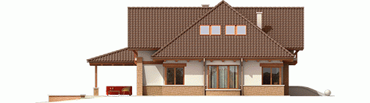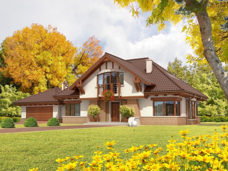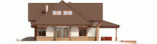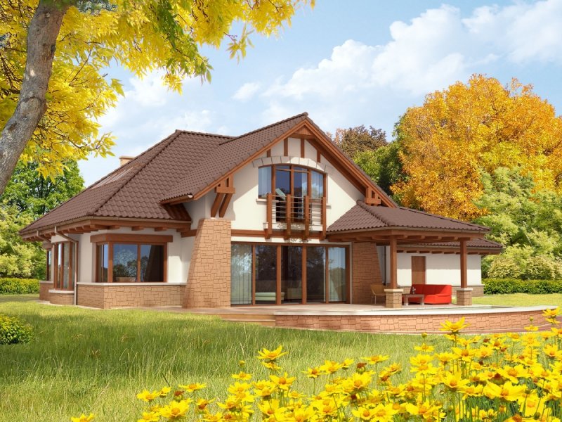 Edek G2 Mocca to dom, którego niepowtarzalny urok docenią wielbiciele tradycyjnej architektury i wysokiego komfortu użytkowego. Funkcjonalne wnętrza zostały otulone szykowną elewacją – orzechowe drewno przełamuje chłodny odcień tynku, natomiast czekoladowy dach pięknie komponuje się z surową urodą kamienia. Wyraźny podział stref funkcjonalnych sprzyja wyciszeniu i gwarantuje codzienną wygodę. Serce domu stanowi przestronny salon z nastrojowym kominkiem, który płynnie łączy się z zadaszonym tarasem, poszerzając w ten sposób przestrzeń domu o atrakcyjną strefę wypoczynkowa na świeżym powietrzu.