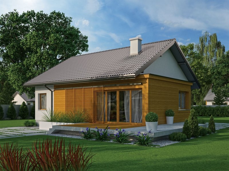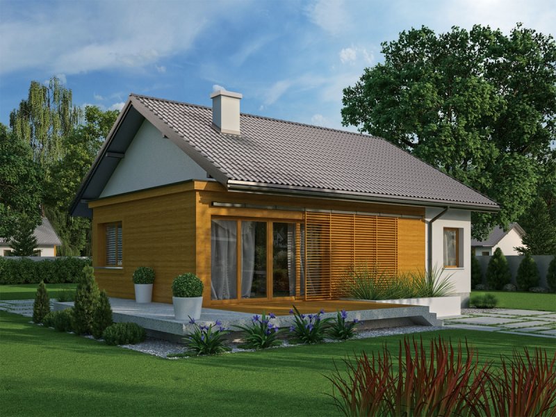 - Elewacje: tynk cienkowarstwowy mineralny i okładzina drewniana
