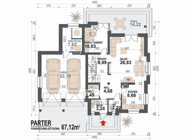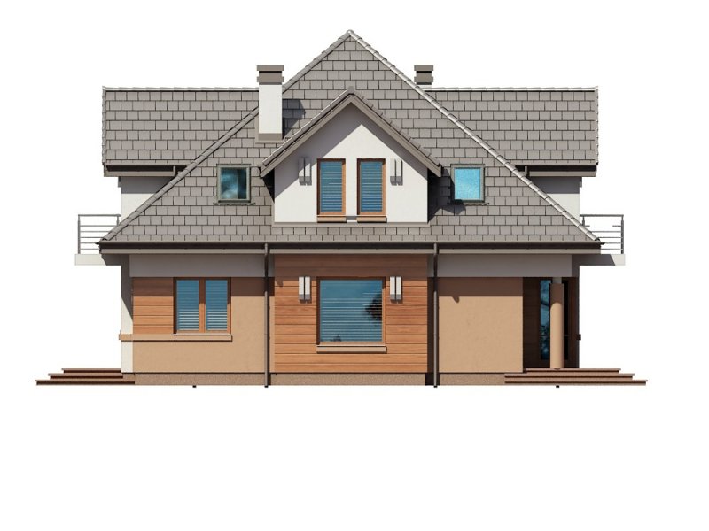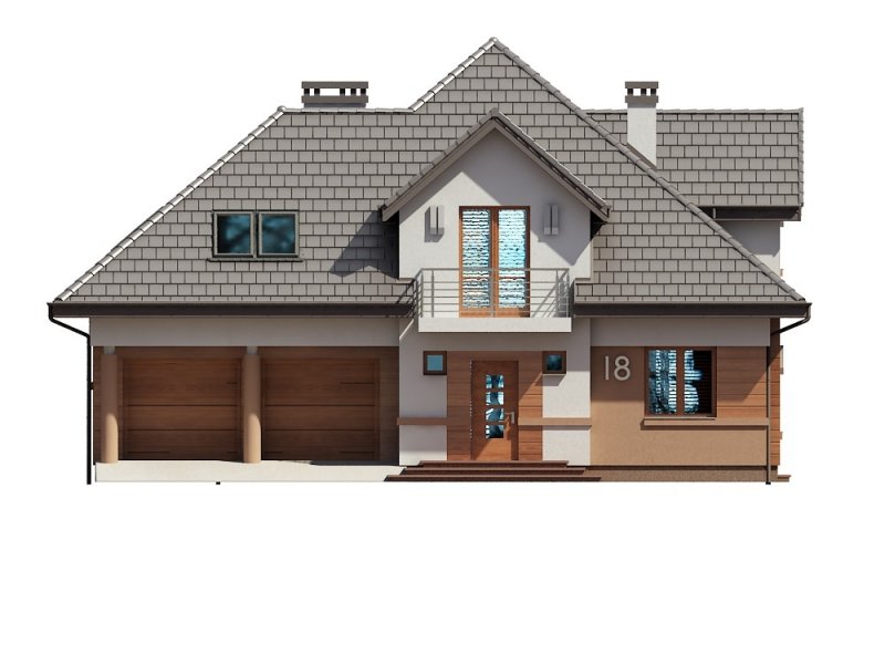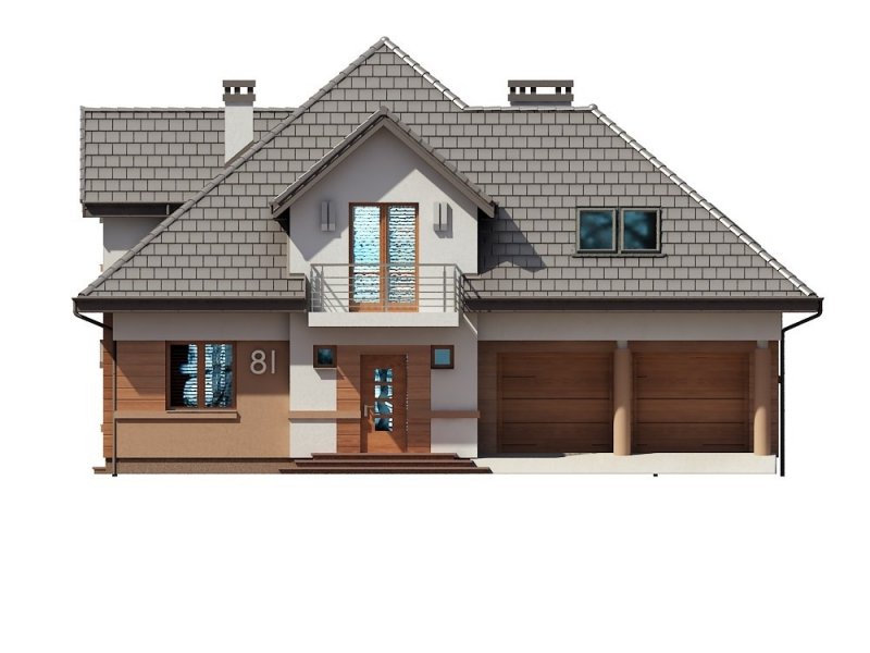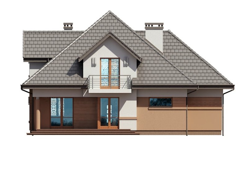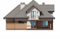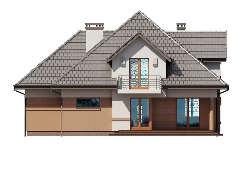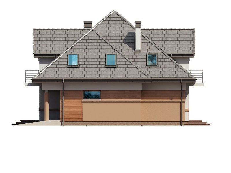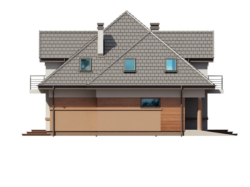 Dom ten to ciekawa propozycja projektu domu parterowego z użytkowym poddaszem przeznaczonego dla 4-7 osobowej rodziny. Budynek posiada reprezentacyjne wejście podkreślone lukarną z balkonem . Na parterze w strefie dziennej budynku poprzez otwarcie kuchni z aneksem jadalnym oraz klatki schodowej i hallu na salon uzyskano jedną wielką przestrzeń o przenikających się funkcjach użytkowych. Program parteru uzupełniają: pokój (gabinet), ogólnodostępne wc, garderoba oraz dwustanowiskowy garaż z kotłownią (pomieszczeniem gospodarczym). Strefa nocna sytuowana na poddaszu użytkowym budynku składa się z 3 sypialni oraz ogólnodostępnej łazienki . Obszerna sypialnia rodziców połączona z gabinetem posiada dodatkową łazienkę i garderobę, z którymi stanowi oddzielną, intymną strefę. Duży taras oraz dwa balkony na poddaszu przynależne do sypialni umożliwiają doskonały kontakt z przyrodą przydomową co jest szczególnie ważną zaletą dla miłośników mieszkania w otoczeniu natury.