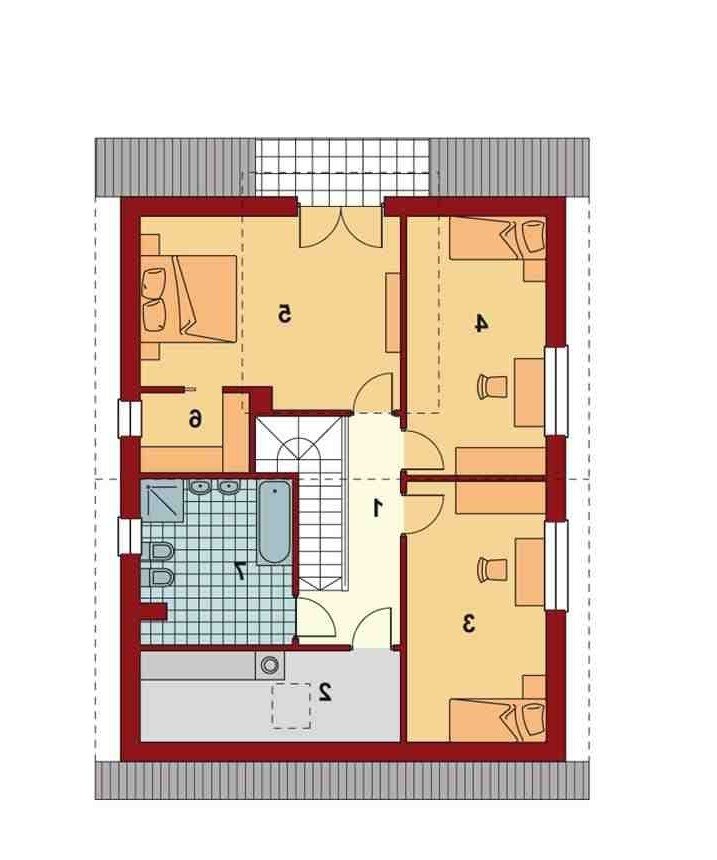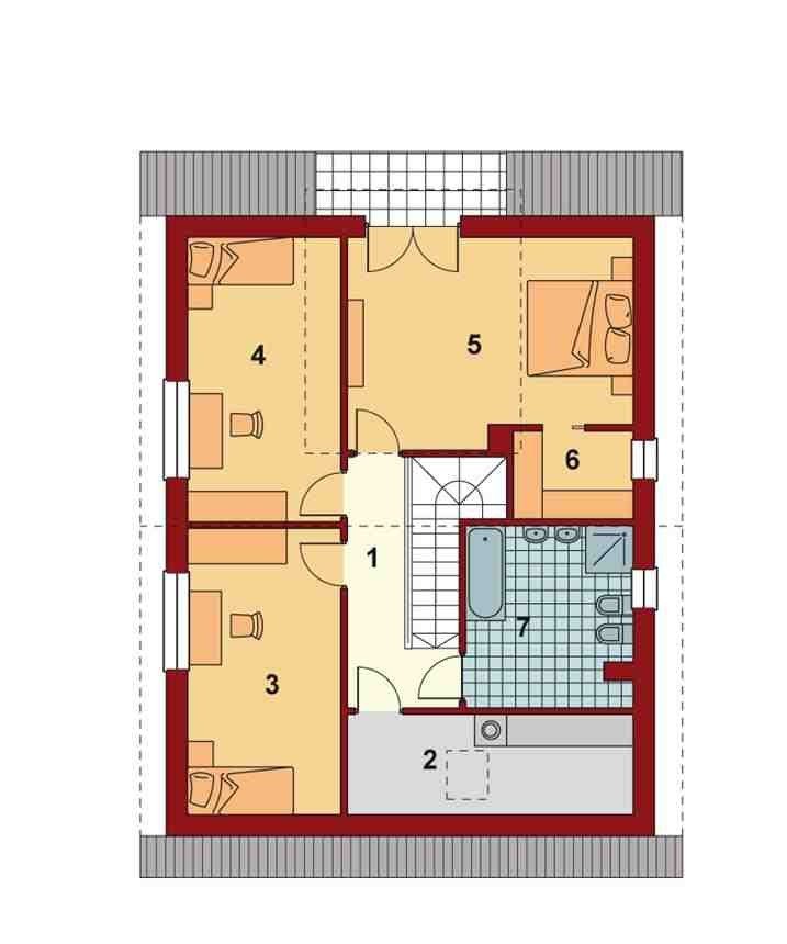 Część nocną na poddaszu tworzą: duża sypialnia z garderobą, dwa pokoje, hall, wygodna łazienka i pomieszczenie pralni/suszarni. Wszystkie sypialnie i łazienka są doświetlone za pomocą okien w ścianach szczytowych. Największa sypialnia z własnym balkonem usytuowana jest od strony ogrodu.