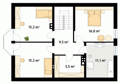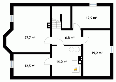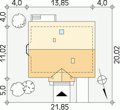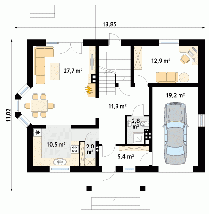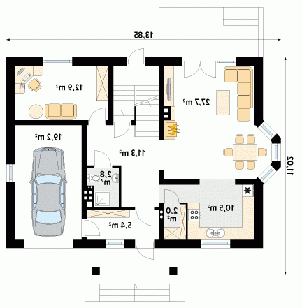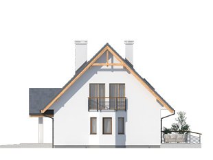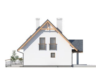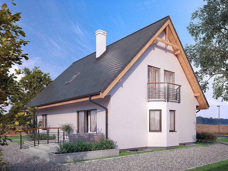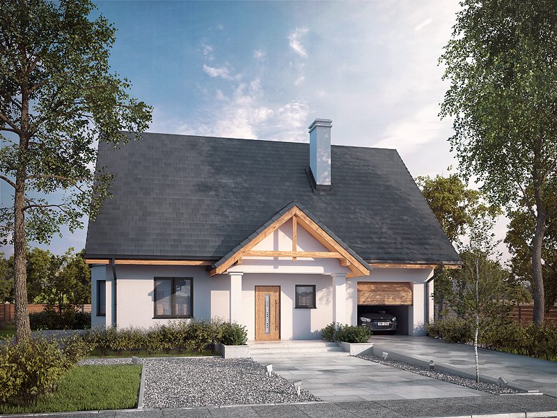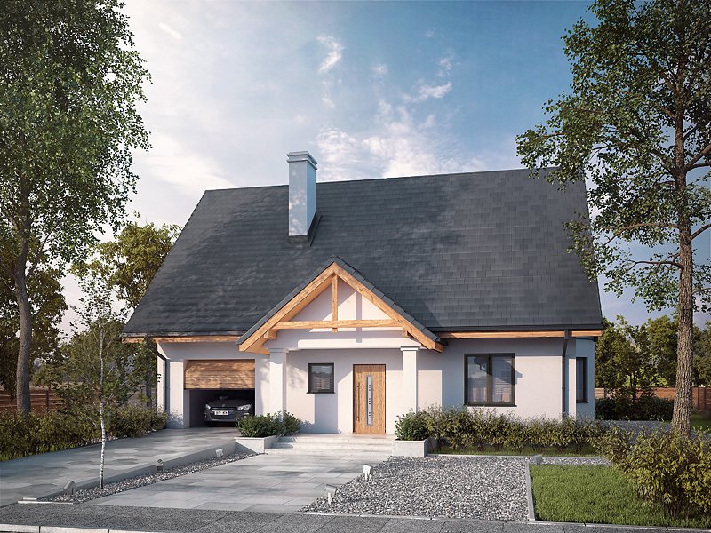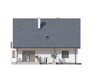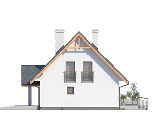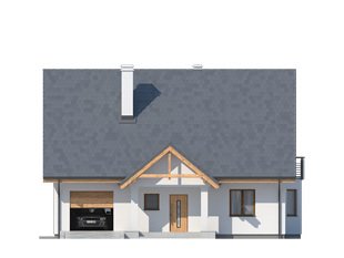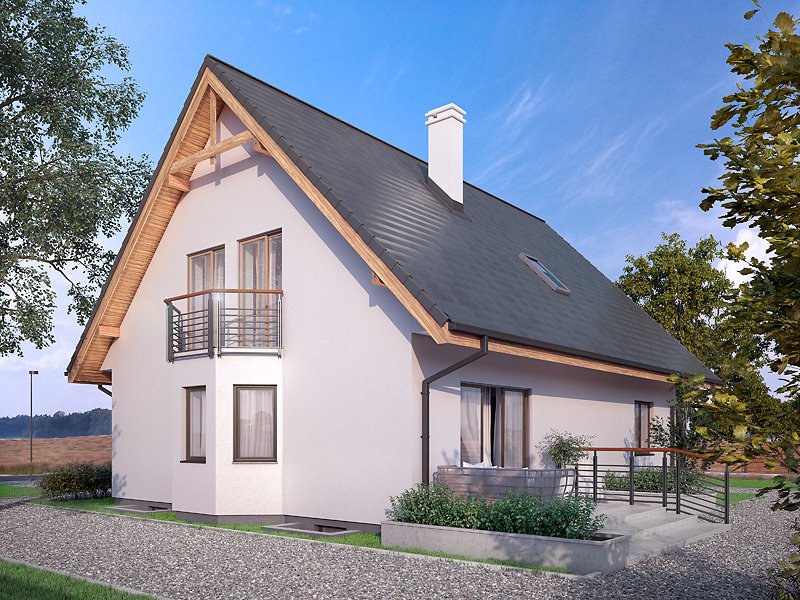 Jednorodzinny budynek mieszkalny, parterowy z użytkowym poddaszem, podpiwniczony, przeznaczony dla 4-osobowej rodziny. Jest to dom o prostej, klasycznej bryle, przykryty dwuspadowym dachem. Podział kondygnacji pociąga za sobą wyraźny podział stref życia – na część dzienną, nocną i gospodarczą.