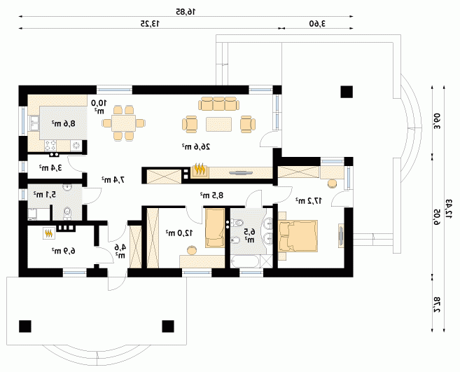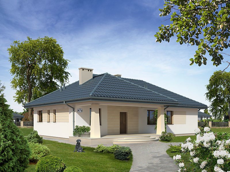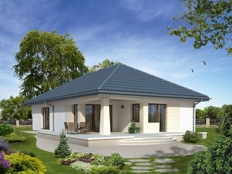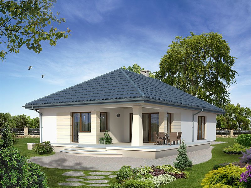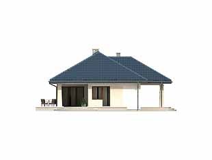 Parterowy budynek mieszkalny przeznaczony dla 3 osób. Na parterze, prócz części dziennej i sypialni, została zaprojektowana spiżarnia, spora kotłownia oraz wc z pralnią. Domek ma duże tarasy z zadaszeniem, umożliwiające korzystanie z nich nawet w kiepską pogodę.