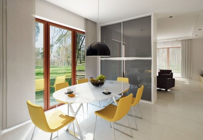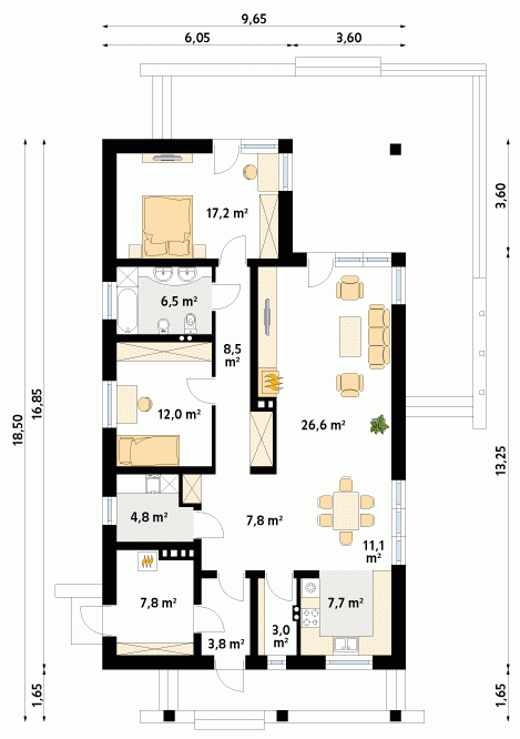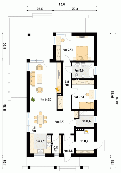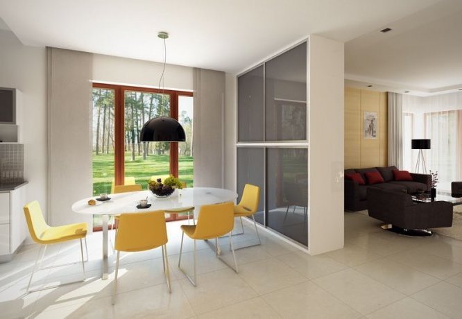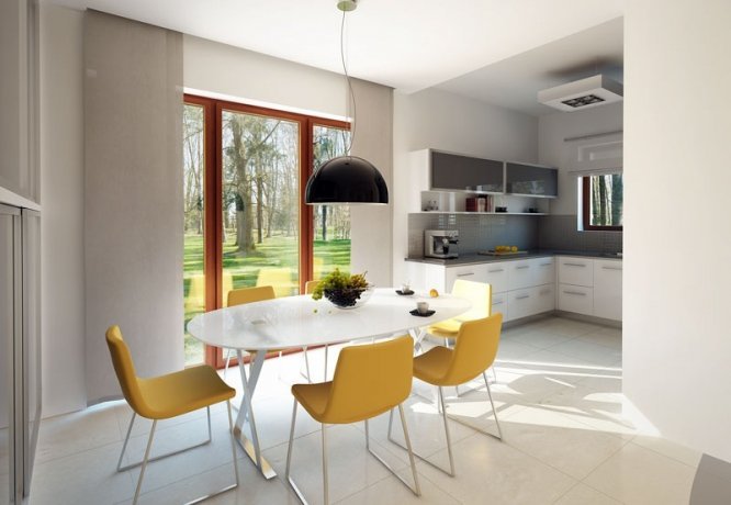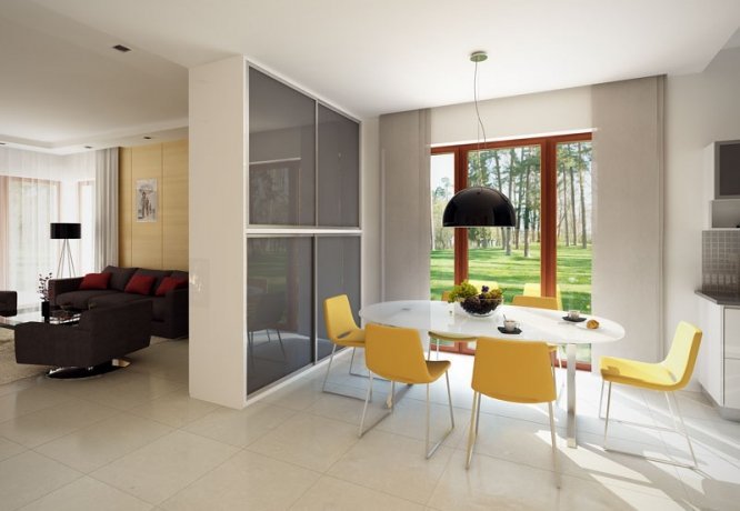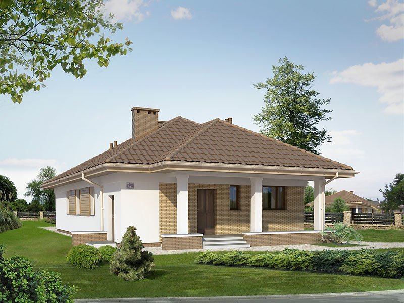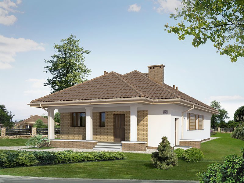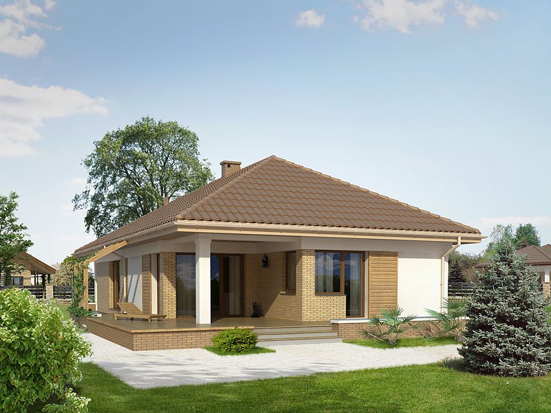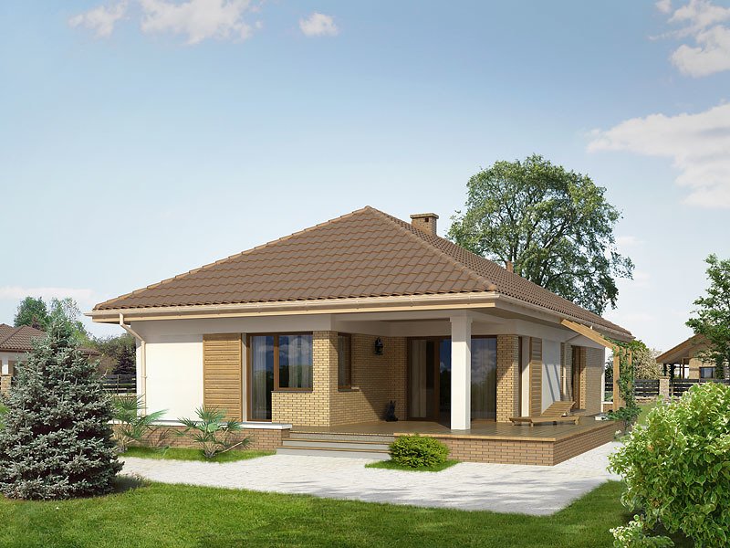 Budynek mieszkalny, jednorodzinny, parterowy przeznaczony dla 3-osobowej rodziny. Na parterze zaprojektowano dwie sypialnie, dwie łazienki, kotłownię, spiżarnię, kuchnię oraz pokój dzienny z jadalnią. Z pokoju dziennego mamy wyjście na przestronny, częściowo zadaszony taras.