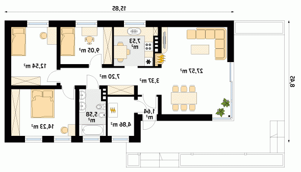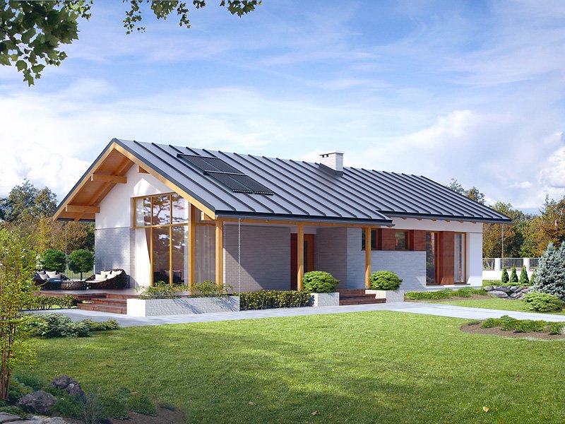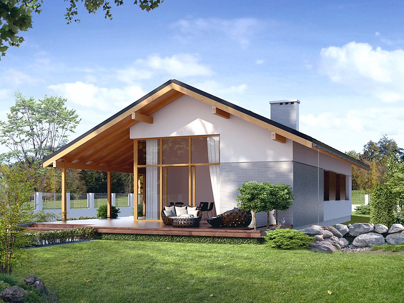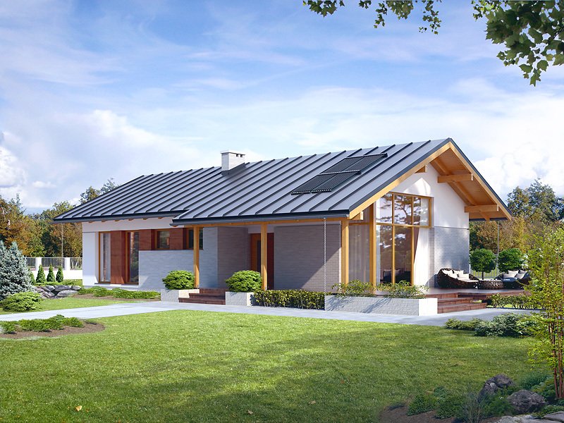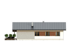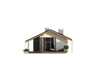 Parterowy dom jednorodzinny o czystym układzie funkcjonalnym z wyraźnym podziałem na część dzienną i nocną. Salon posiada wysoki sufit oraz duże przeszklenie z wyjściem na taras. Przeznaczony dla 4-osobowej rodziny.
