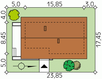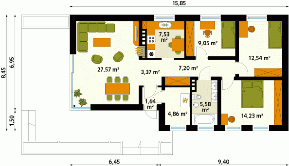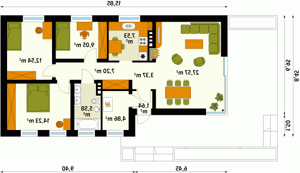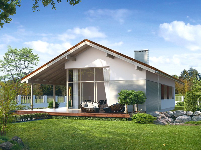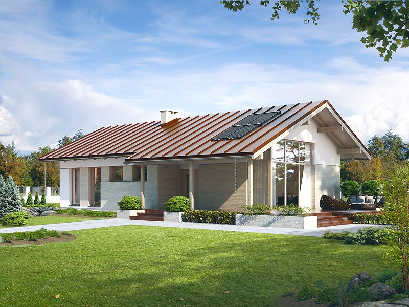 Parterowy dom jednorodzinny o czystym układzie funkcjonalnym z wyraźnym podziałem na część dzienną i nocną. Salon posiada wysoki sufit oraz duże przeszklenie z wyjściem na taras. Przeznaczony dla 4-osobowej rodziny. Dom zaprojektowany w technologii Multi-Comfort z zastosowaniem produktów marki Saint-Gobain łączy unikalne właściwości produktów z rozsądną ceną. Standard Multi-Comfort oznacza szereg korzyści, takich jak: niskie koszty ogrzewania, komfort termiczny, akustyczny, dobra jakość powierza, bezpieczeństwo przeciwpożarowe (klasa A1). Wszystko to jest możliwe za sprawą zastosowanych w projekcie sprawdzonych materiałów znanych i cenionych marek: Isover, Weber, Rigips, Glassolutions. Produkty Grupy Saint-Gobain są wytwarzane z naturalnych materiałów i posiadają deklaracje środowiskowe. W procesie eksploatacji budynki zaprojektowane w technologii Multi-Comfort posiadają niewielkie zapotrzebowanie na energię pierwotną. Więcej informacji o domach w standardzie Multi-Comfort: www.multi-comfort.pl