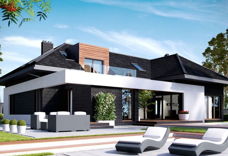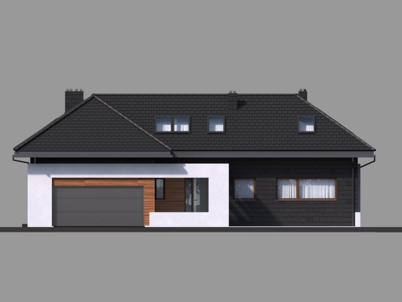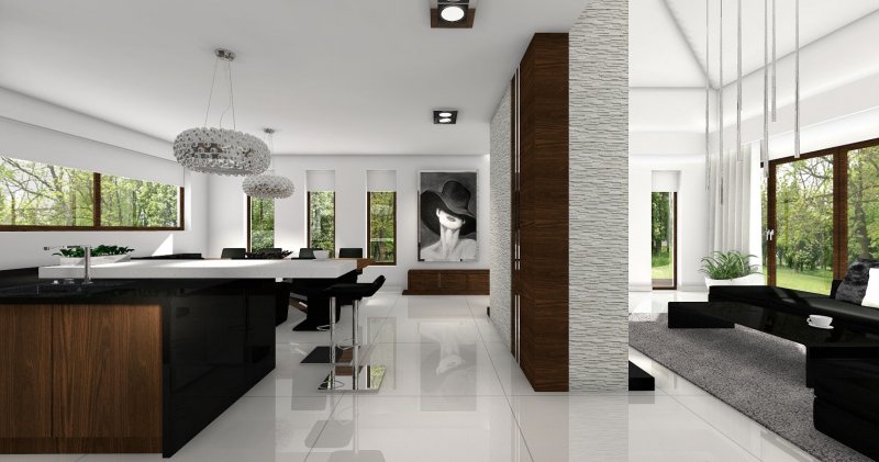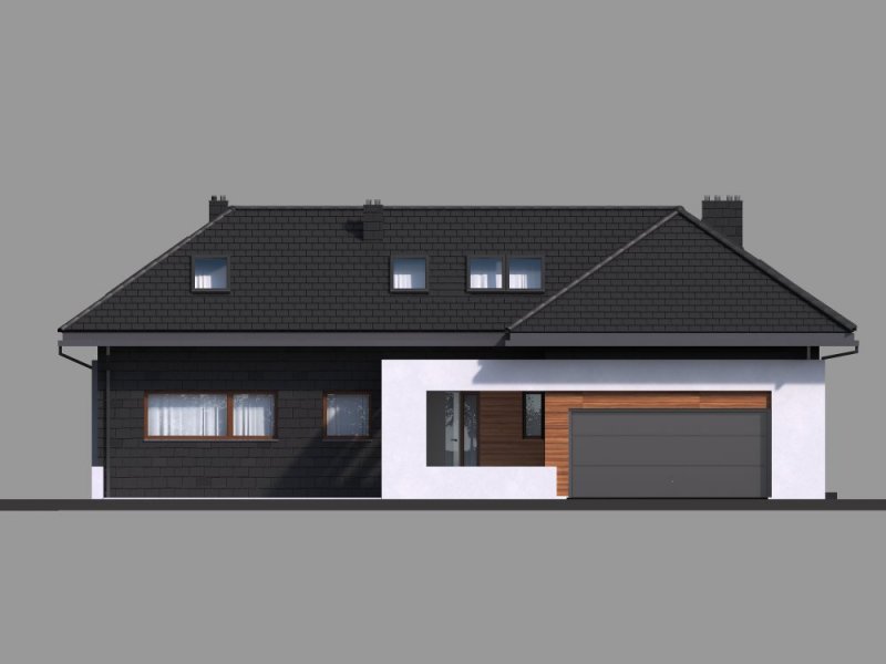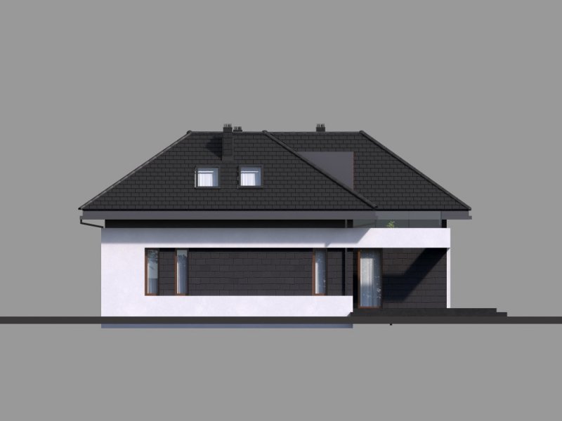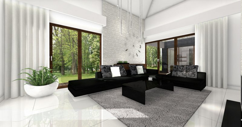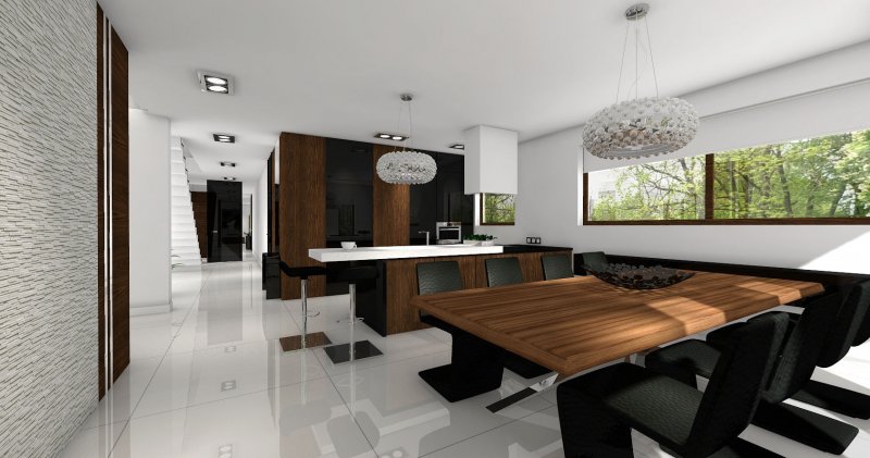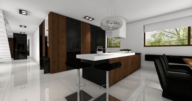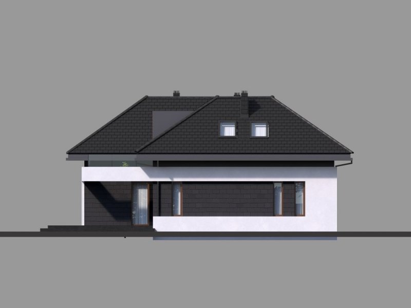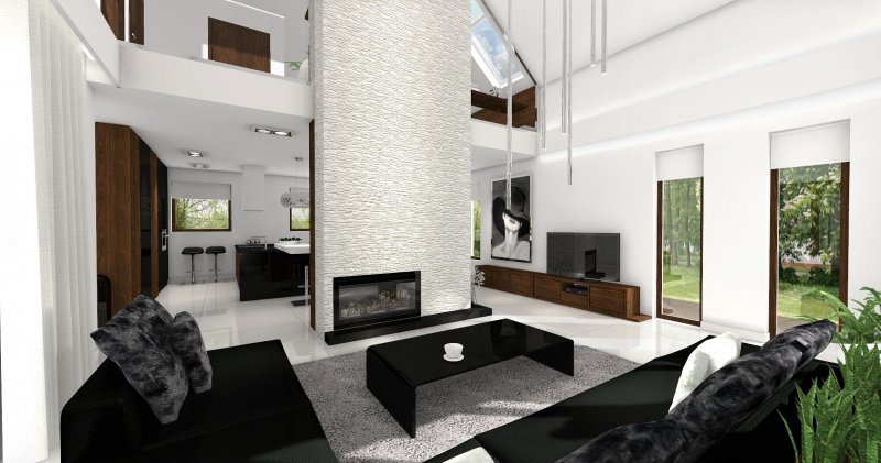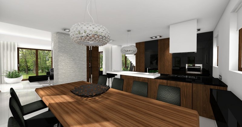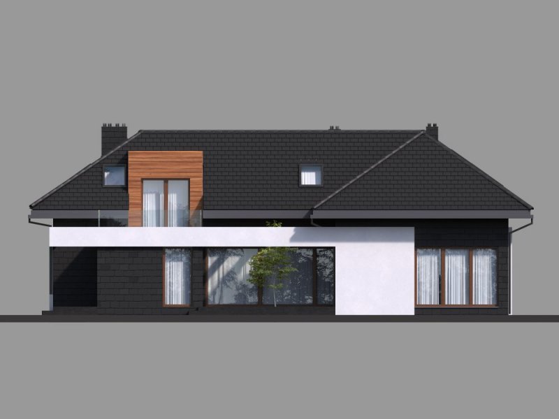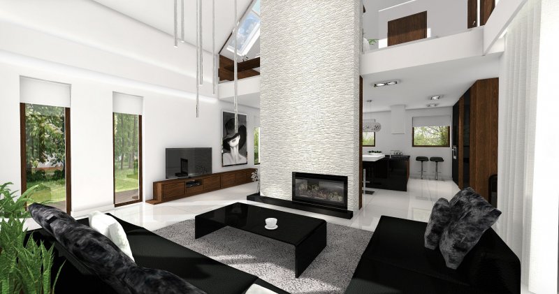 Taras, który jest wcięty w bryłę domu i sąsiaduje z salonem, a z drugiej strony z gabinetem, można wyposażyć w piękną podświetloną roślinność. Jest to niezwykle piękny i efektowny widok. Na parterze zaprojektowano salon, kuchnię, jadalnię, łazienkę, pokój gościnny, pomieszczenie gospodarcze oraz małą garderobę. Na piętrze z kolei znajdziemy trzy sypialnie, trzy garderoby oraz dwie łazienki.