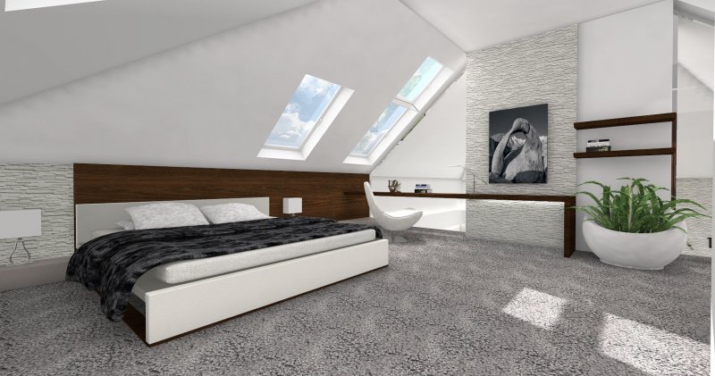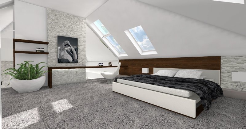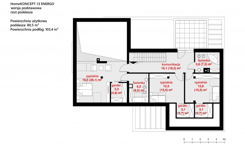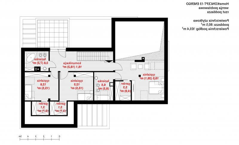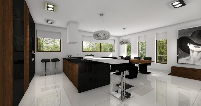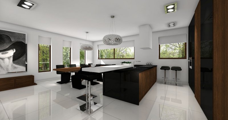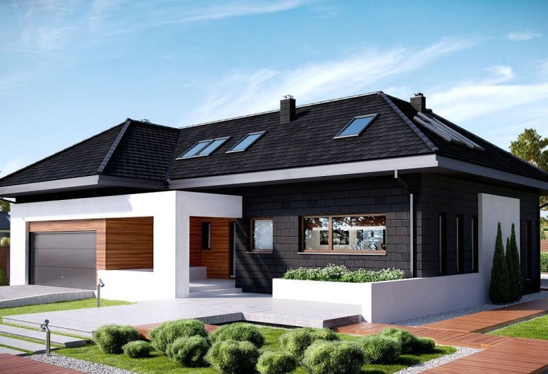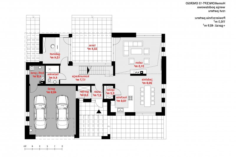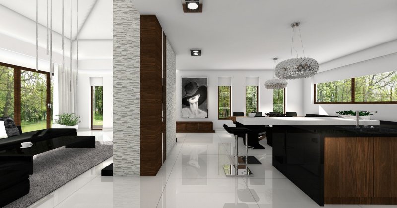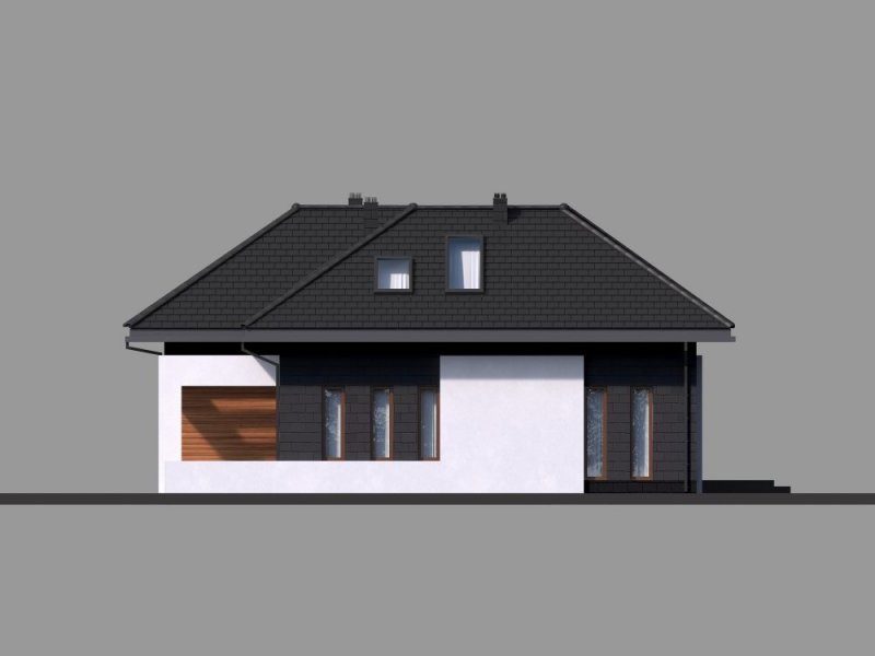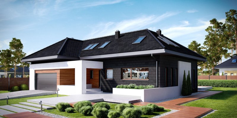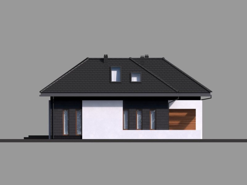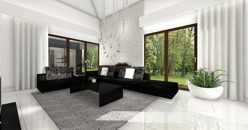 Taras, który jest wcięty w bryłę domu i sąsiaduje z salonem, a z drugiej strony z gabinetem, można wyposażyć w piękną podświetloną roślinność. Jest to niezwykle piękny i efektowny widok. Na parterze zaprojektowano salon, kuchnię, jadalnię, łazienkę, pokój gościnny, pomieszczenie gospodarcze oraz małą garderobę. Na piętrze z kolei znajdziemy trzy sypialnie, trzy garderoby oraz dwie łazienki.