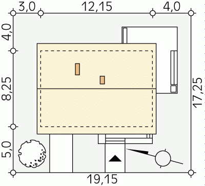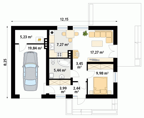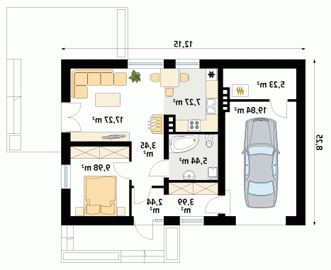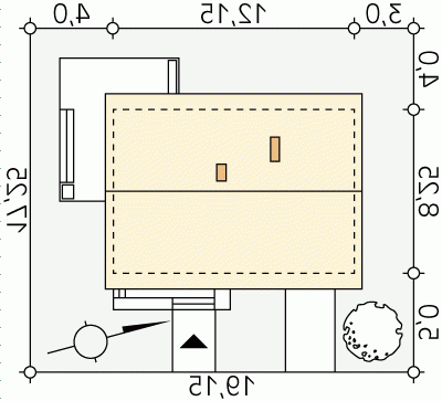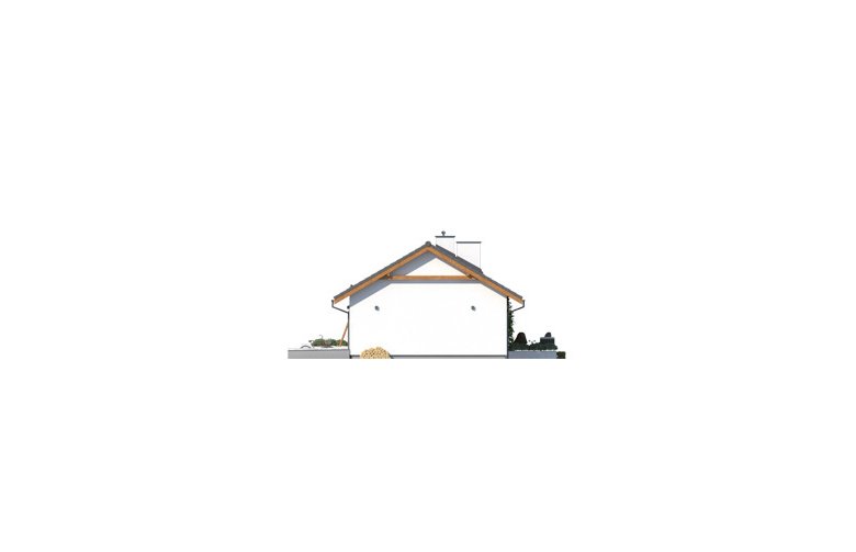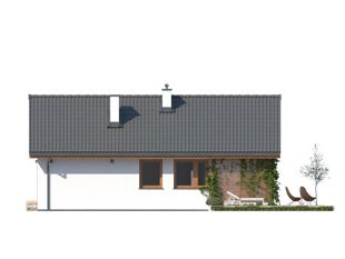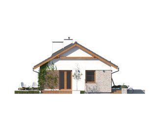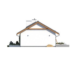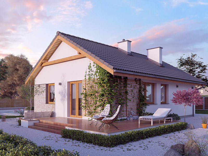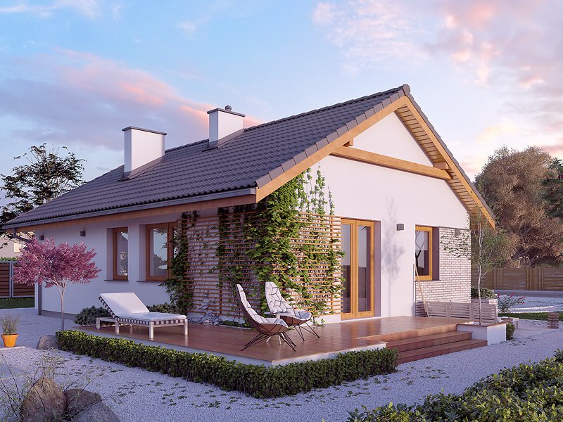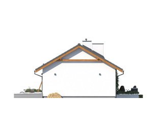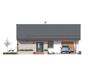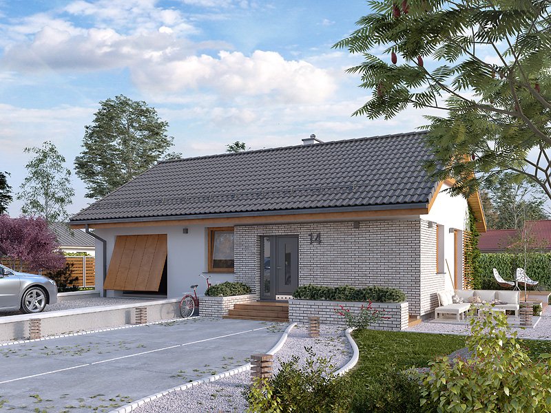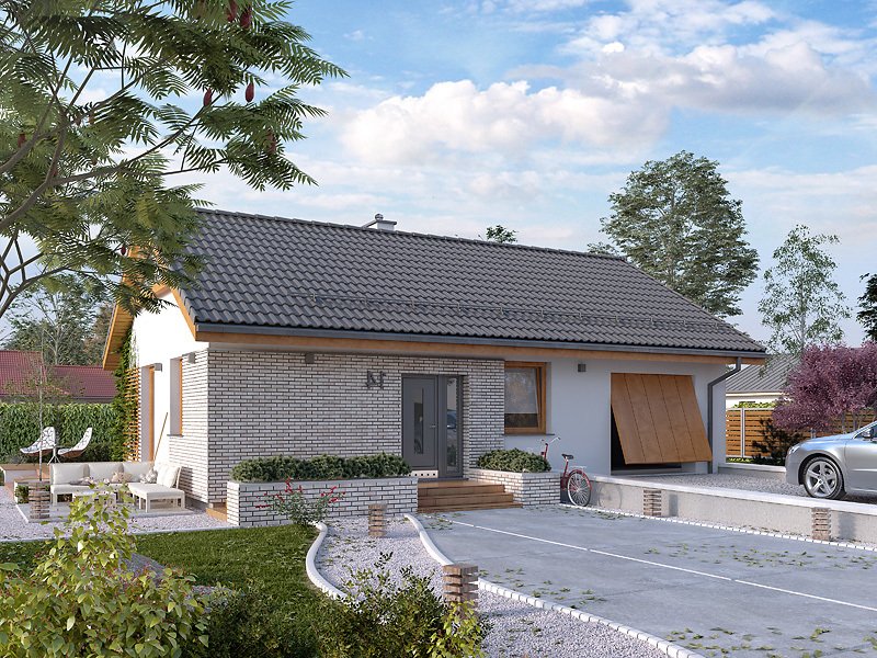 Mały, wygodny dom parterowy z garażem. Prosta bryła czyni dom tanim w budowie i użytkowaniu. Program funkcjonalny idealny dla małej rodziny. Duży taras połączony z pokojem dziennym stanowi jego przedłużenie w miesiącach letnich.