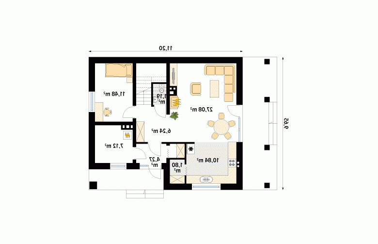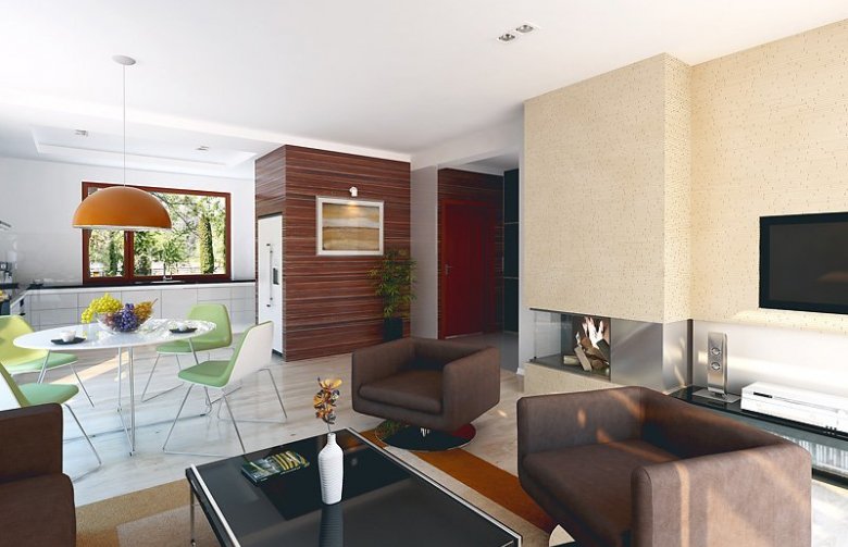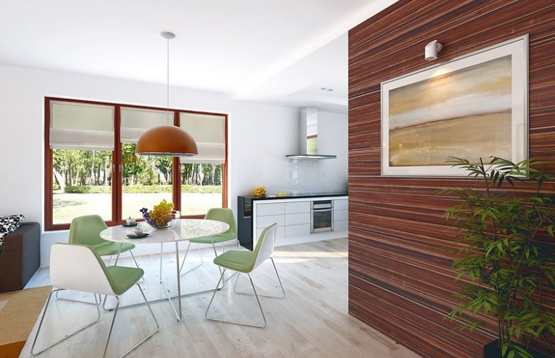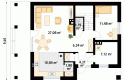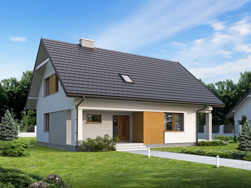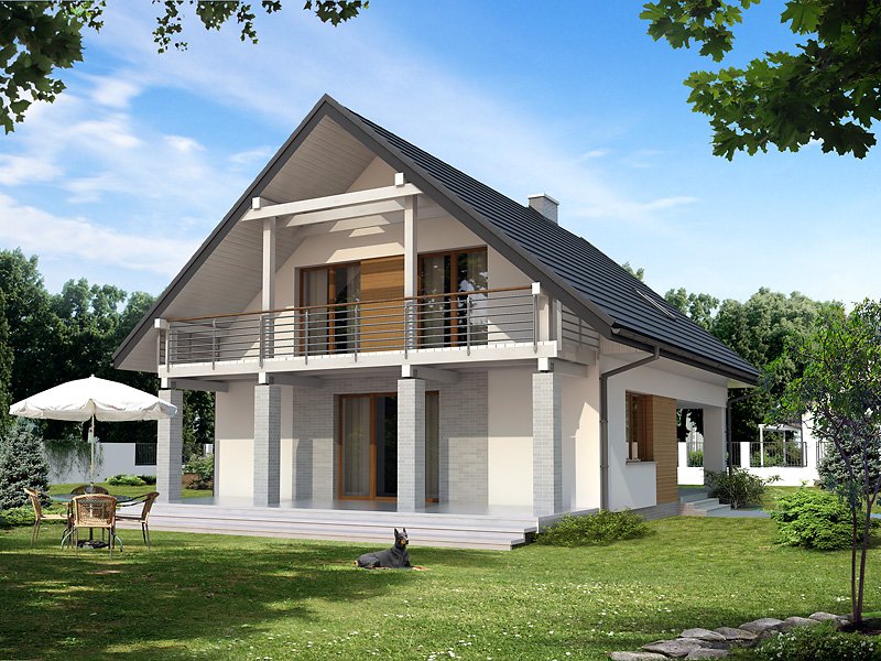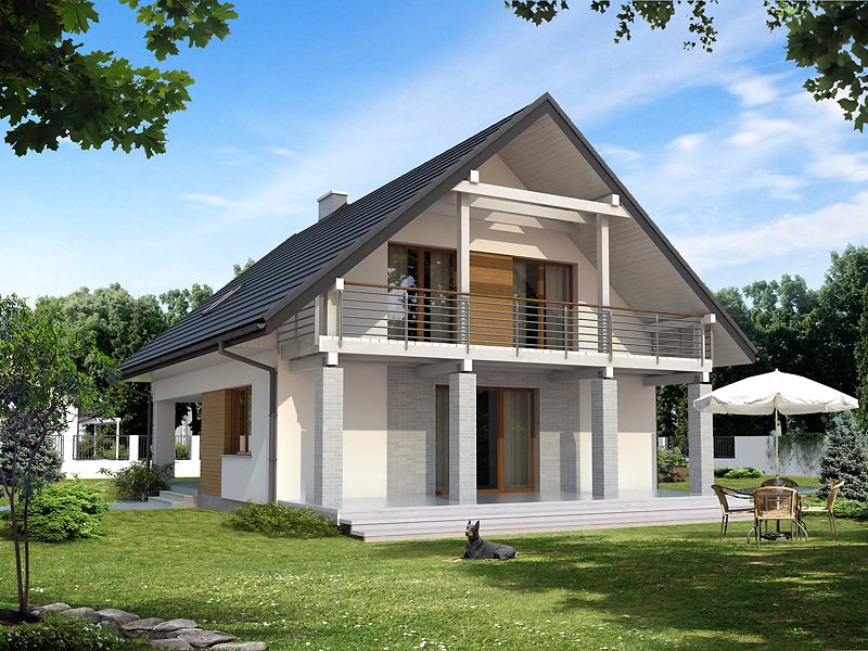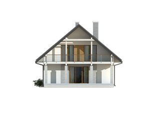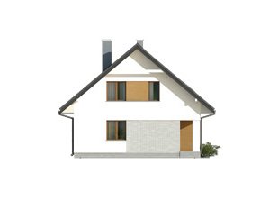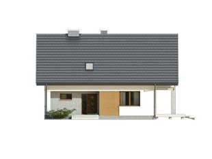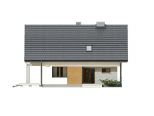 Nowoczesny budynek mieszkalny, jednorodzinny, zapewniający komfort 4 - 5-osobowej rodzinie. Prosta, archetypowa bryła budynku przykryta dwuspadowym dachem. Atutem projektu jest duży zadaszony taras na parterze i piętrze. Dodatkowy pokój na parterze.