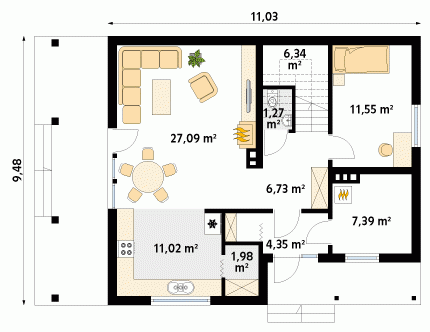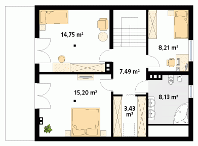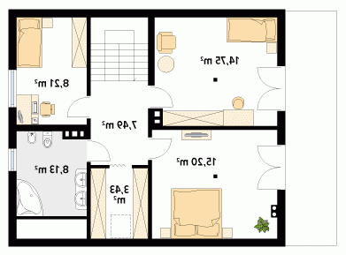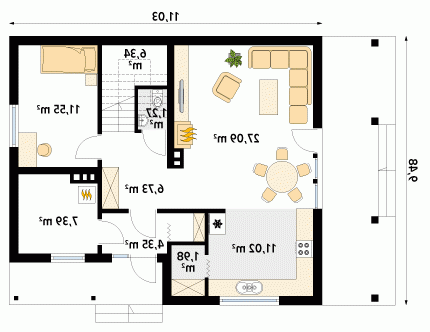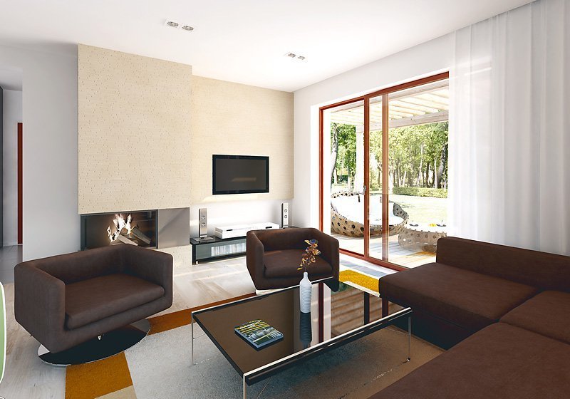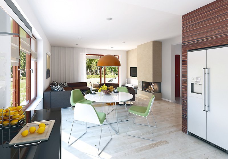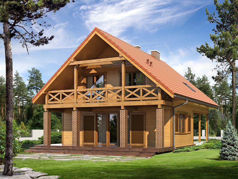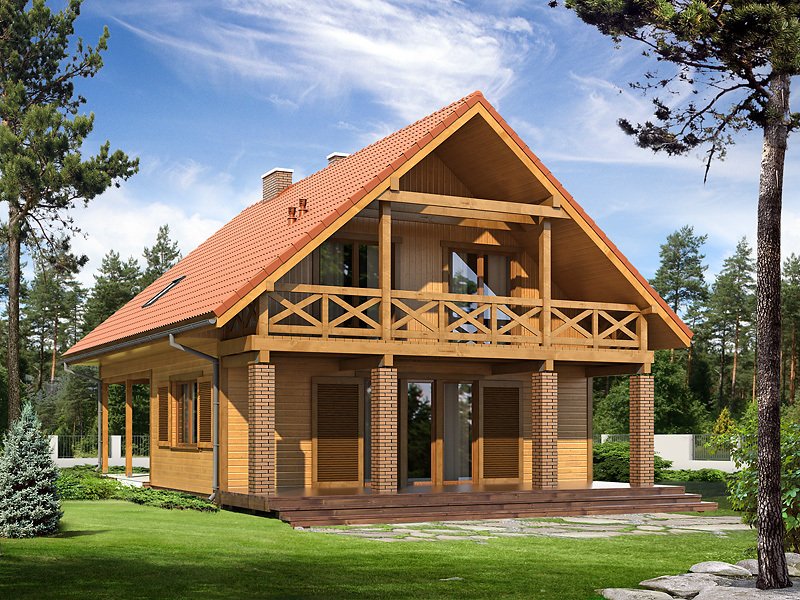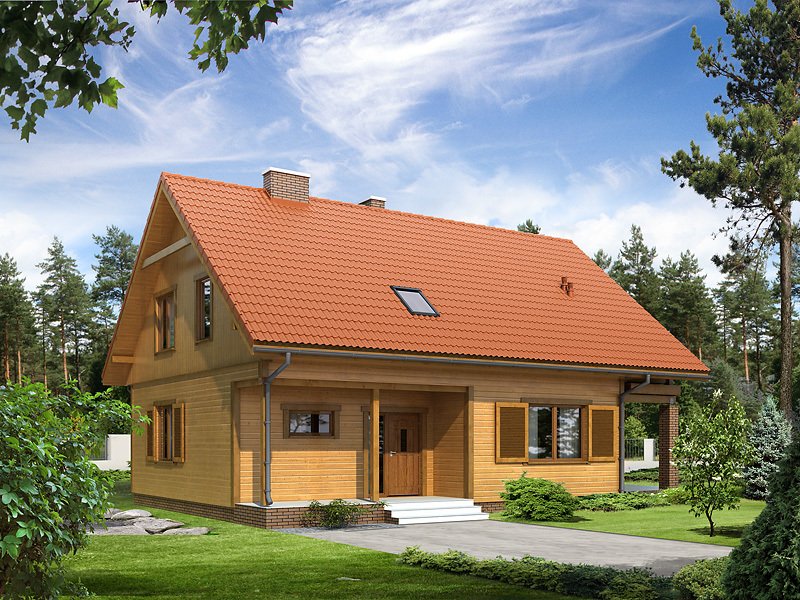 Jednorodzinny dom, parterowy z użytkowym poddaszem, przeznaczony dla 4,5 - osobowej rodziny. Wyraźny podział na część dzienną na parterze i część nocną. Duży zadaszony taras. Dodatkowy pokój na parterze.