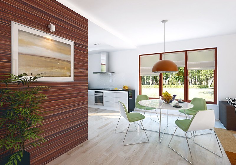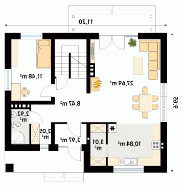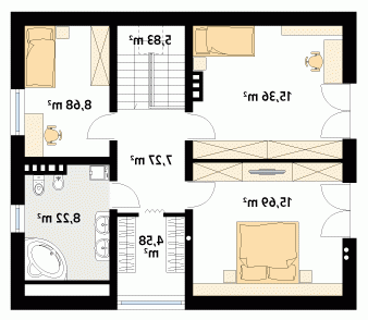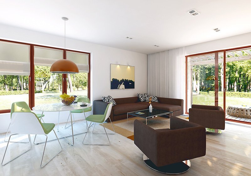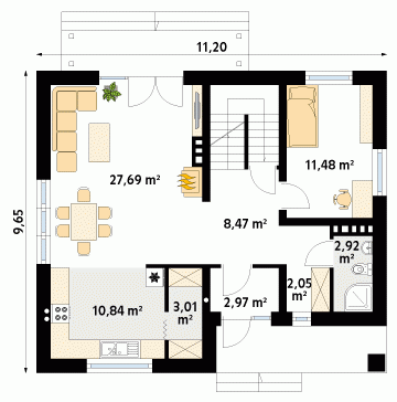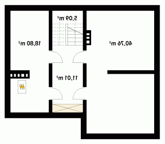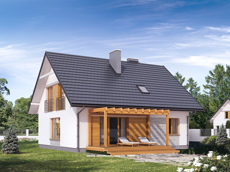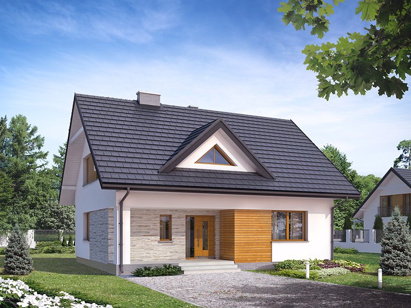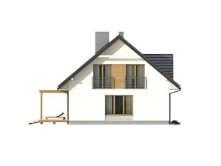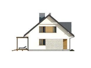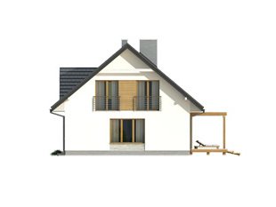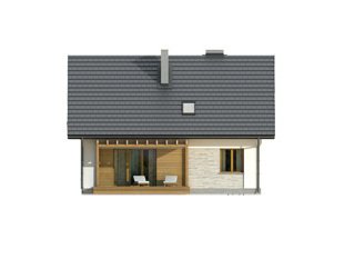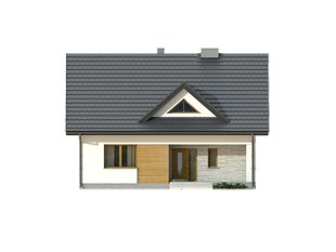 Wygodny dom dla 4 - 5-osobowej rodziny. Zlokalizowana na parterze część dzienna mieści przestronny pokój dzienny z jadalnią, kuchnię, spiżarnię, gabinet, wc. Na poddaszu znajdują się trzy sypialnie, łazienka i garderoba. Dom posiada piwnicę, w której mieści się kotłownia oraz pomieszczenia gospodarcze. Prosta bryła z dwuspadowym dachem czyni dom łatwym w realizacji i tanim w użytkowaniu.