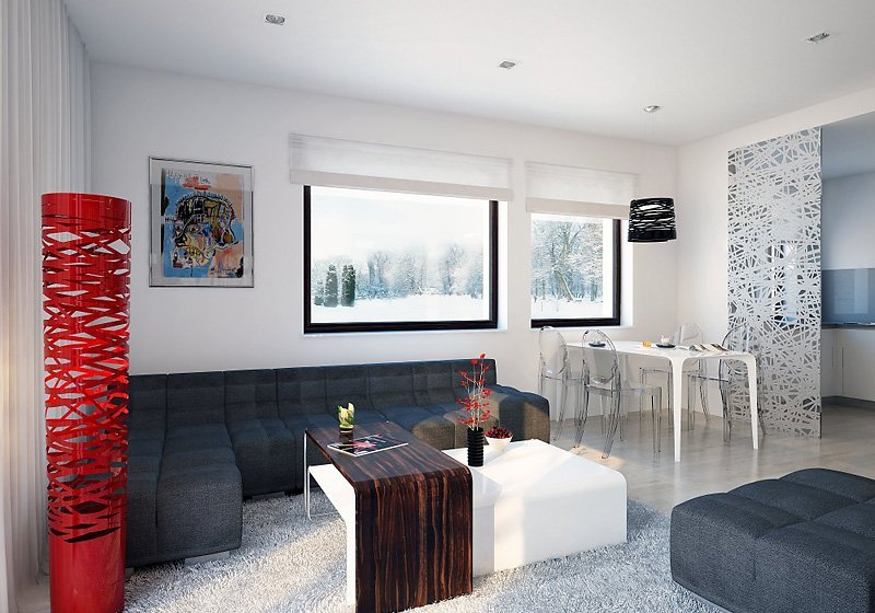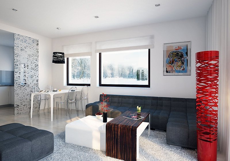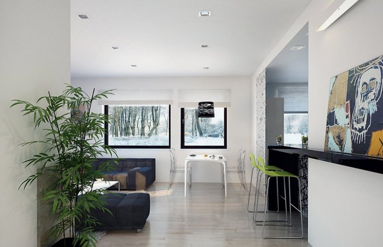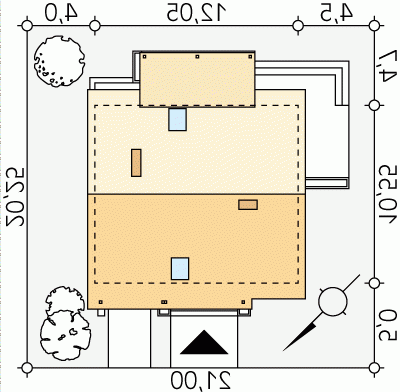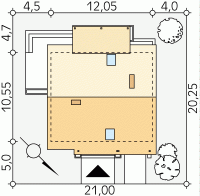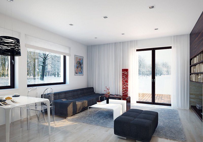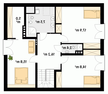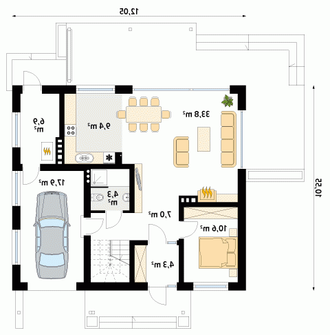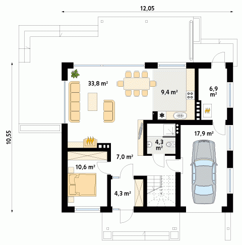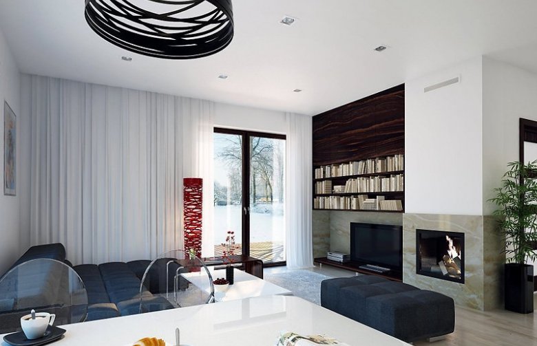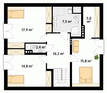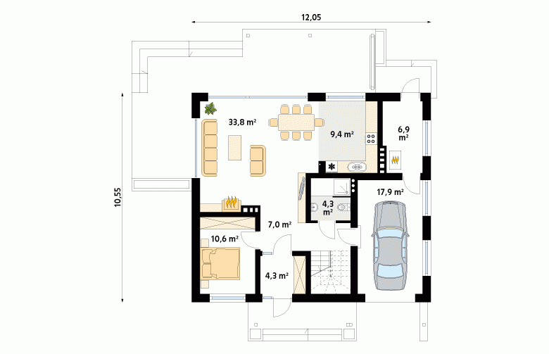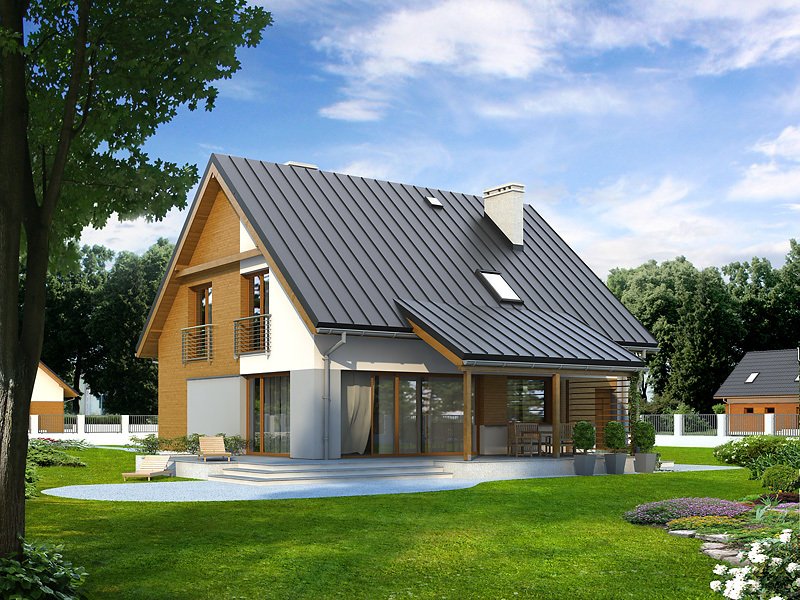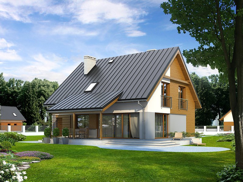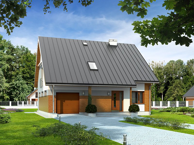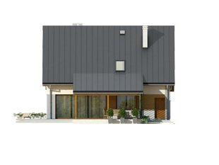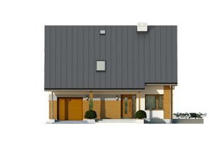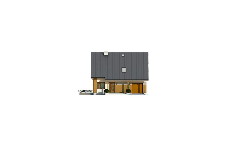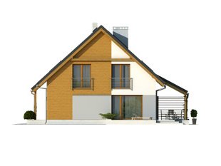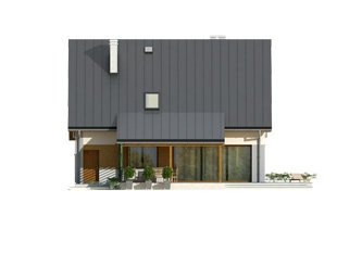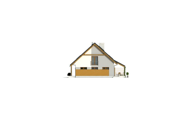Wygodny dom dla 4 – 5-osobowej rodziny. Zlokalizowana na parterze część dzienna mieści w sobie przestronny pokój dzienny, jadalnię, kuchnię i gabinet, dodatkowo są tu: łazienka, duża kotłownia i jednostanowiskowy garaż. Na poddaszu znajdują się trzy obszerne sypialnie, łazienka, wc i garderoba. Prosta bryła z dwuspadowym dachem i zadaszonym tarasem.