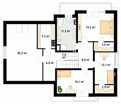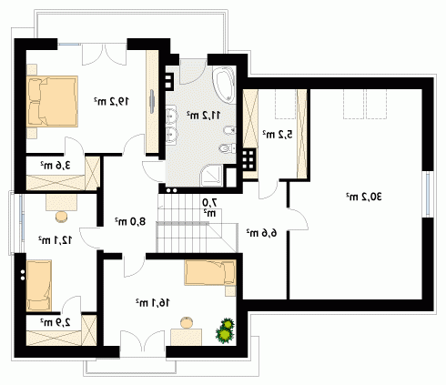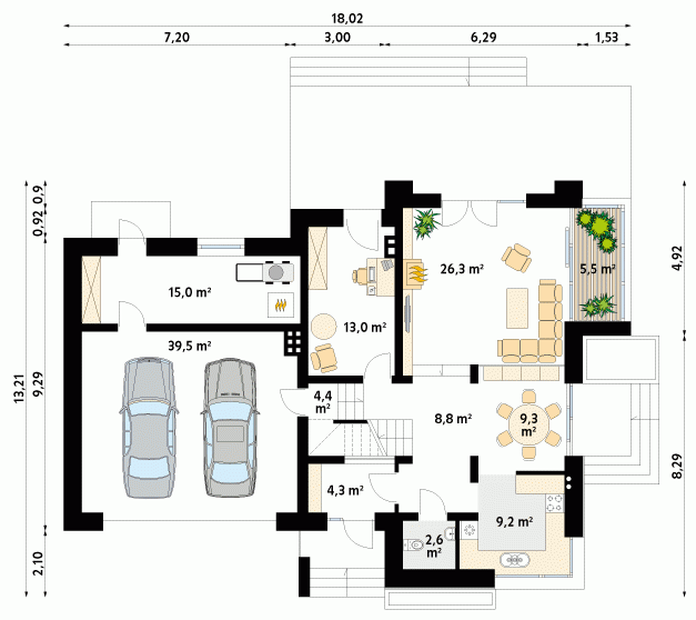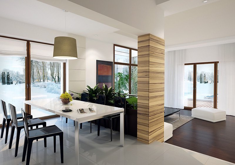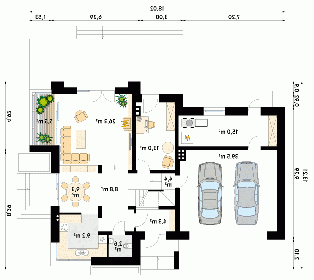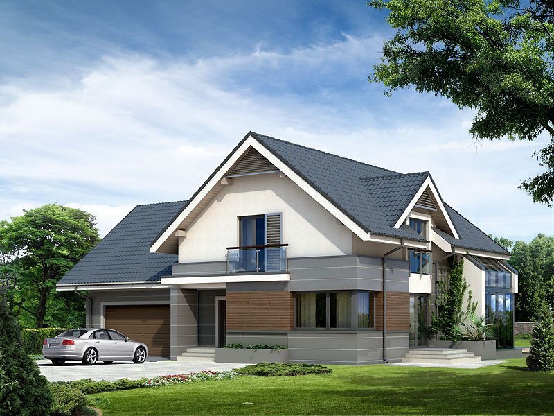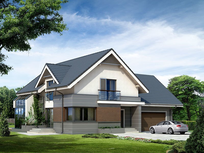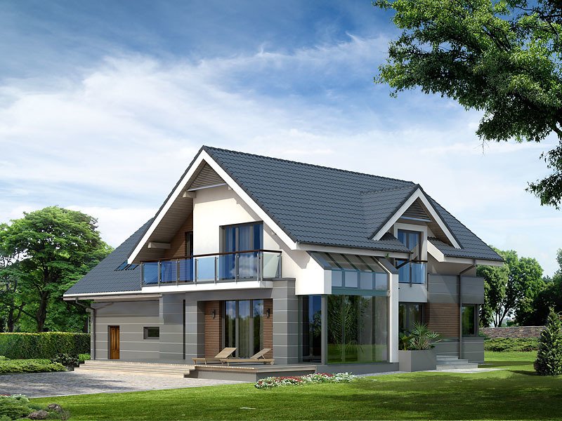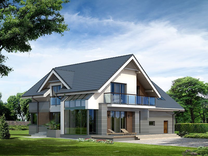 Nowoczesny dom mieszkalny projektowany według standardów przyjętych w domach energooszczędnych. W dużych przestronnych wnętrzach parteru zaprojektowano oranżerię. Na poddaszu zaprojektowano trzy sypialnie oraz pokój zabaw lub hobby nad garażem. Na parterze znajduje się dodatkowy pokój.