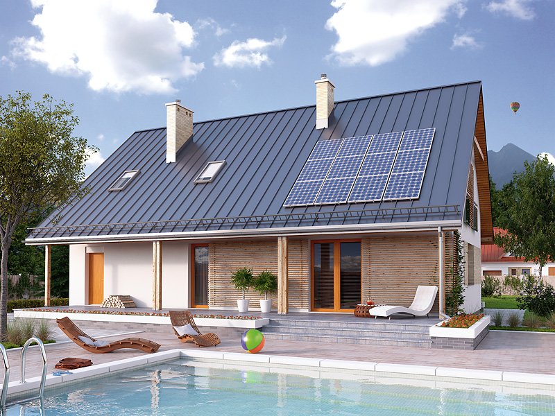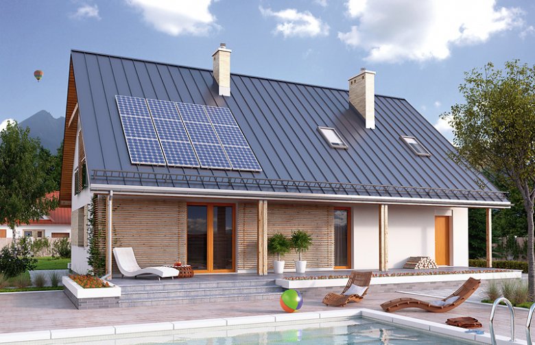 Ściany: 2-warstwowe - pustak ceramiczny + styropian, Stropy: żelbetowe, wylewane, Dach: blacha na rąbek stojący Classic Ruukki, kąt nachylenia 42°