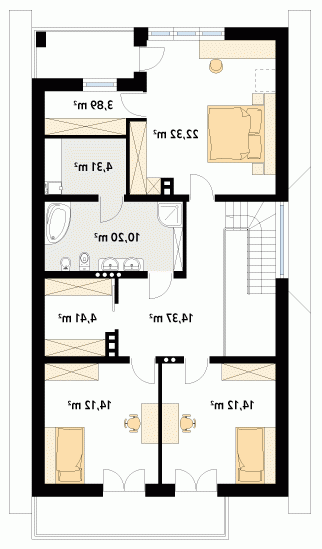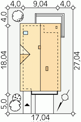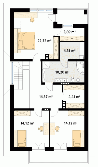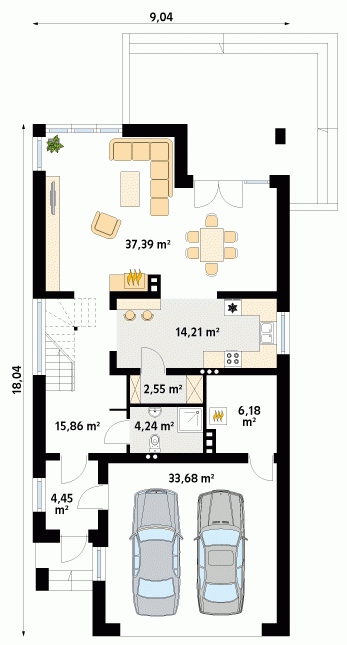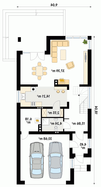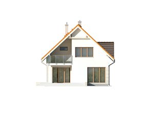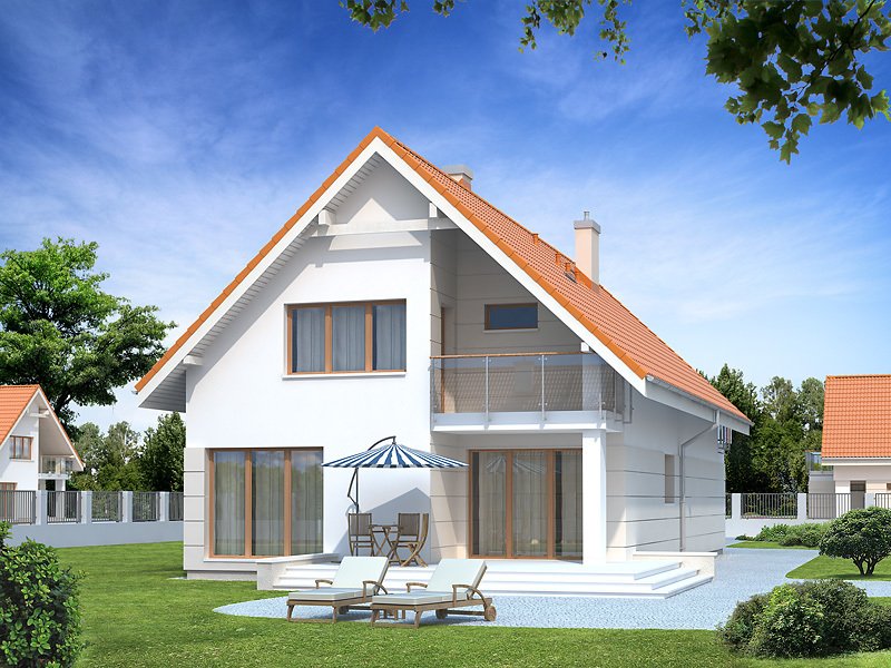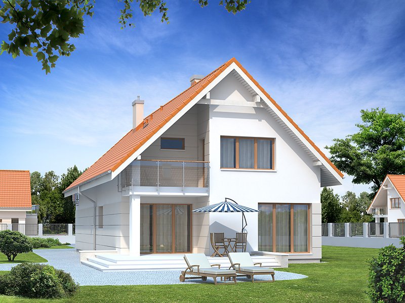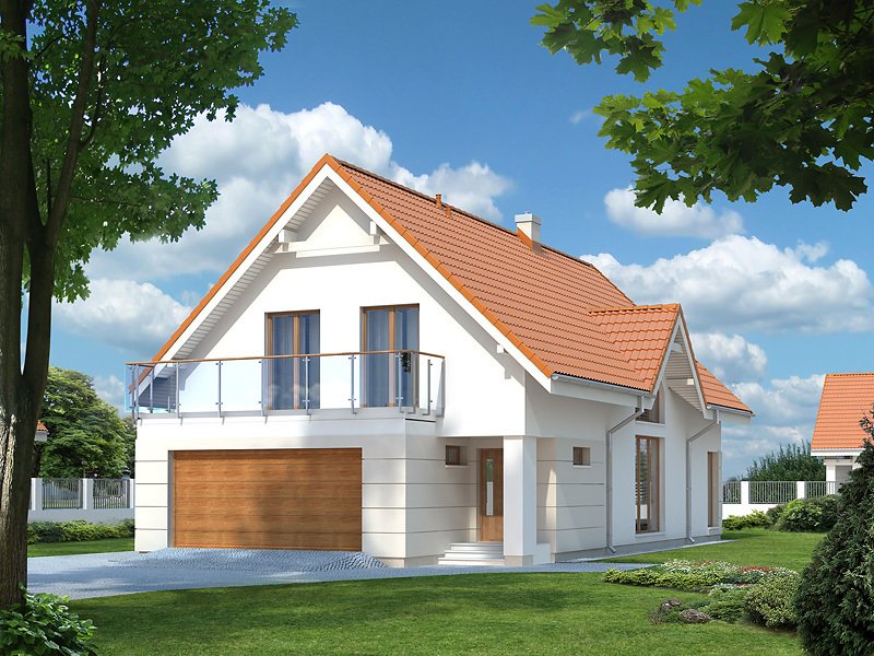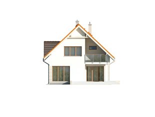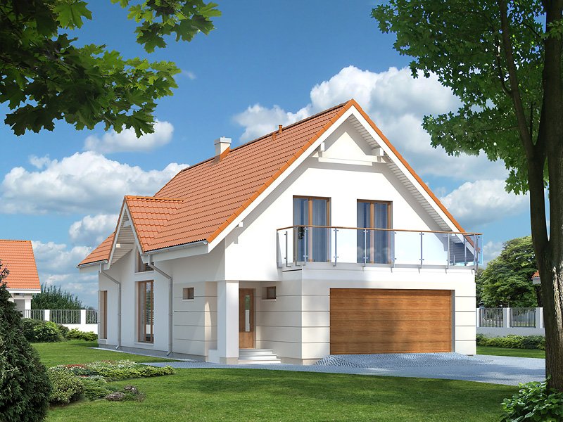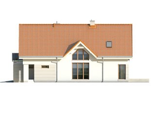 Dom z dwustanowiskowym garażem na dosyć wąską działkę. Na parterze, oprócz części dziennej, mamy spiżarnię dostępną z kuchni i łazienkę. Na poddaszu zaprojektowano trzy sypialnie, łazienkę z pralnią oraz dwie garderoby.