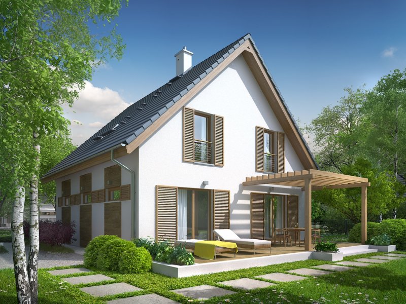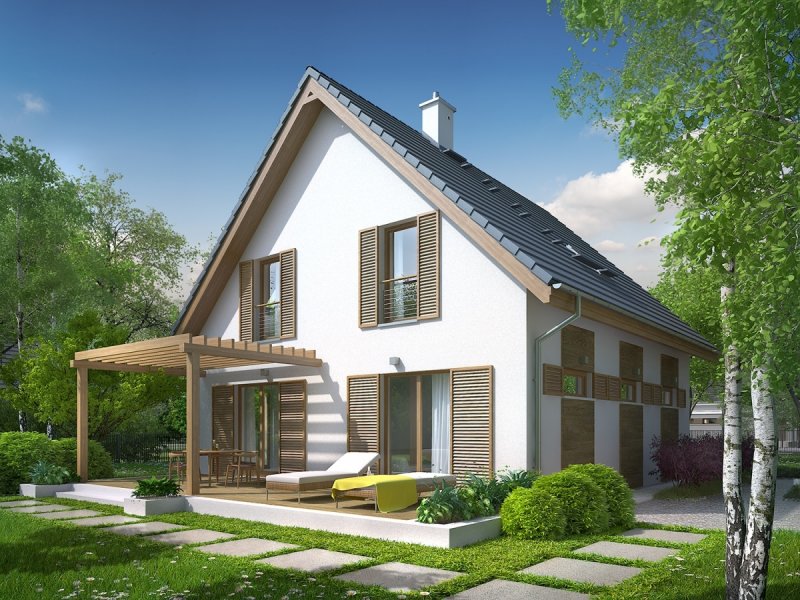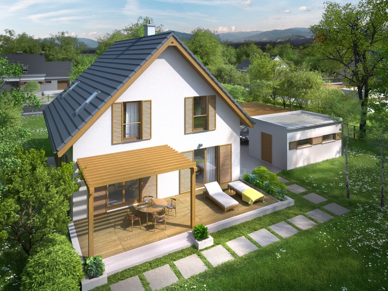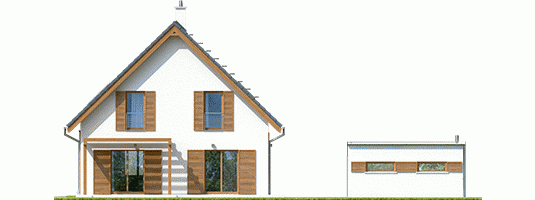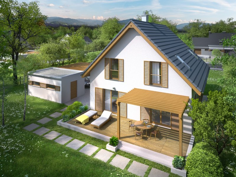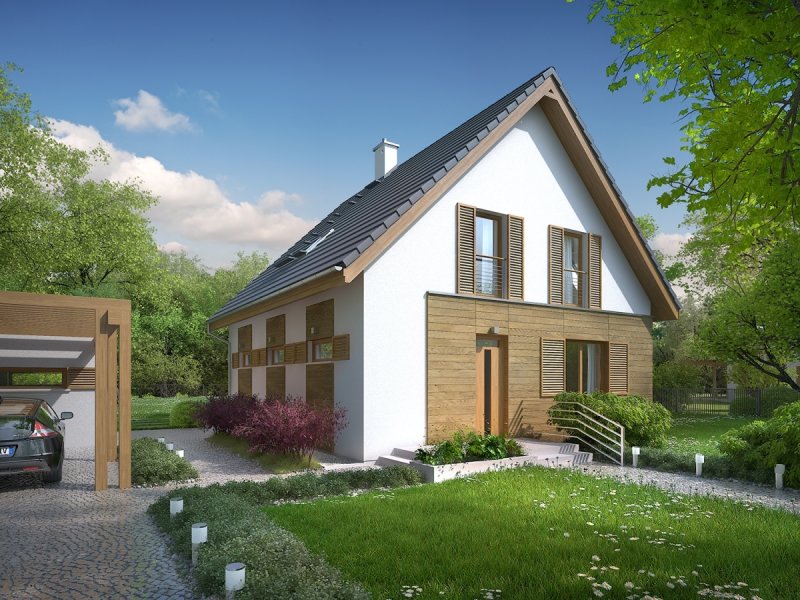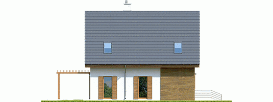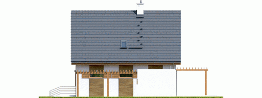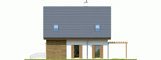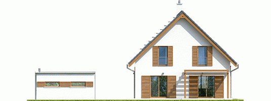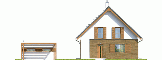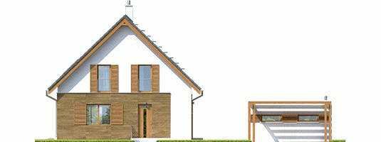 Julian (z wiatą) to piękny dom, który łączy styl współczesny z klasyką. Prosta konstrukcja i dwuspadowy dach doskonale odnajdą się w każdym krajobrazie. Atrakcyjny charakter projektu podkreśla szlachetna kompozycja elewacji z naturalną urodą drewna w roli głównej. Przytulny wdzięk całości dumnie akcentują efektowne okiennice. We wnętrzu czeka na domowników perfekcyjnie rozplanowany układ pomieszczeń. Dodatkową strefę rekreacyjną zaplanowano na przestronnym tarasie, na którym letnią porą rozkwita życie rodzinne i towarzyskie – w tak zorganizowanej przestrzeni każdy czuje się komfortowo i swobodnie.