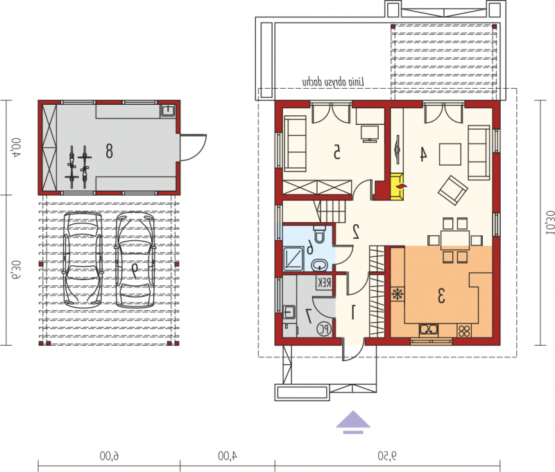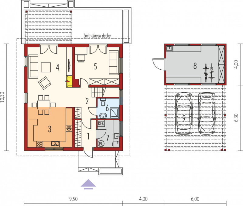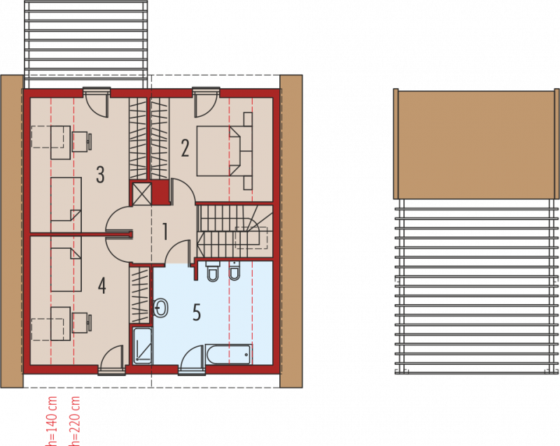 Dach: konstrukcja drewniana, ocieplenie wełna mineralna 30 cm, dachówka płaska lub inna o podobnych