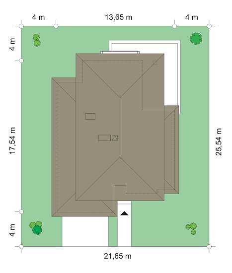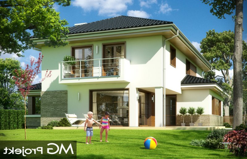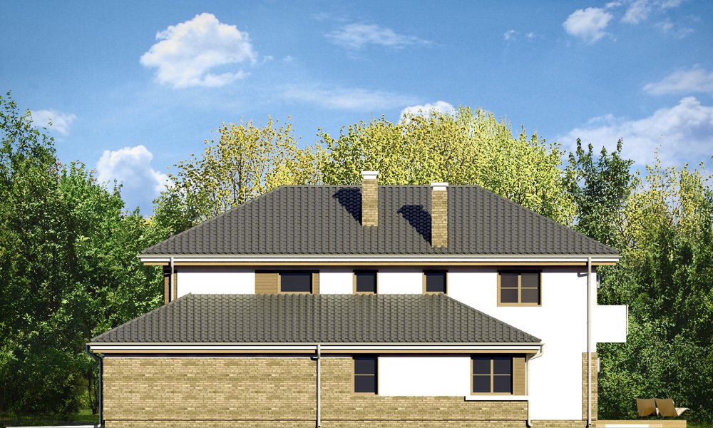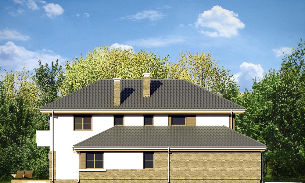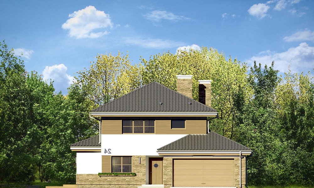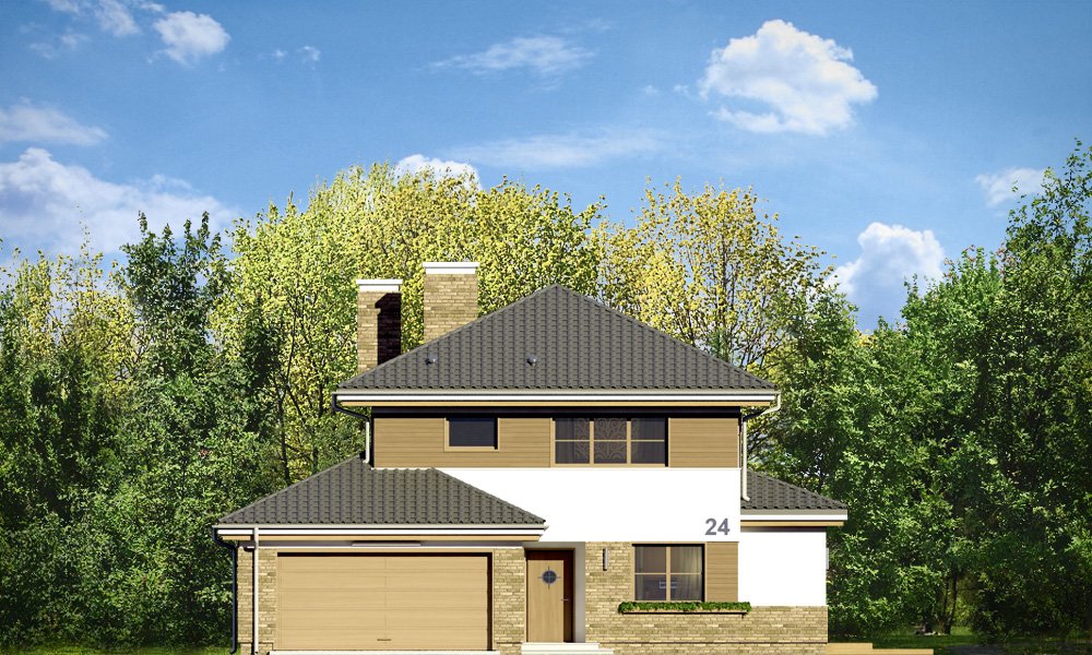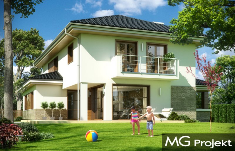 Kasjopea 5 jest wariantową wersją popularnego projektu Kasjopea. Dom został znacznie powiększony i stał się komfortową piętrową willą, z podwójnym garażem. Piętrowy podłużny rdzeń domu przekryty czterospadowym dachem otoczony jest parterowymi przybudówkami. Cała bryła ma urozmaicony kształt, dodatkowo wzbogacony dużymi przeszkleniami, okładzinami ścian, wykuszami i podcieniami. Całość tworzy nowoczesny, acz stonowany wygląd zewnętrzny. Wnętrze budynku podzielono na część dzienną na parterze i sypialnie na piętrze. Parter to przede wszystkim połączone salon, jadalnia i hol. Wyeksponowane reprezentacyjne schody, kominek, narożne okno balkonowe na taras i podcień – to elementy podnoszące atrakcyjność wnętrza. Duża kuchnia z dodatkowym kątem śniadaniowym i spiżarnią jest częściowo otwarta na jadalnię i hol. Na parterze miejsce znalazł też dodatkowy pokój-gabinet, lub sypialnia gościnna, oraz dwustanowiskowy garaż i kotłownia. Na piętrze przewidziano aż cztery pokoje, w tym sypialnię rodziców z oddzielną łazienką i garderobą, dużą ogólnodostępną łazienkę i pralnię. Dla domowników dodatkowo do dyspozycji są strychy - nad piętrem, oraz nad garażem i kotłownią. Kasjopea 5 to prawdziwa twierdza wśród projektów z tej serii - zawiera w sobie wszystkie pomieszczenia jakich można tylko wymagać od dużego komfortowego domu. Dom jest jednocześnie energooszczędny. Ma świetne izolacje, a zastosowane w nim nowoczesne technologie zmniejszają koszty utrzymania domu. Zapraszamy !