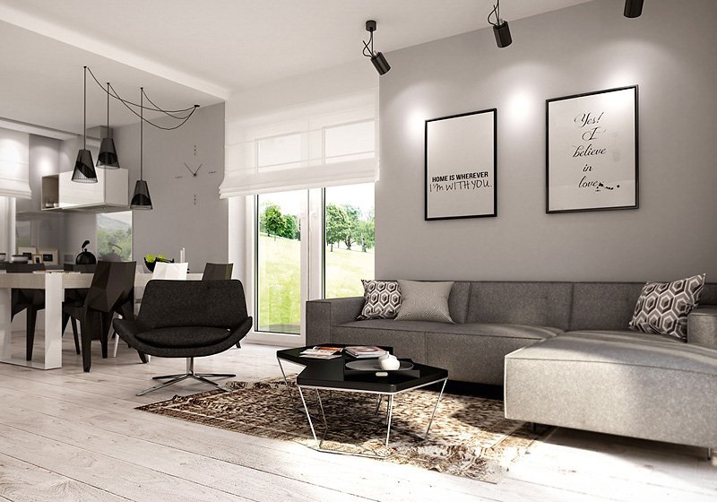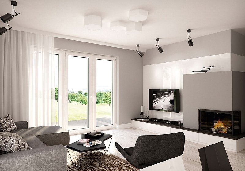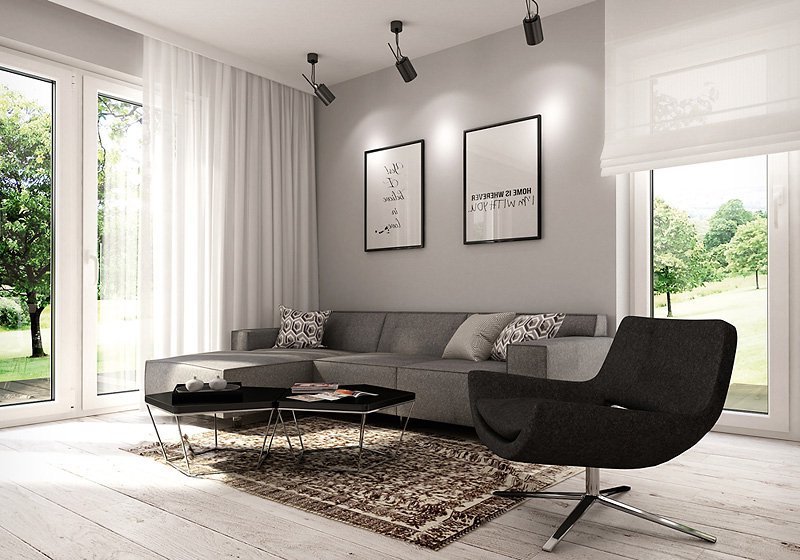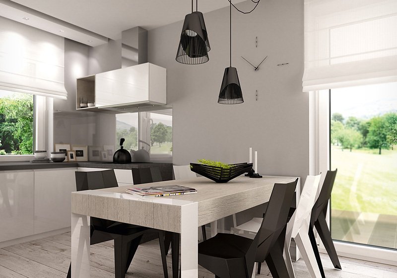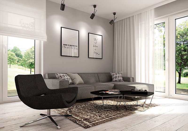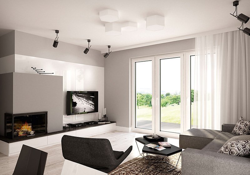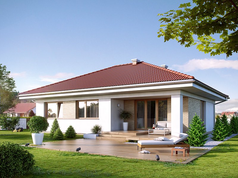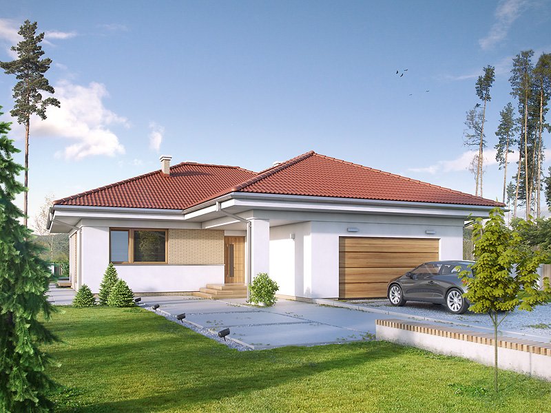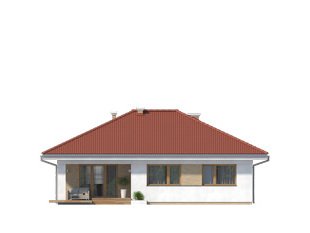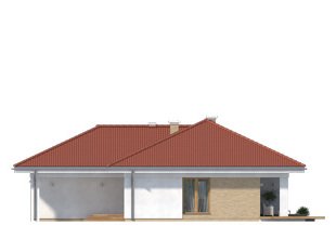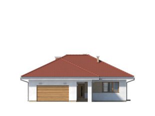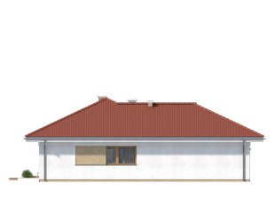 Jednorodzinny budynek mieszkalny, parterowy, niepodpiwniczony. Optymalny układ pomieszczeń zapewnia komfort 4-osobowej rodzinie. W części dziennej domu zaprojektowano kuchnię ze spiżarnią oraz salon z jadalnią otwierający się na zewnątrz poprzez szereg przeszkleń. Część nocna to trzy sypialnie oraz łazienka. W części gospodarczej przewidziano kotłownię oraz dwustanowiskowy garaż.