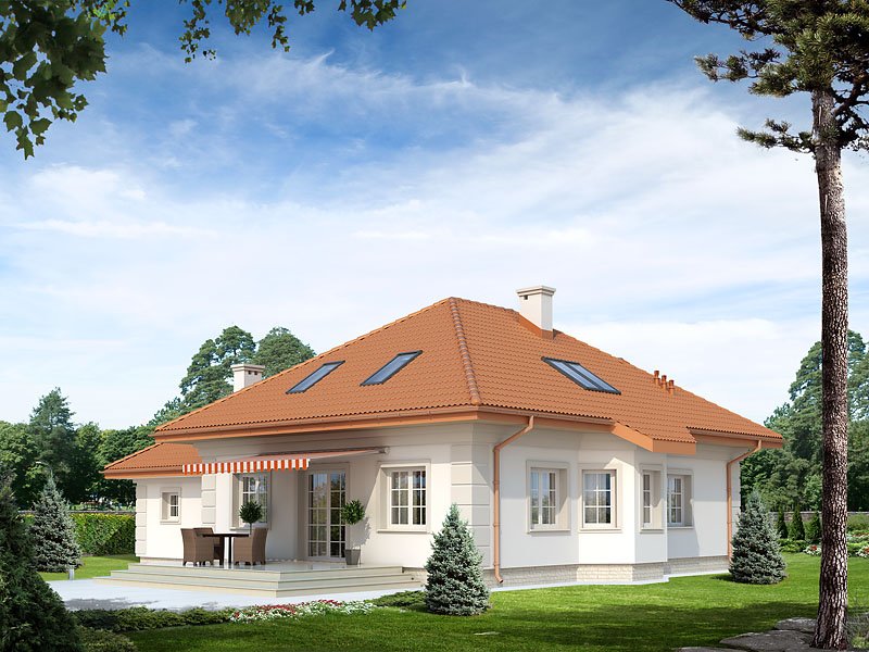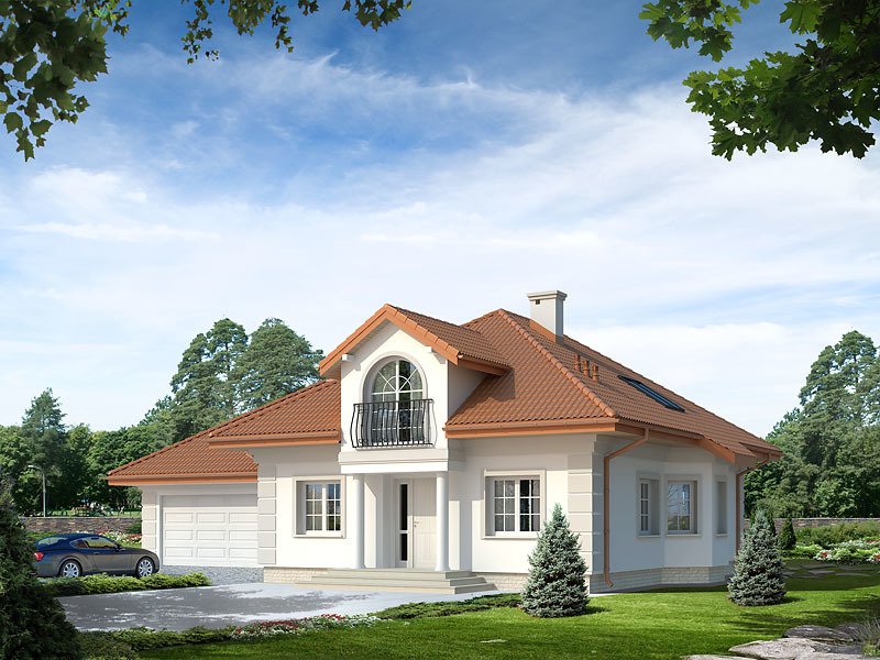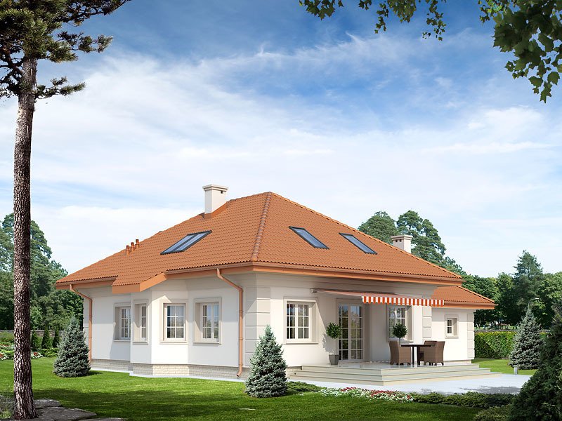Dom mieszkalny jednorodzinny z użytkowym poddaszem i dwustanowiskowym garażem, przeznaczony dla 2-4 osób. Przestronny salon otwarty jest na taras i kuchnię. Liczne pomieszczenia dodatkowe: biblioteka na poddaszu, spiżarnia, pomieszczenie gospodarcze i dwie garderoby odpowiadają za praktyczną wygodę użytkowania domu.