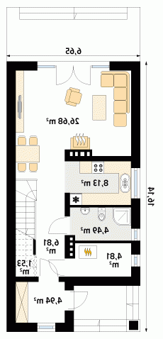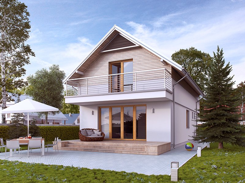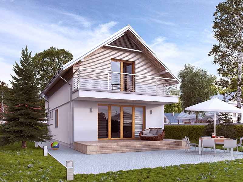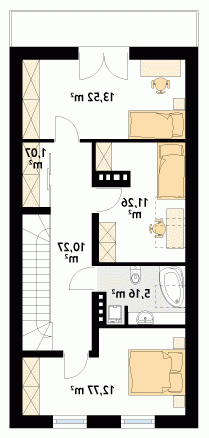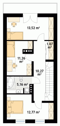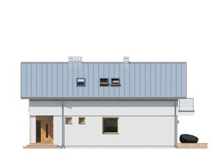 Projekt powstał z myślą o inwestorach, którzy planują zbudować dom w technologii murowanej. Wewnątrz domu zaprojektowano trzy sypialnie oraz dwie łazienki. Warto zwrócić uwagę na praktyczne usytuowanie garderoby. Prezentowany projekt jest idealny na wąską lub płytką działkę. Dom w stylu nowoczesnym został wyposażony w komplet energooszczędnych rozwiązań.