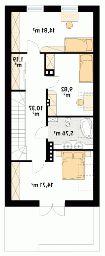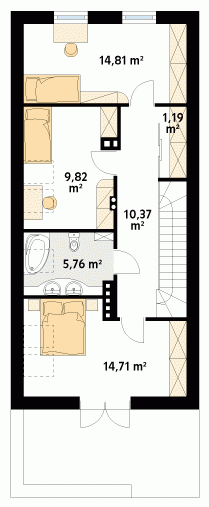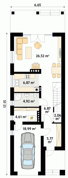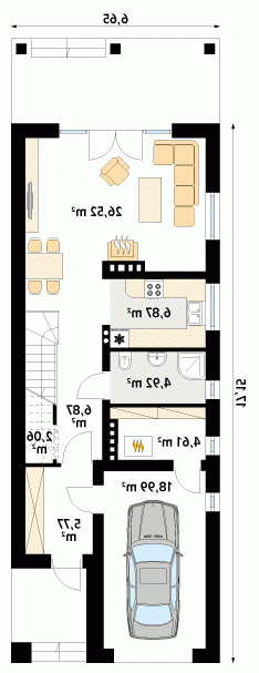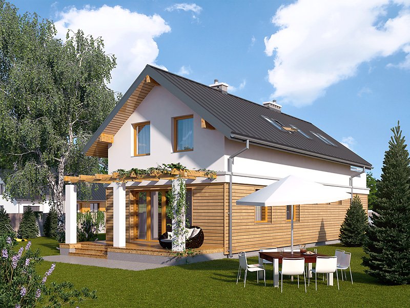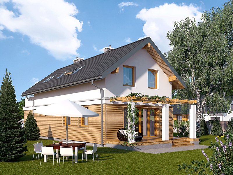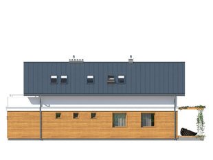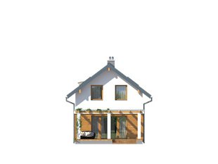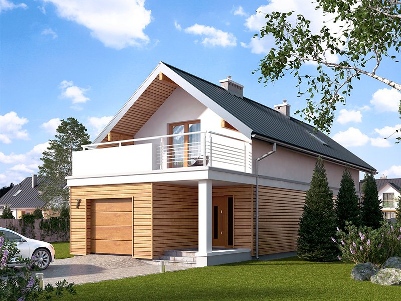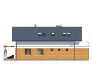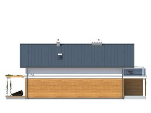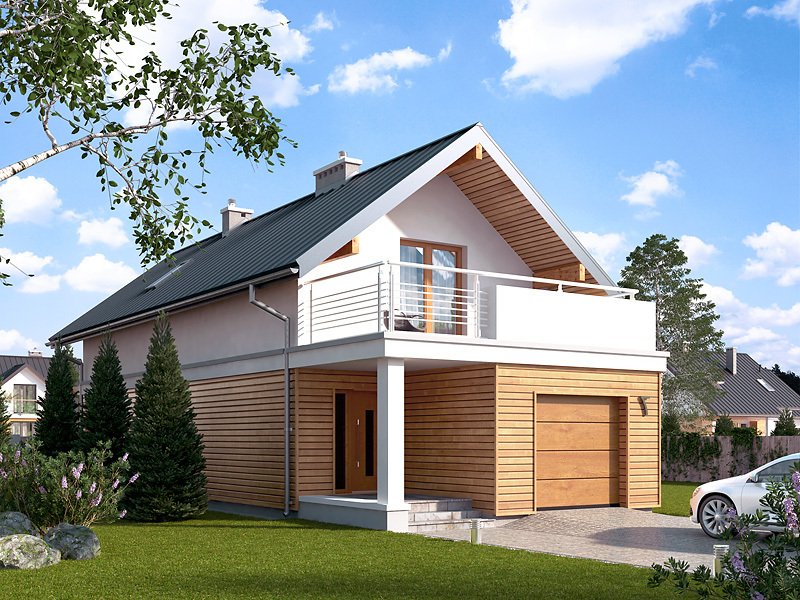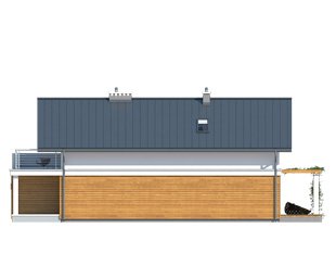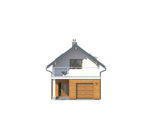 Niewielki dom jednorodzinny z garażem, idealny na wąską działkę. Dom o nowoczesnym i oryginalnym wyrazie. Odznacza się optymalnym wykorzystaniem przestrzeni. Na parterze zaprojektowano przestronny salon, jadalnię, kuchnię oraz garaż i dużą kotłownię. Na poddaszu znajdują się trzy sypialnie, łazienka i garderoba. Projekt mieści się na działce o szerokości poniżej 16 m w związku z tym, zgodnie z przepisami zawartymi w warunkach technicznych, istnieje możliwość przesunięcia domu ścianą bez otworów okiennych na odległość 1,5 m od granicy działki.