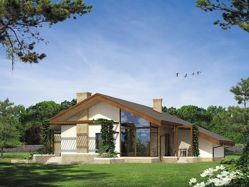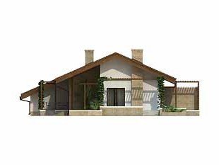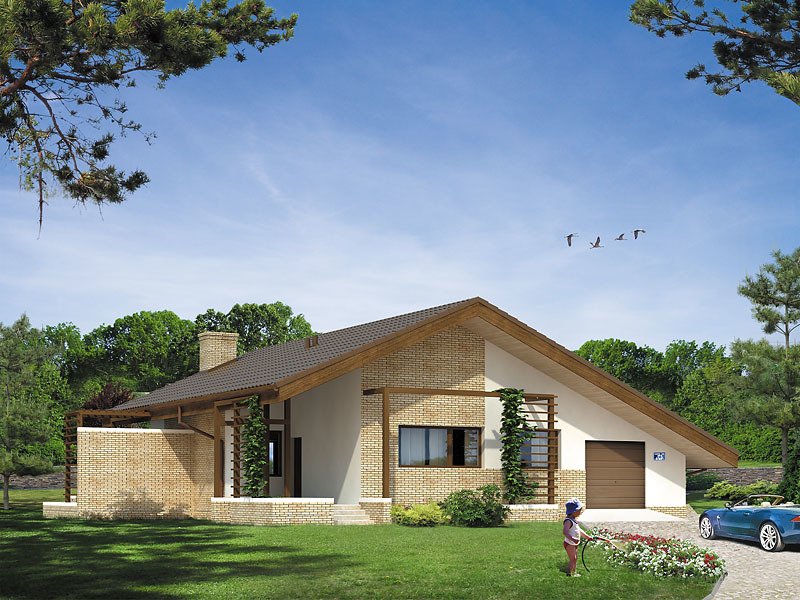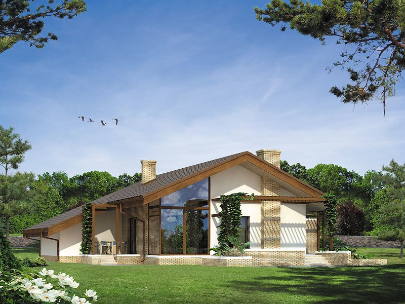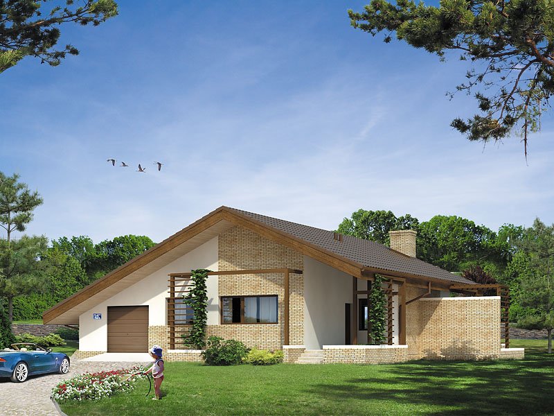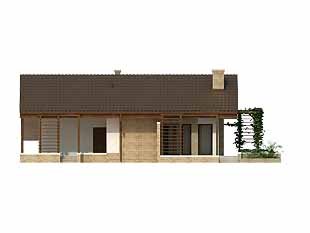 Efektowny jednorodzinny dom parterowy. Przejrzysty układ funkcjonalny, przewidziany dla 4-osobowej rodziny. Wyraźny podział na część dzienną i nocną. Duża część dzienna wzbogacona o ogród zimowy. Otwarty na otaczającą przestrzeń. Wzbogacony o szereg ciekawych tarasów, pergoli i murków.