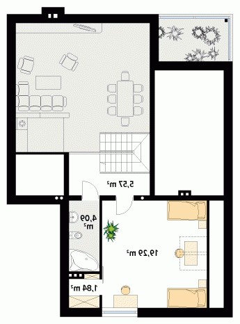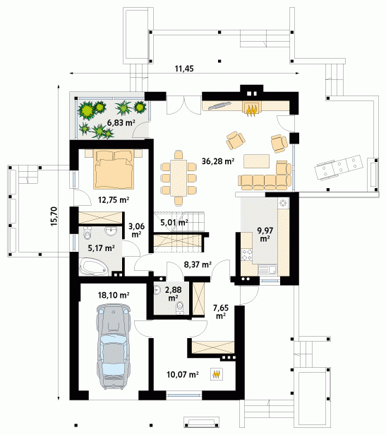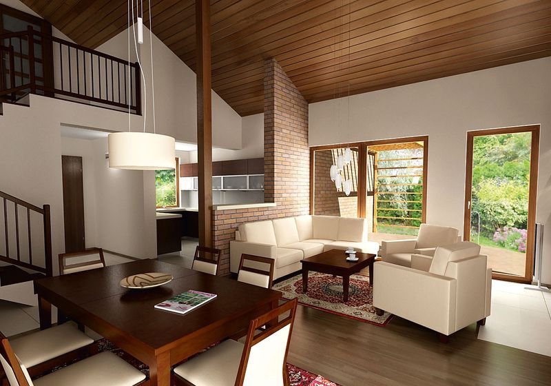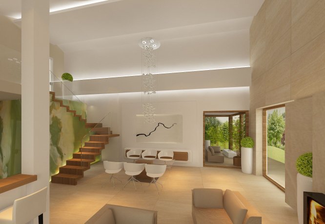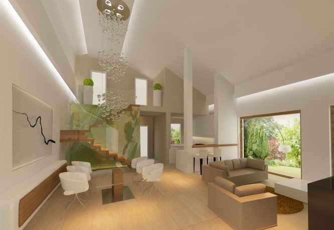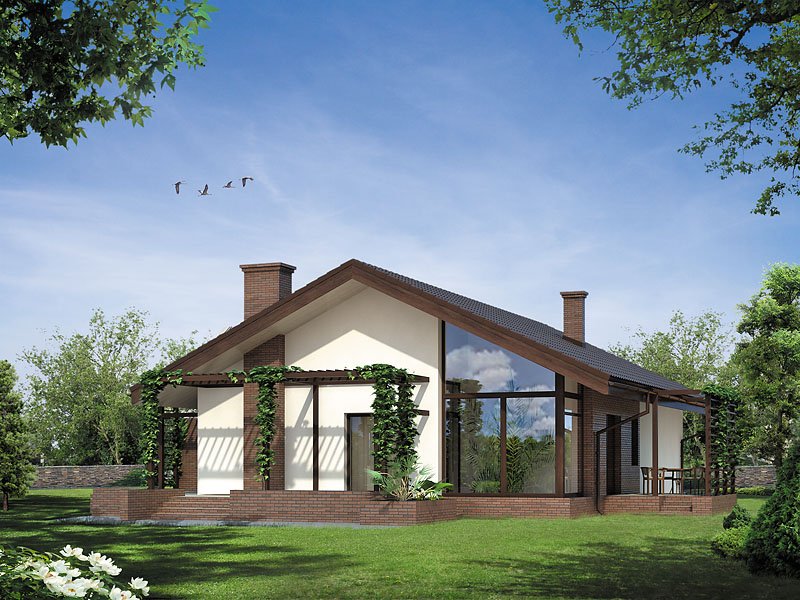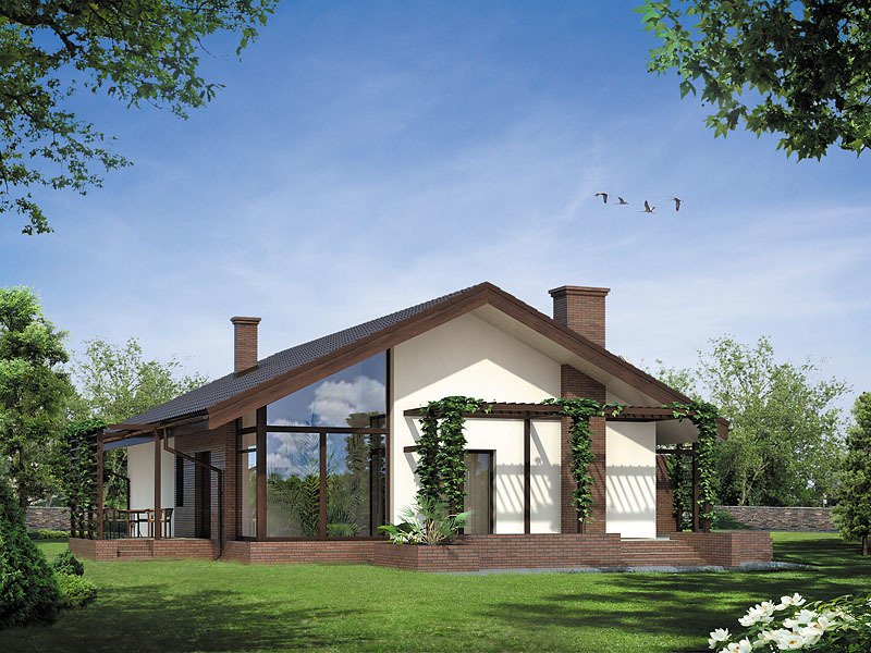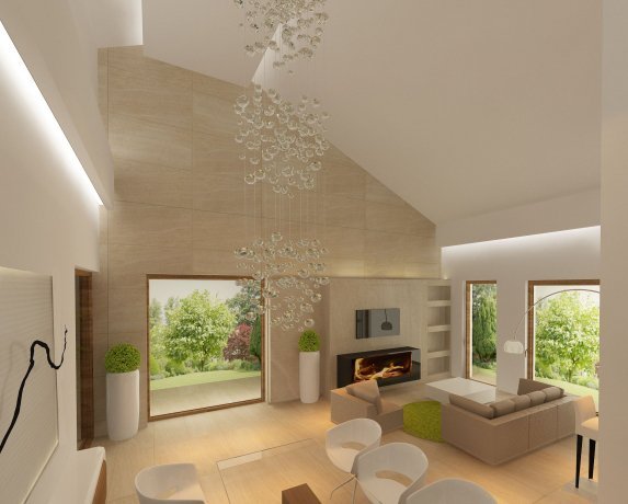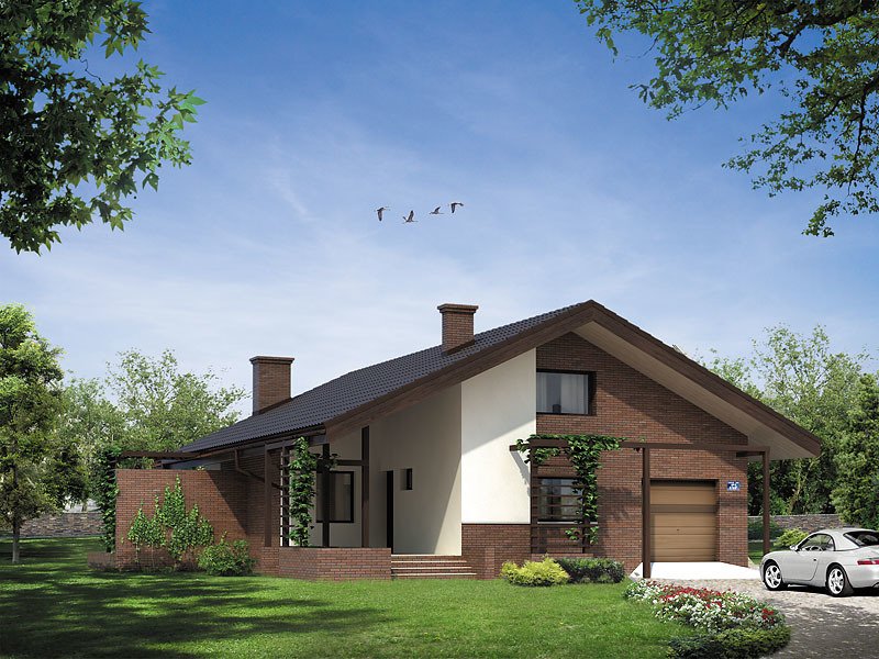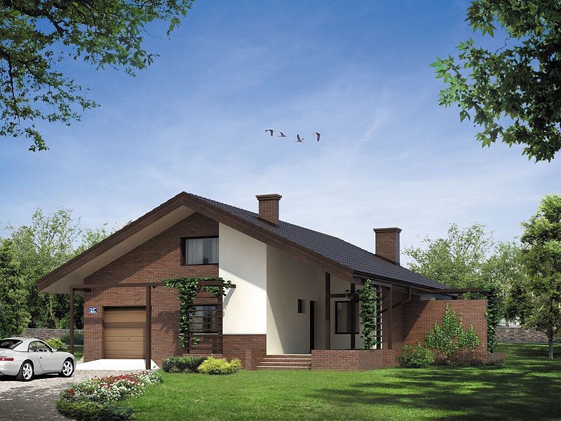 Ciekawy dom jednorodzinny parterowy z użytkowym poddaszem. Układ funkcjonalny zaprojektowany dla 3 – 4-osobowej rodziny. Wyraźny podział na część dzienną, nocną i techniczną. Strefa dzienna wzbogacona o ogród zimowy i antresolę. Zapewnia kontakt z otaczającą przyrodą dzięki szeregowi ciekawych tarasów, pergoli i murków.