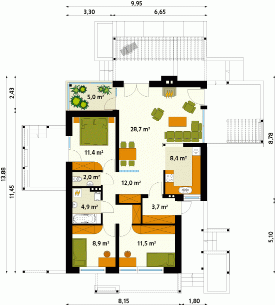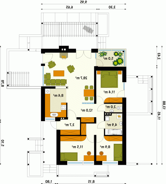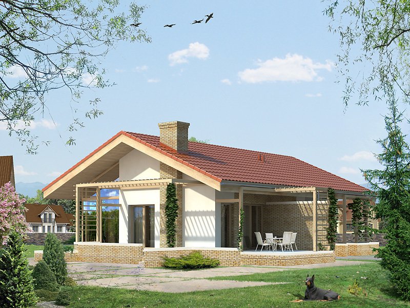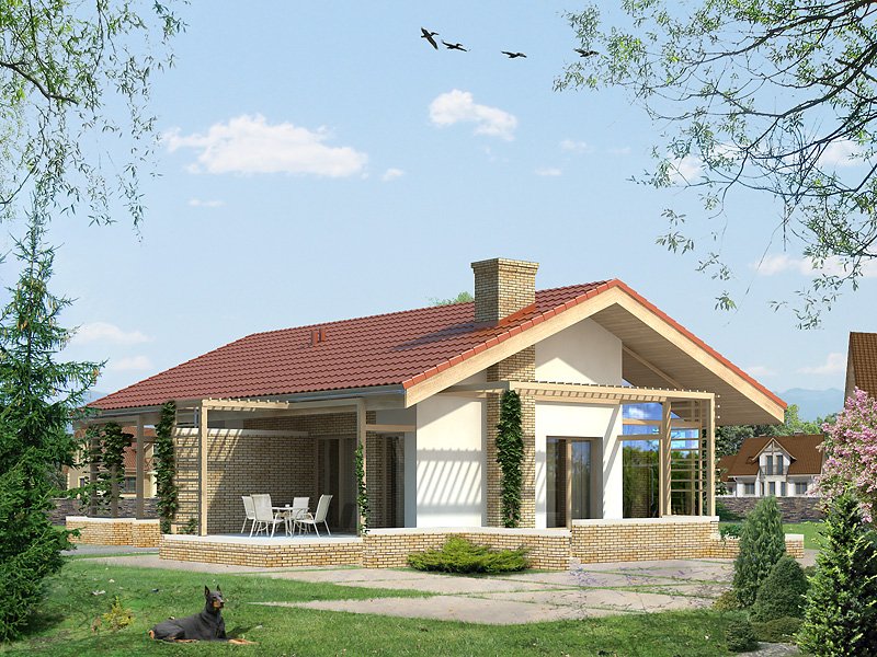 Parterowy dom jednorodzinny o czystym układzie funkcjonalnym z wyraźnym podziałem na część dzienną i nocną. Przeznaczony dla 4-osobowej rodziny. Duża część dzienna wzbogacona doprojektowaną oranżerią, otwarta na otaczającą przestrzeń. Głównym założeniem projektu było połączenie i przenikanie się wnętrza domu z otoczeniem poprzez zaprojektowanie szeregu murków i pergoli. Dom zaprojektowany w technologii Multi-Comfort z zastosowaniem produktów marki Saint-Gobain łączy unikalne właściwości produktów z rozsądną ceną. Standard Multi-Comfort oznacza szereg korzyści, takich jak: niskie koszty ogrzewania, komfort termiczny, akustyczny, dobra jakość powierza, bezpieczeństwo przeciwpożarowe (klasa A1). Wszystko to jest możliwe za sprawą zastosowanych w projekcie sprawdzonych materiałów znanych i cenionych marek: Isover, Weber, Rigips, Glassolutions. Produkty Grupy Saint-Gobain są wytwarzane z naturalnych materiałów i posiadają deklaracje środowiskowe. W procesie eksploatacji budynki zaprojektowane w technologii Multi-Comfort posiadają niewielkie zapotrzebowanie na energię pierwotną. Więcej informacji o domach w standardzie Multi-Comfort: www.multi-comfort.pl
