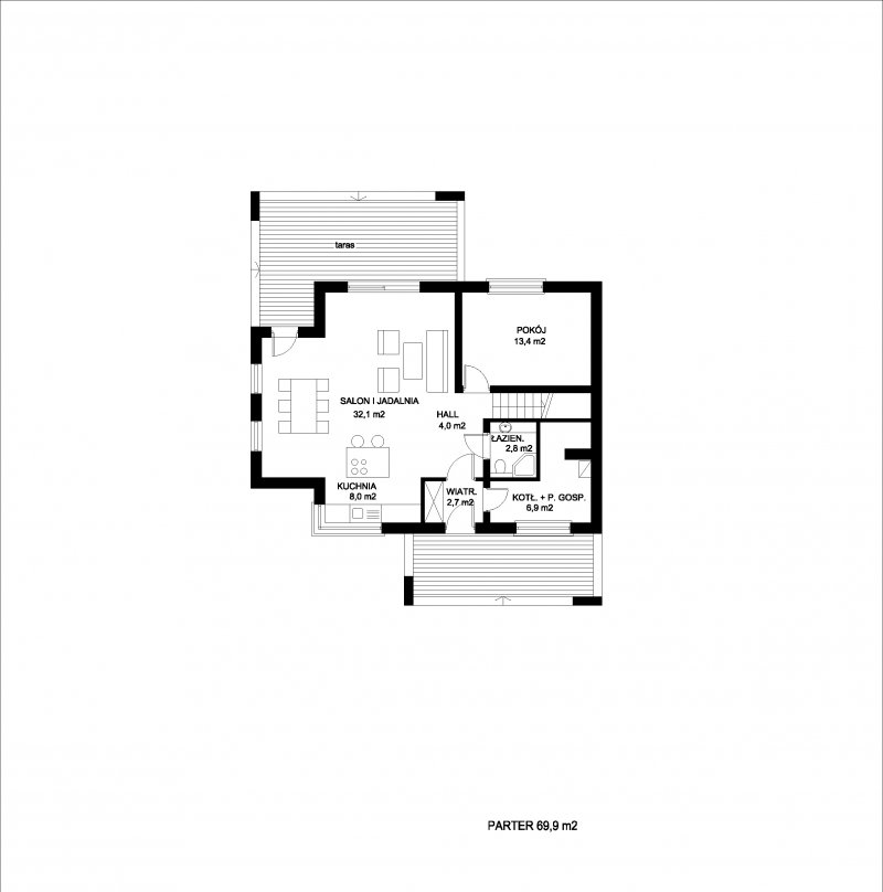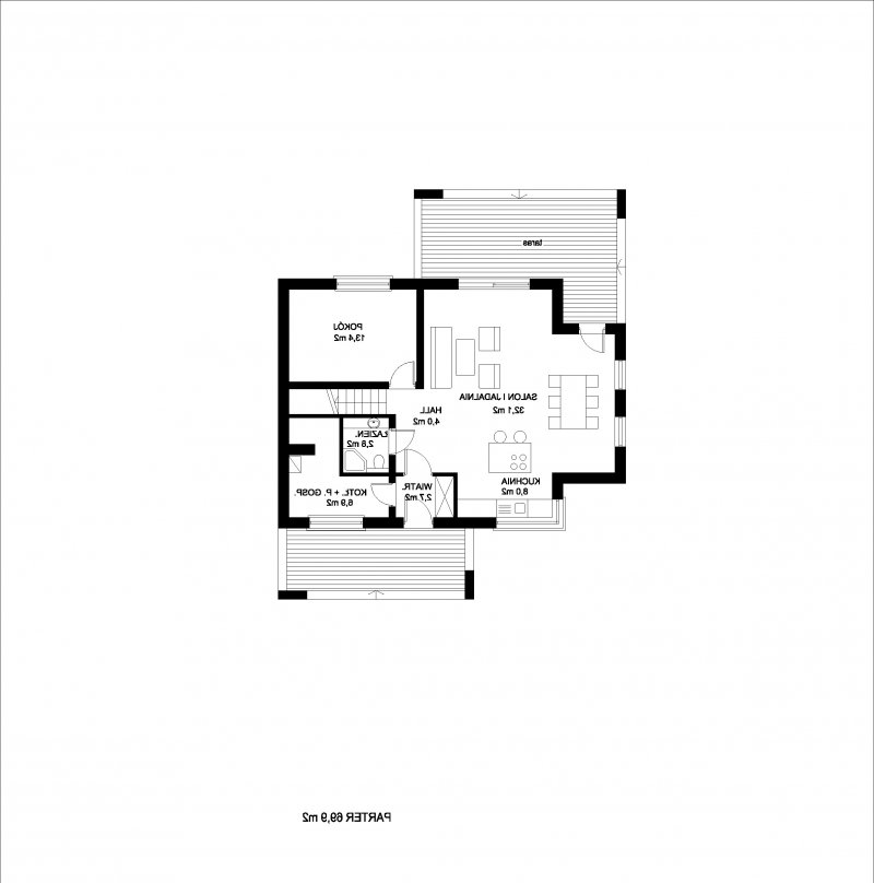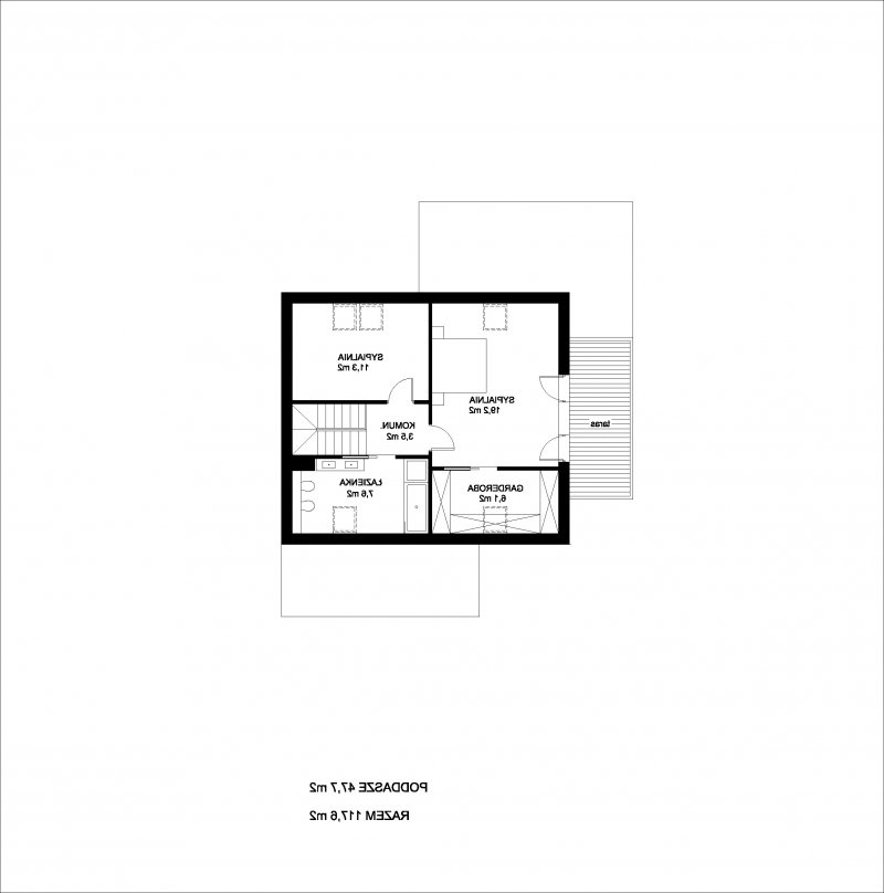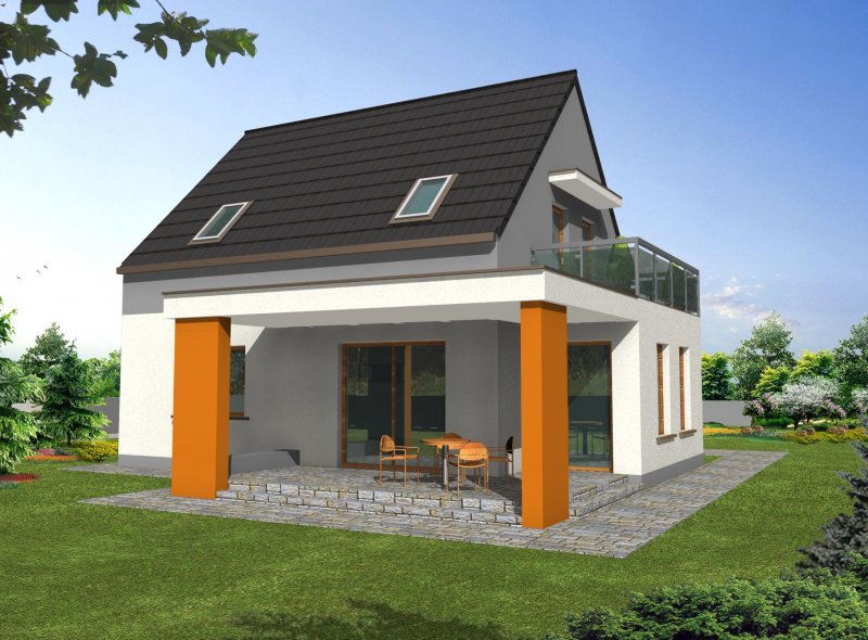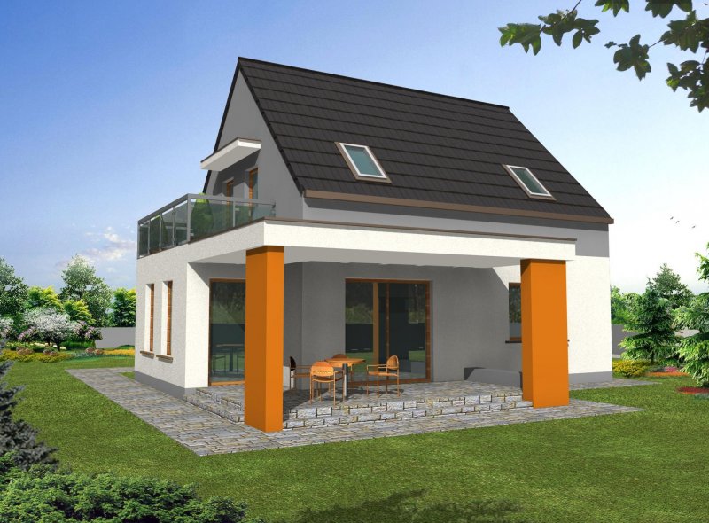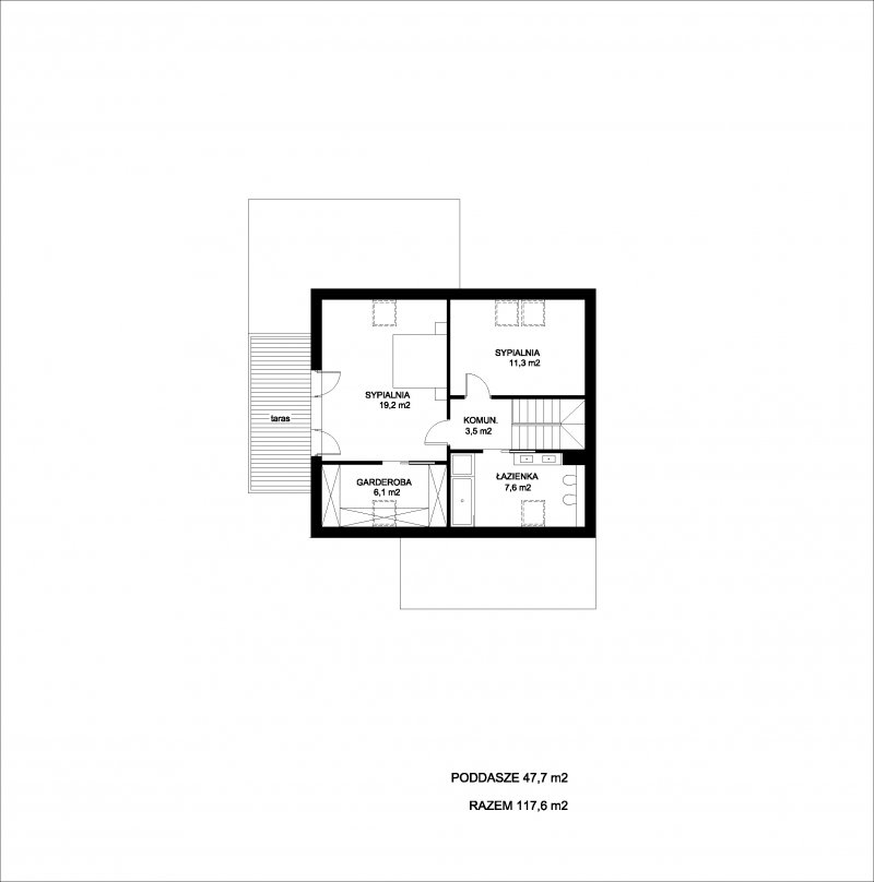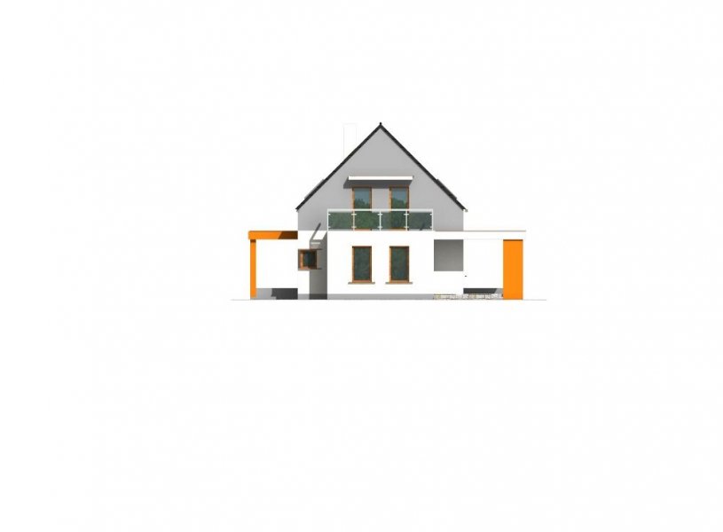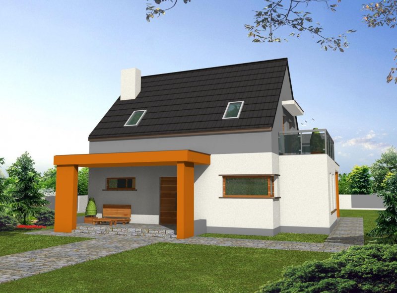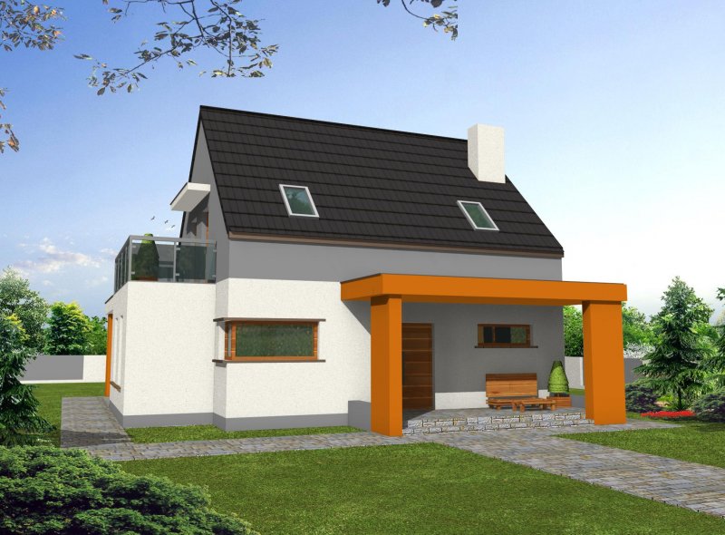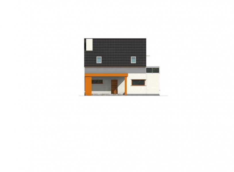 Bardzo wygodny, funkcjonalny parterowy dom z użytkowym poddaszem, przeznaczony dla rodziny o schemacie 2+ 1 lub 2+2. Na parterze znajduje się wiatrołap, kotłownia z pomieszczeniem gospodarczym, hall, otwarta kuchnia, jadalnia, salon, wc i gabinet , który może pełnić rolę pokoju gościnnego. Z salonu i jadalni można dostać się na duży, zadaszony taras ogrodowy. Na poddaszu znajdują się: duża sypialnia rodziców z własną garderobą i dużym balkonem, druga wygodna sypialnia, ogólnodostępna łazienka i komunikacja. Funkcjonalność i prostota rozwiązań, przy jednoczesnym nowoczesnym wyglądzie domu sprawiają, że właściciele będą zadowoleni z posiadania pięknego domu a ich kieszeń nie ucierpi.