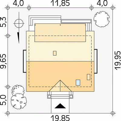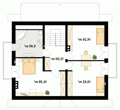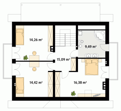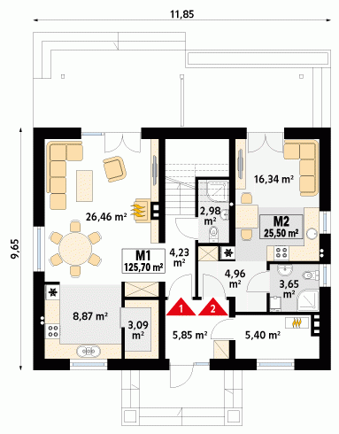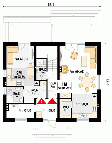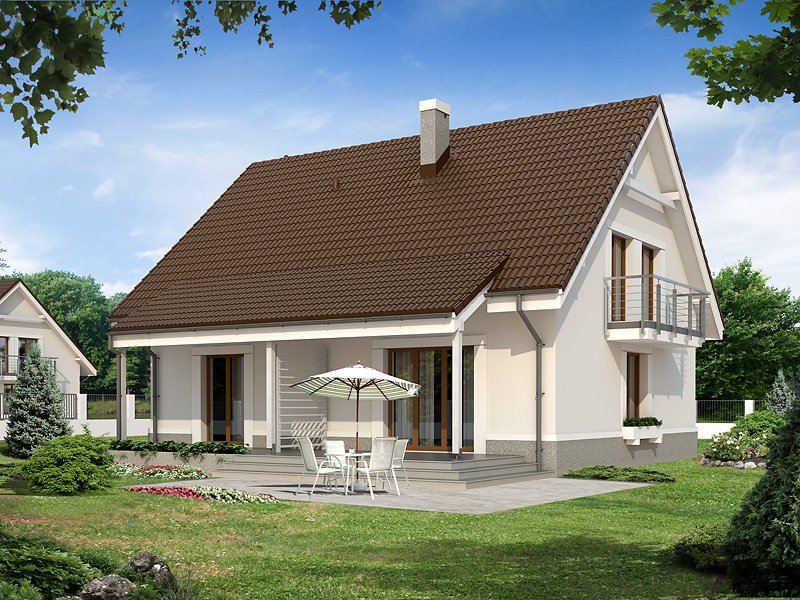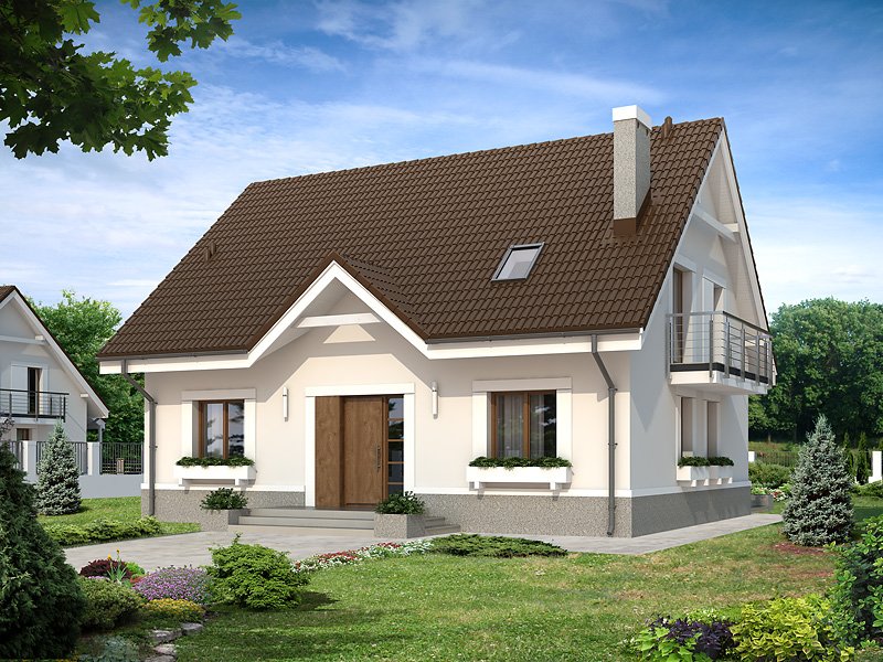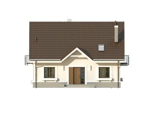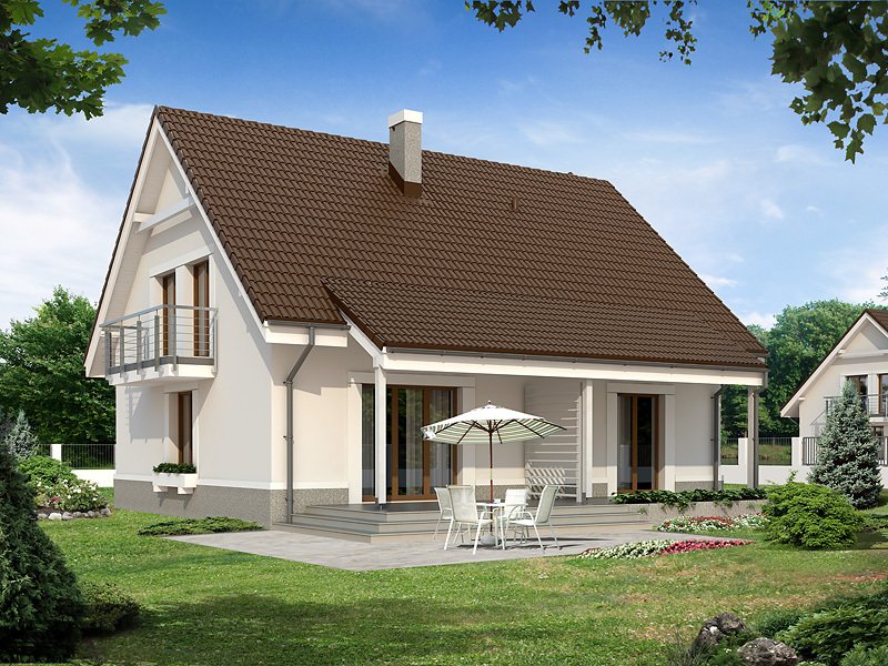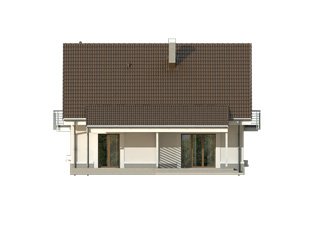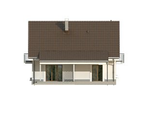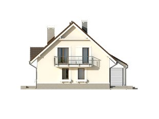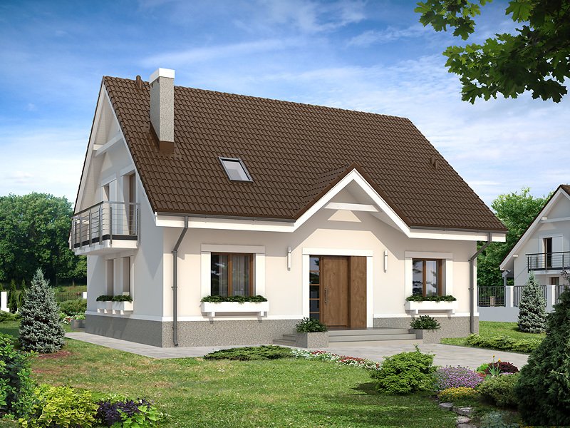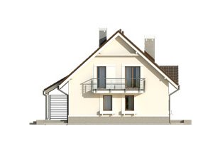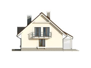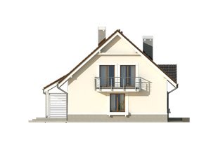 Nieduży dom dwurodzinny, parterowy z użytkowym poddaszem. W prostej bryle zaprojektowano dwa mieszkania ze wspólną kotłownią. Jedno zajmuje mniejszą część parteru domu a drugie większą oraz poddasze dostępne z klatki schodowej. Pomimo niewielkich gabarytów dom zapewni wygodę 4-osobowej rodzinie i da możliwość dowolnego wykorzystania drugiego lokalu.
