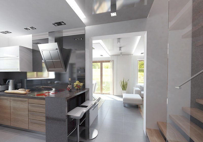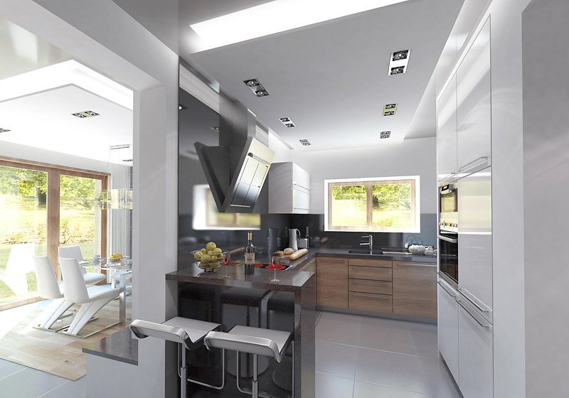Ściany: 2-warstwowe - pustak ceramiczny + styropian, Stropy: żelbetowe, wylewane, Dach: blacha na rąbek stojący Classic Ruukki, kąt nachylenia 40°