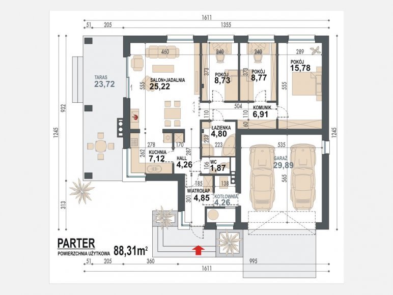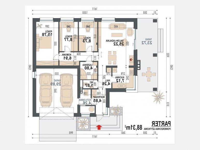 Projekt ten, podobnie jak jego wersja jednogarażowa, cechuje się nowoczesnym wyglądem i funkcjonalnością. Dzięki rozszerzeniu bryły budynku pod garaż dwustanowiskowy wnętrze domu staje się jeszcze bardziej przestronne i zyskuje dodatkową sypialnię. Charakterystycznym elementem projektu MAJA 2G jest rozłożysty, dwuspadowy dach. W wersji dwugarażowej zyskuje on zupełnie nowe proporcje. Strefa dzienna dostępna z holu głównego obejmuje duży salon (otwarty po II kondygnację) z wyjściem na taras, kuchnię oraz ogólnodostępne wc i łazienkę. W strefie nocnej przybywa dodatkowa sypialnia dzięki czemu w MAJI 2G może wygodnie mieszkać nawet 5 osobowa rodzina. Pomieszczenia strefy nocnej zostały dyskretnie oddzielone od holu i salonu drzwiami przesuwnymi - sypialnia dla rodziców i 2 sypialnie dla pozostałych domowników. W korytarzu zaprojektowano opuszczane schody strychowe.