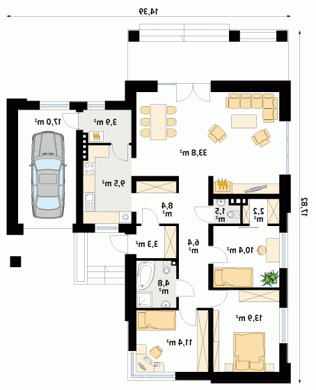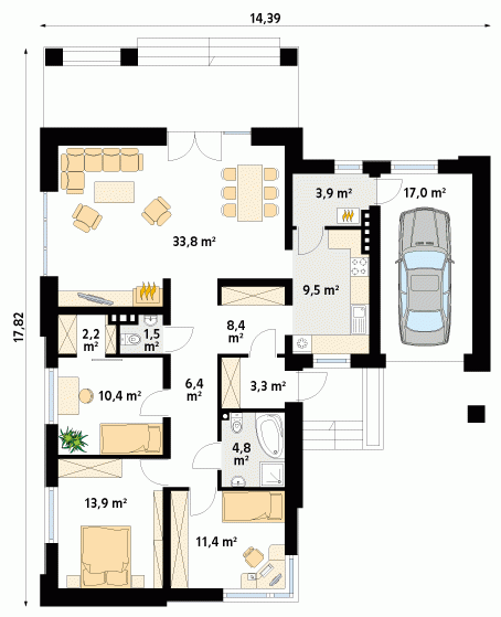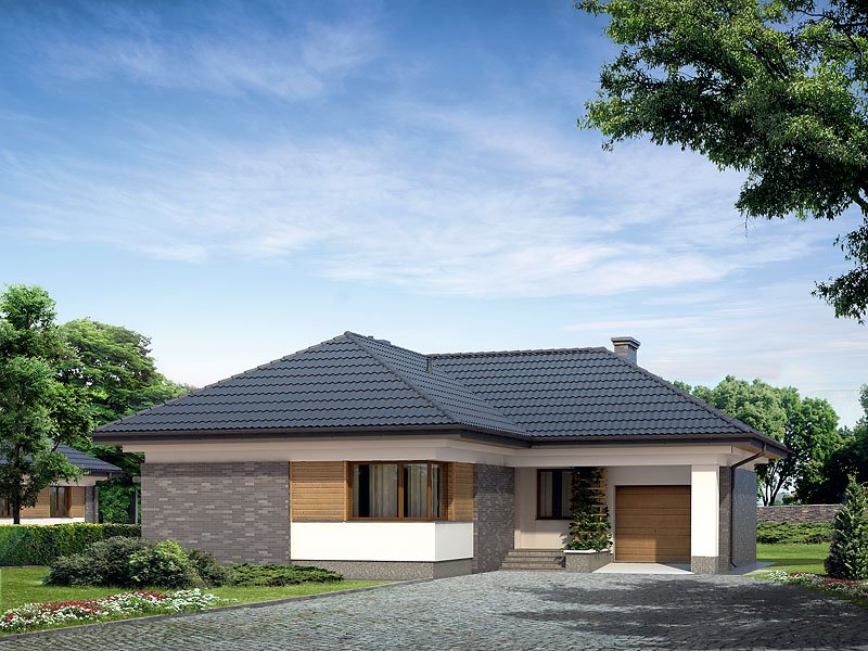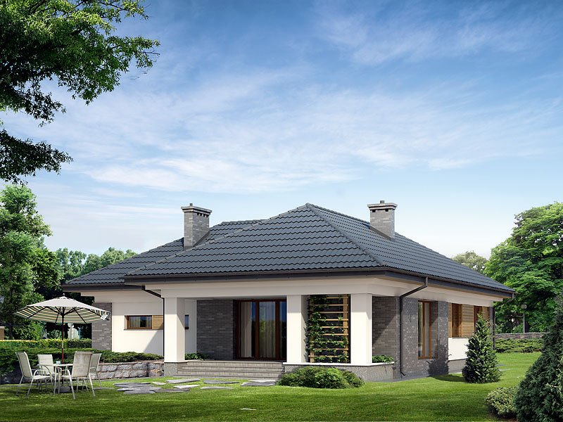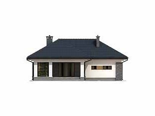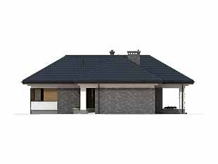 Jednorodzinny dom parterowy, niepodpiwniczony, przeznaczony dla 4-osobowej rodziny. Przestronna, otwarta część dzienna została dodatkowo wzbogacona o zadaszony taras. W części nocnej przewidziano trzy sypialnie, w tym jedną z garderobą oraz łazienkę. Wyraźny podział na części dzienną, nocną i gospodarczą.