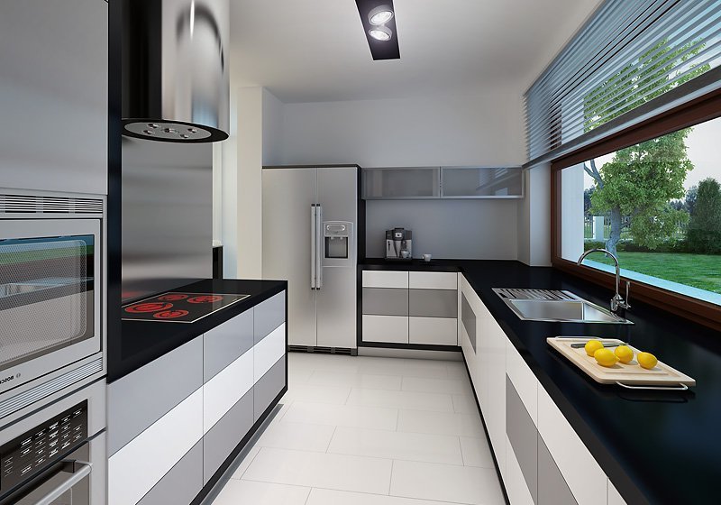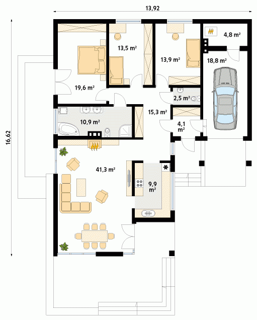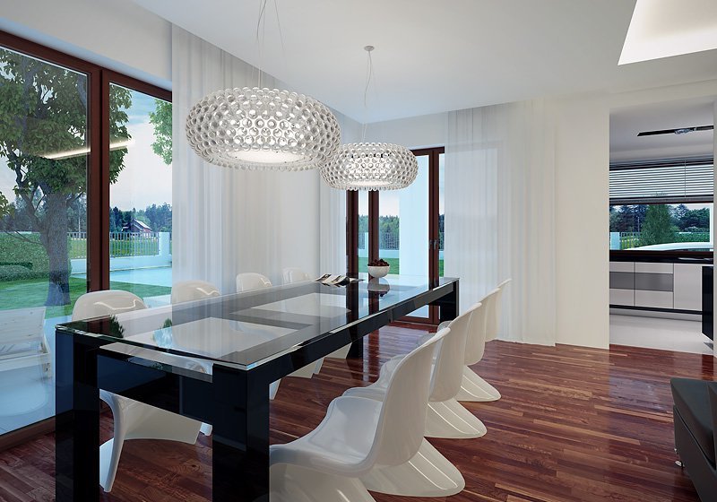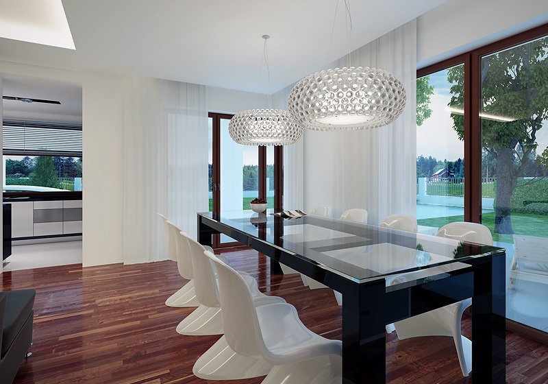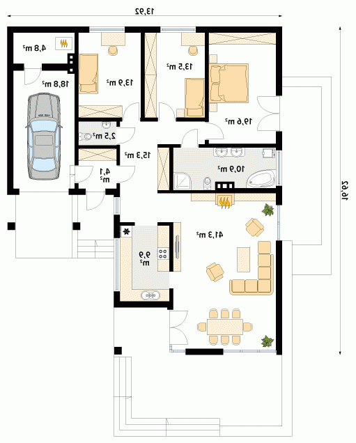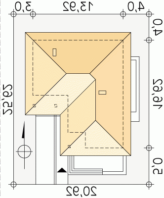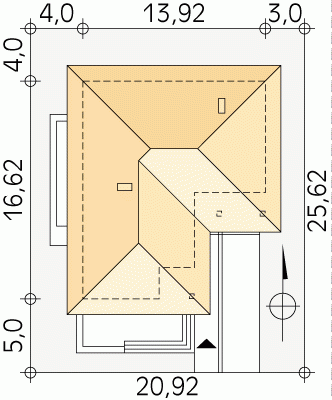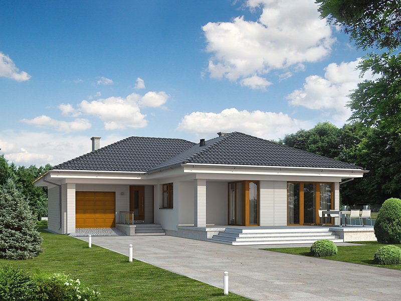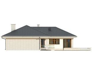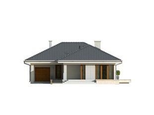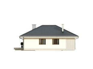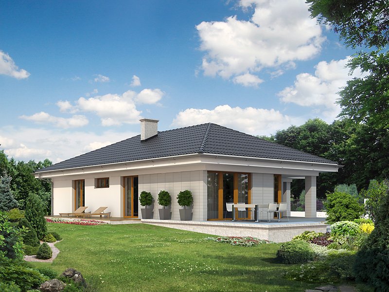 Jednorodzinny dom mieszkalny, parterowy, niepodpiwniczony, przeznaczony dla 4-osobowej rodziny. Wyraźny podział na część dzienną, nocną i gospodarczą. Wejście od południa. Częściowo zadaszony taras.