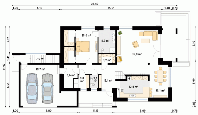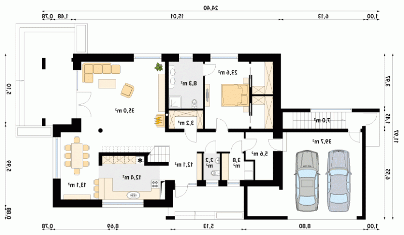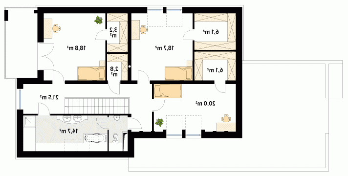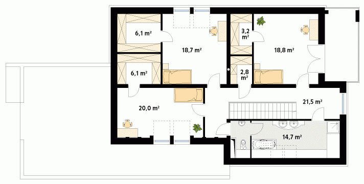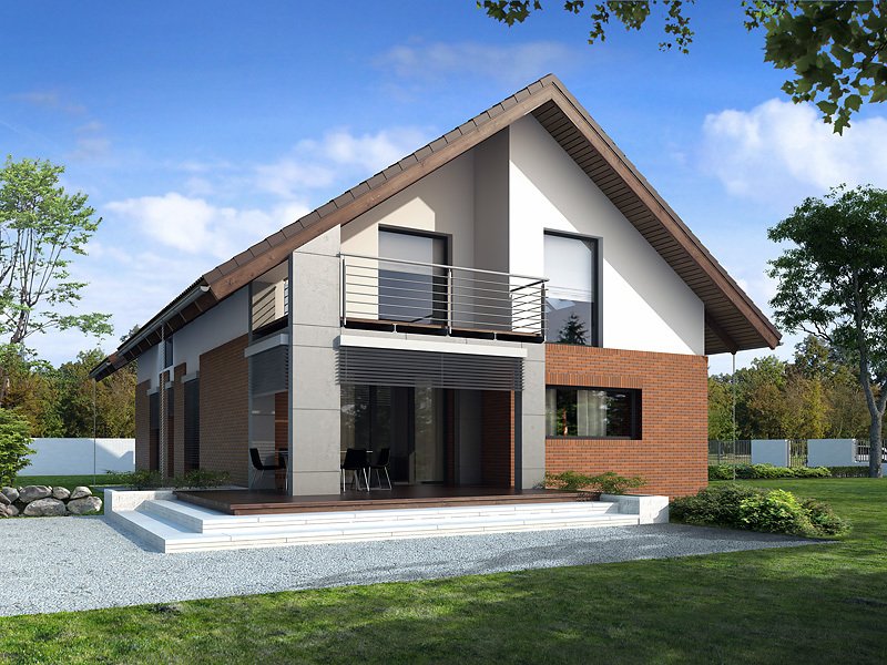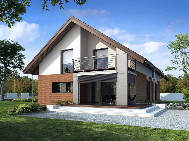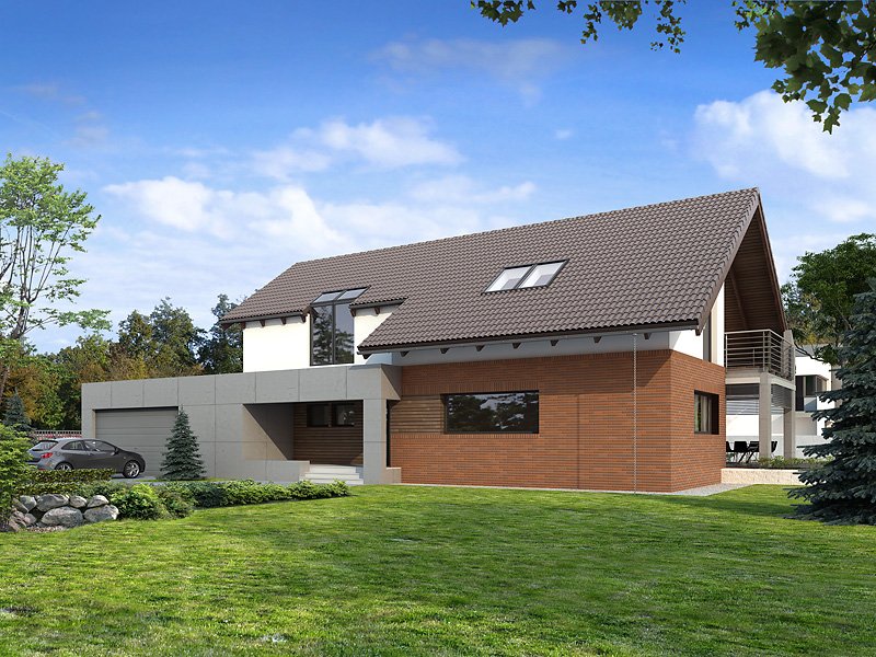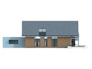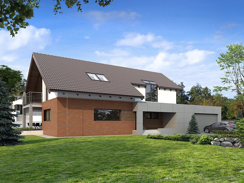 Nowoczesny dom jednorodzinny, z użytkowym poddaszem, podpiwniczony. W bryle budynku znajduje się dwustanowiskowy garaż. Projekt jest dedykowany osobom, które pragną zamieszkać w nowoczesnym, energooszczędnym domu, idealnym dla 5 – 6-osobowej rodziny. Projekt urzeka niebanalną stylistyką jak również bardzo ciekawym układem pomieszczeń. Na parterze znajduje się obszerny salon oraz częściowo otwarta na jadalnię kuchnia. Dodatkowo na parterze znajduje się sypialnia gospodarzy z osobną łazienką oraz dwiema niezależnymi garderobami. Przestrzeń domu potęguje duża ilość przeszkleń. Na poddaszu zaprojektowano trzy sypialnie, z których każda ma własną garderobę. Warto również zwrócić uwagę na ciekawie zaaranżowaną łazienkę. Cześć pomieszczeń gospodarczych w tym kotłownia może znaleźć swoje miejsce w piwnicy. Projekt jest ciekawą alternatywą dla osób, które chcą zamieszkać w domu o niebanalnej stylistyce.