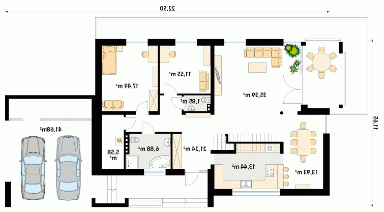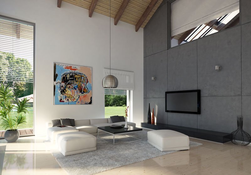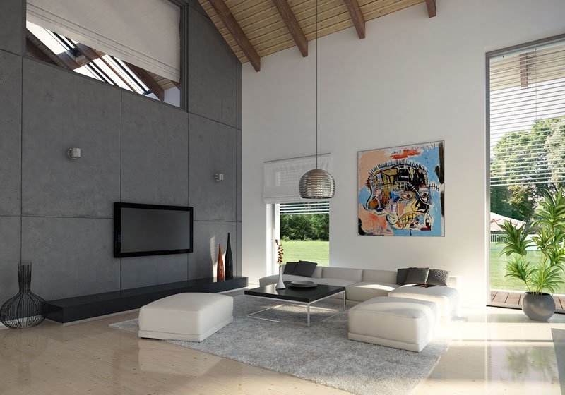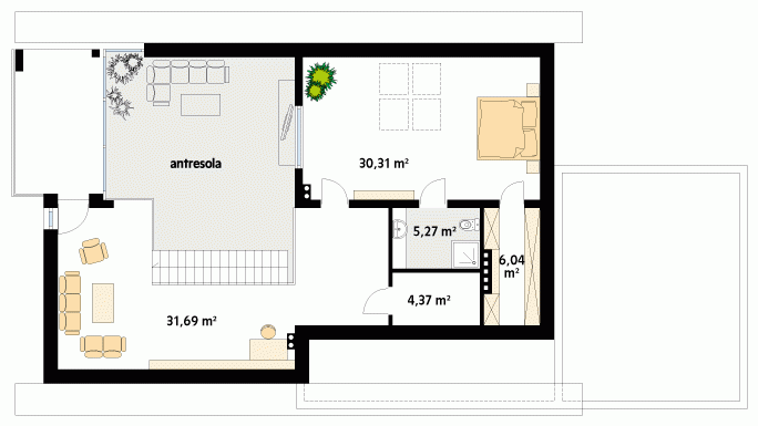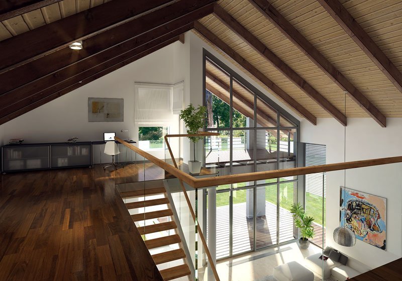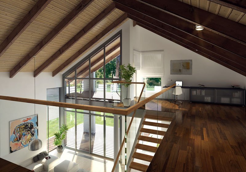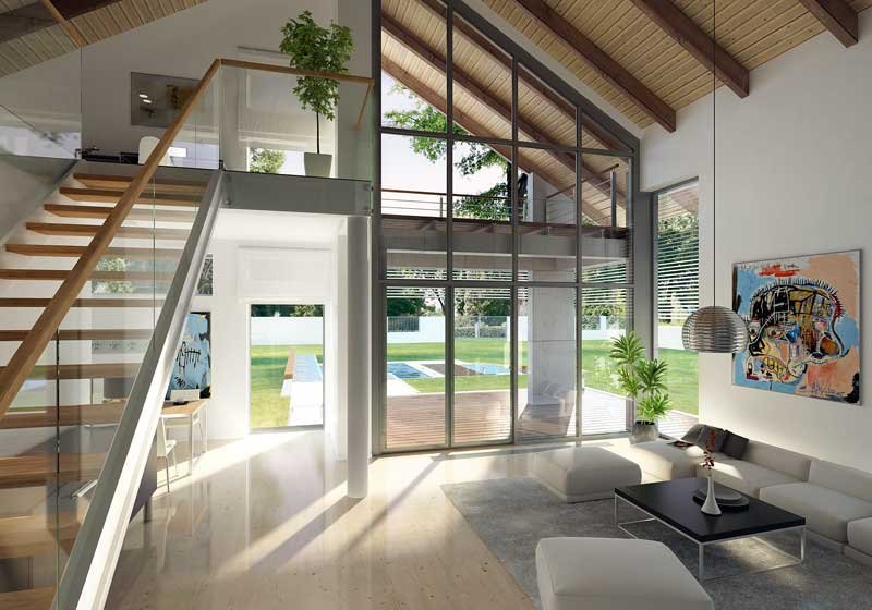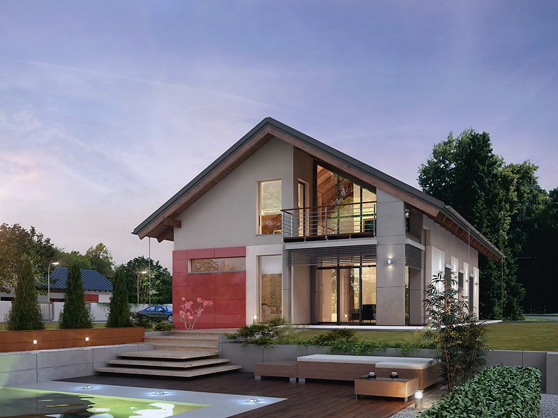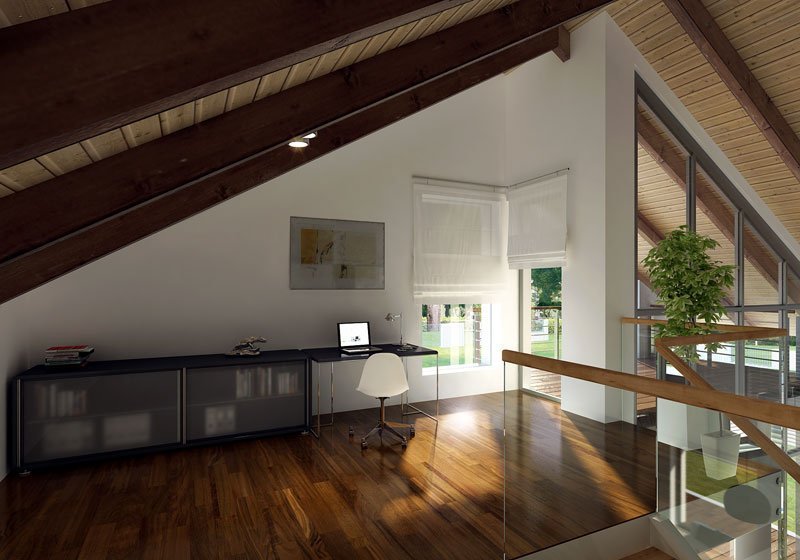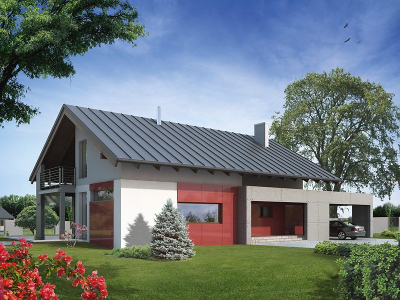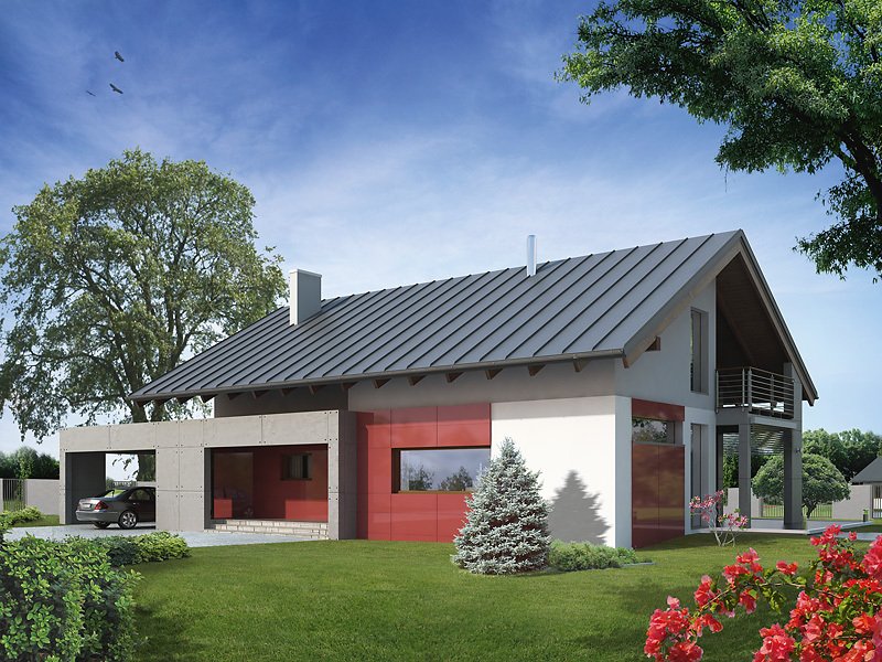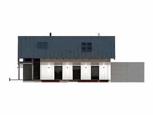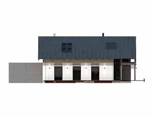 Dom jednorodzinny, parterowy z użytkowym poddaszem, przeznaczony dla 4 – 5-osobowej rodziny. Nowoczesny, o prostej bryle zamkniętej dwuspadowym dachem. Niebanalny układ wnętrza z pustką nad salonem i dużą antresolą. Duże, efektowne przeszklenia.