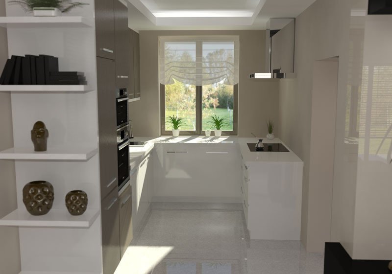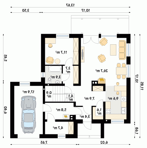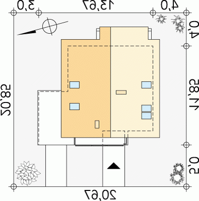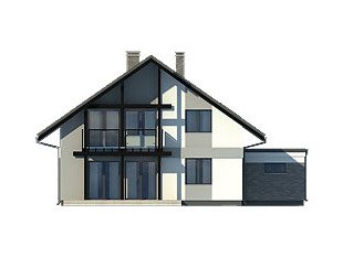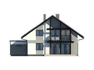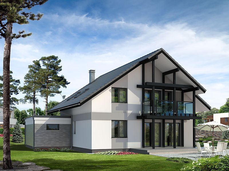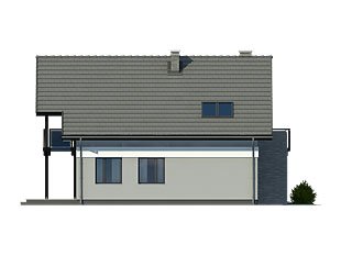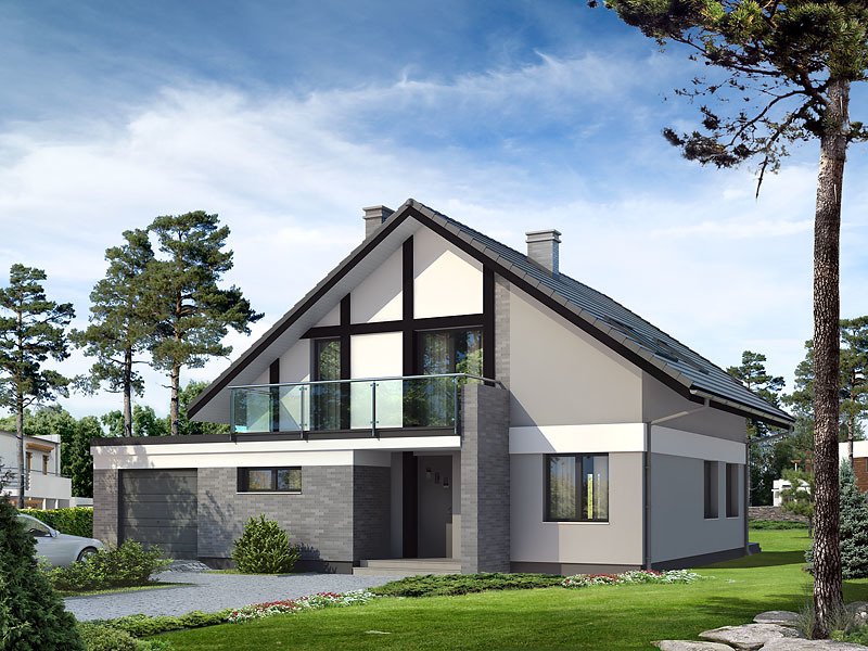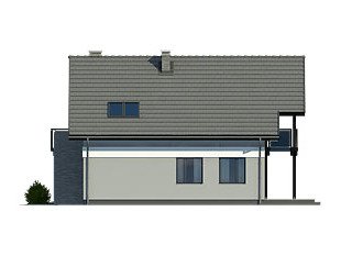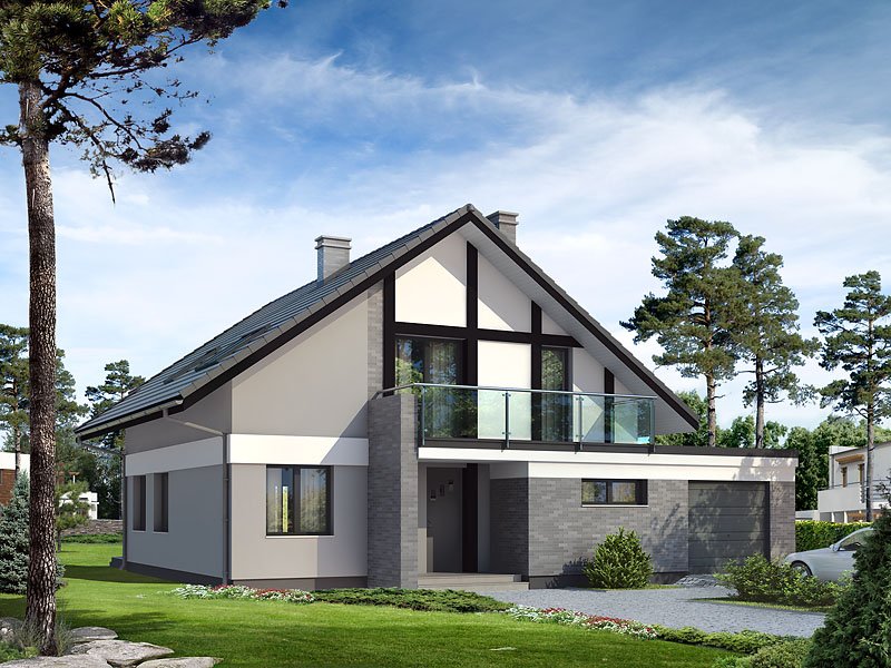Budynek jednorodzinny przeznaczony dla rodziny 4 – 5-osobowej. Zwarta bryła domu oparta na kwadracie wzbogacona została dostawioną bryłą garażu i konstrukcją balkonu zadaszającego wejście główne. Ażurowa drewniana konstrukcja balkonu od strony ogrodowej decyduje o charakterze domu, a prosty dwuspadowy dach nabiera lekkości dzięki wysuniecu jego połaci nad tę konstrukcję. Wygodę użytkowania gwarantują liczne pomieszczenia dodatkowe: na parterze dwa pomieszczenia gospodarcze i spiżarnia, na poddaszu odrębna pralnia i garderoba.