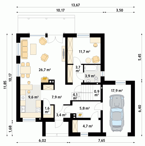 Ściany: 2-warstwowe - pustak ceramiczny + styropian, Stropy: żelbetowe, Dach: dachówka, kąt nachylenia 35°