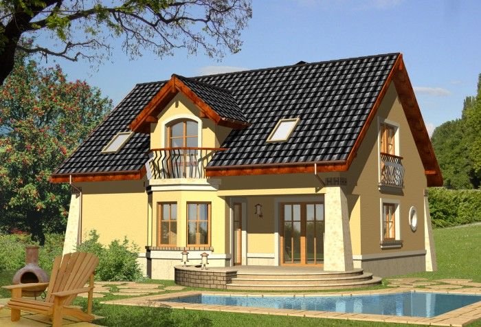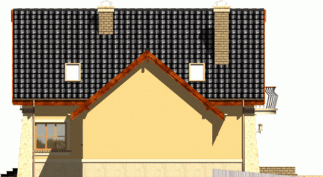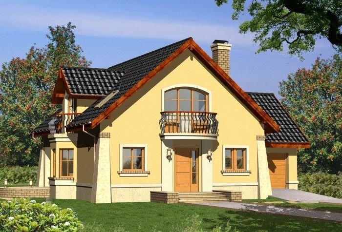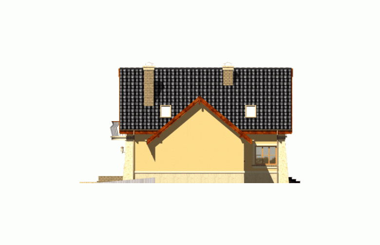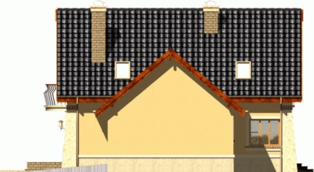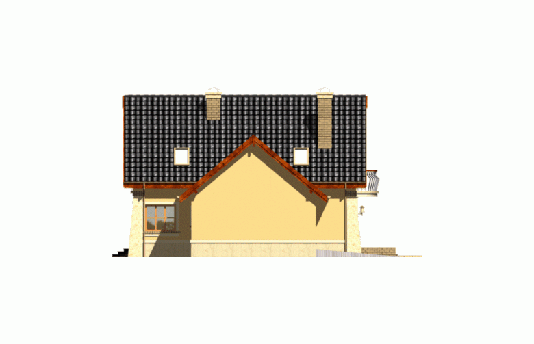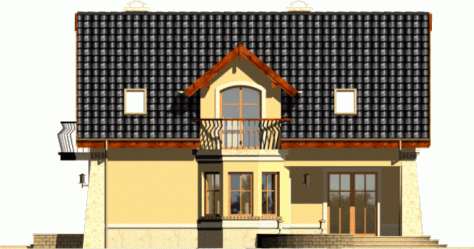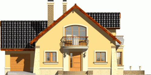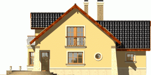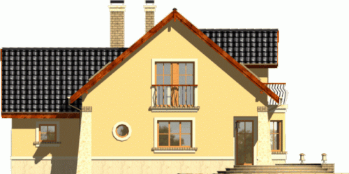 Klasyczny dom z dachem dwuspadowym i ścianą szczytową od strony wejścia z bryłą garażu dostawioną z boku. Uwagę zwracają harmonijne fasady z oknami ujętymi w opaski oraz podkreślone poprzez balkon powyżej wejście główne. Szczególnie atrakcyjny jest tylny narożnik domu, gdzie taras łączy się z wykuszem jadalni w bocznej elewacji budynku.