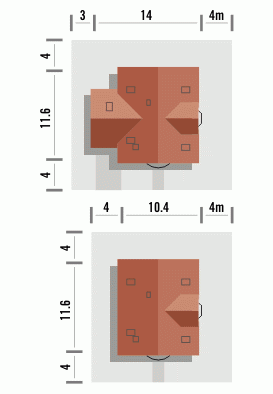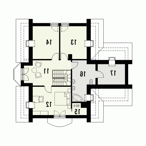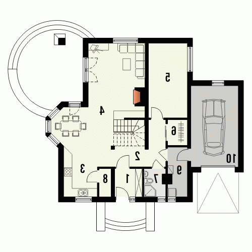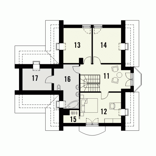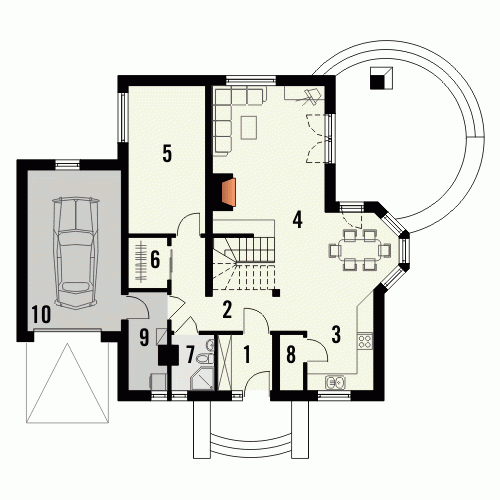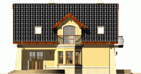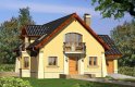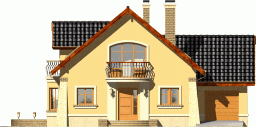 Budynek niepodpiwniczony piętrowy z garażem. Na parterze zaprojektowano pokój dzienny, jadalnię z atrakcyjnym wykuszem, kuchnię ze spiżarką oraz wydzielony pokój, pomieszczenie gospodarcze i łazienkę. Schody drewniane widoczne z hallu i jadalni. Na poddaszu znajdują się trzy pokoje, duża łazienka oraz hall z dużym oknem balkonowym. Dokumentacja dostępna również w odbiciu lustrzanym.