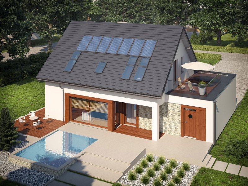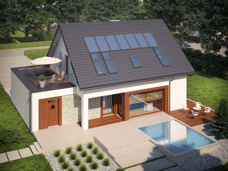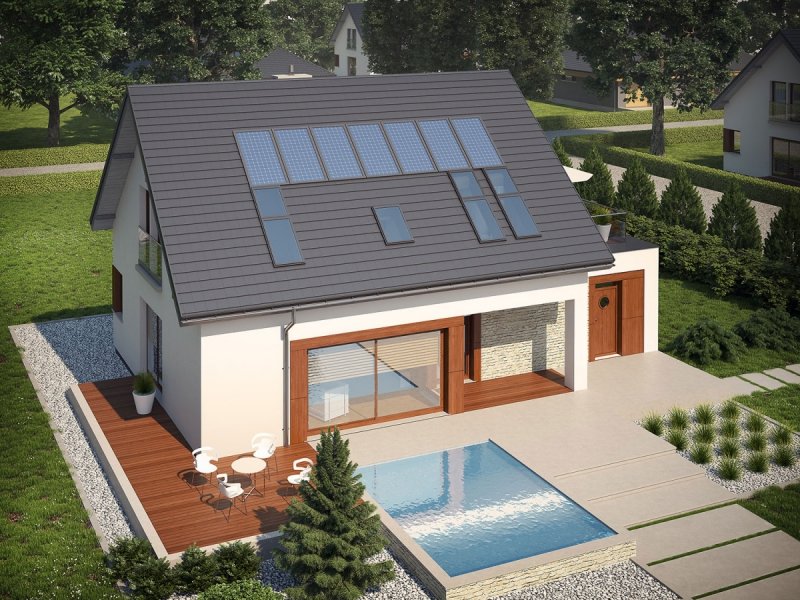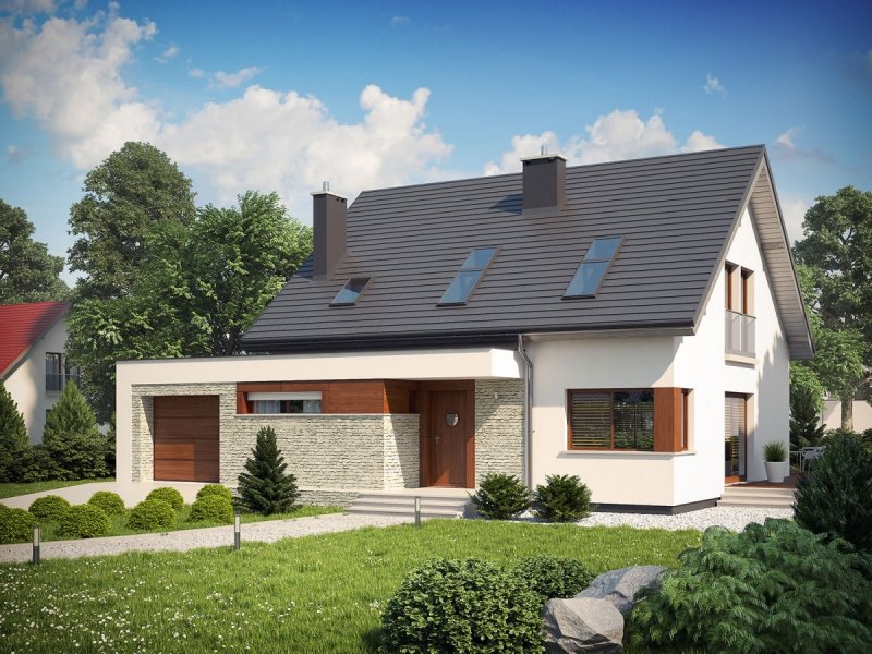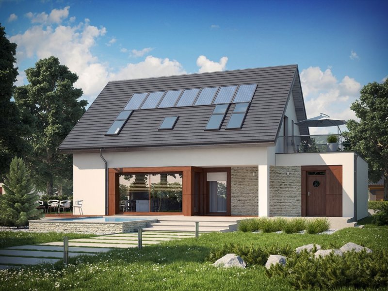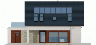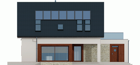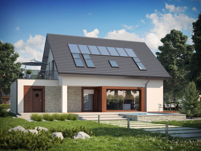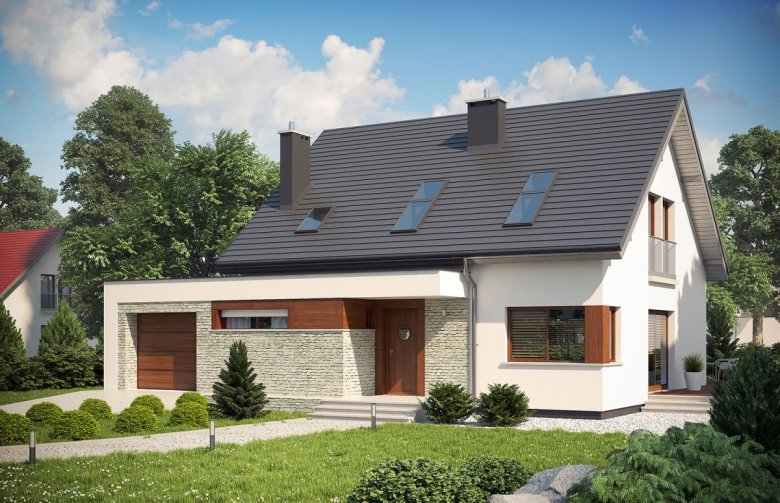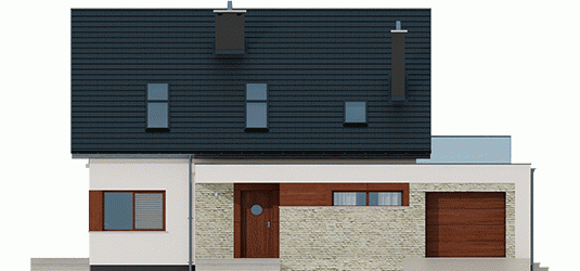Santiago G1 ENERGO to dom, który spełni oczekiwania miłośników nowoczesnego designu w parze z funkcjonalnością. Piękna elewacja ubiera bryłę w atrakcyjne ramy. Ascetyczną biel tynku wzbogacono dekoracyjnym kamieniem oraz elementami drewna w kolorze ciemnej wiśni, które dodaje formie ciepła i harmonijnie koresponduje z barwą stolarki. Na szczególną uwagę zasługuje pomysłowo wykorzystana przestrzeń nad garażem, która spełnia się jako wygodny taras, dostępny z głównej sypialni. Dodatkowa strefa rekreacyjna zapewnia domownikom relaksujący klimat z widokiem na balsamiczną zieleń krajobrazu. W domu zaprojektowanym w zgodzie z aktualnymi trendami nie zabrakło dużych przeszkleń, które otwierają wnętrze na otoczenie, wykorzystują naturalną energię słoneczną i zapewniają optymalne doświetlenie pomieszczeń.